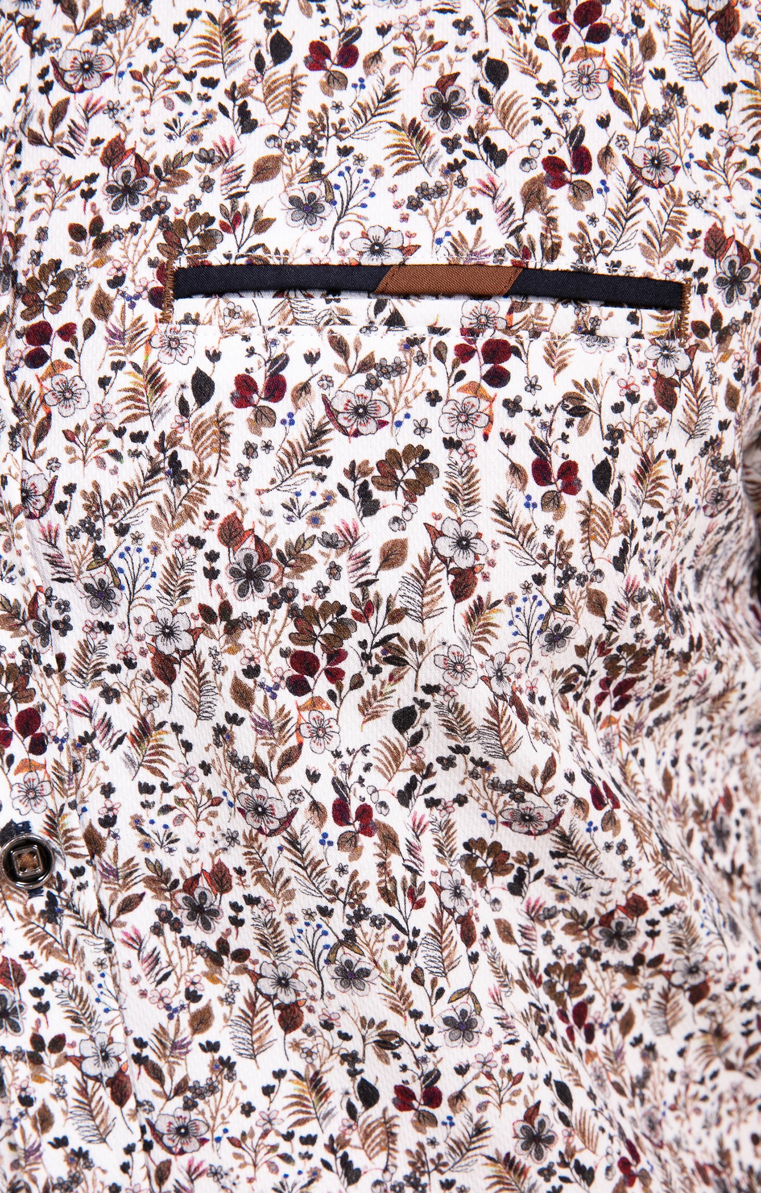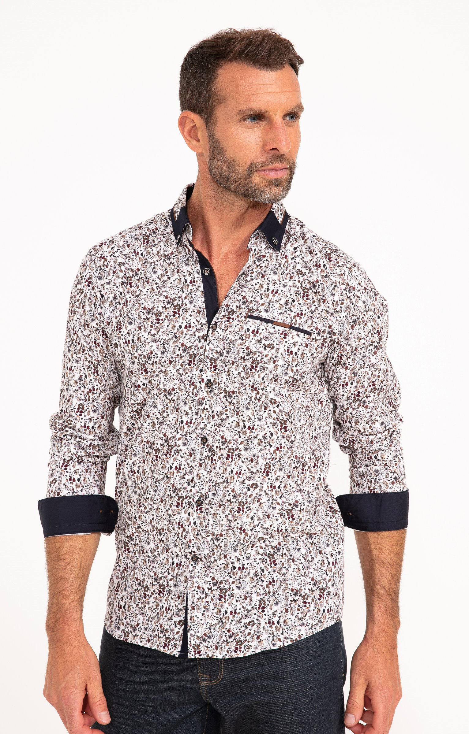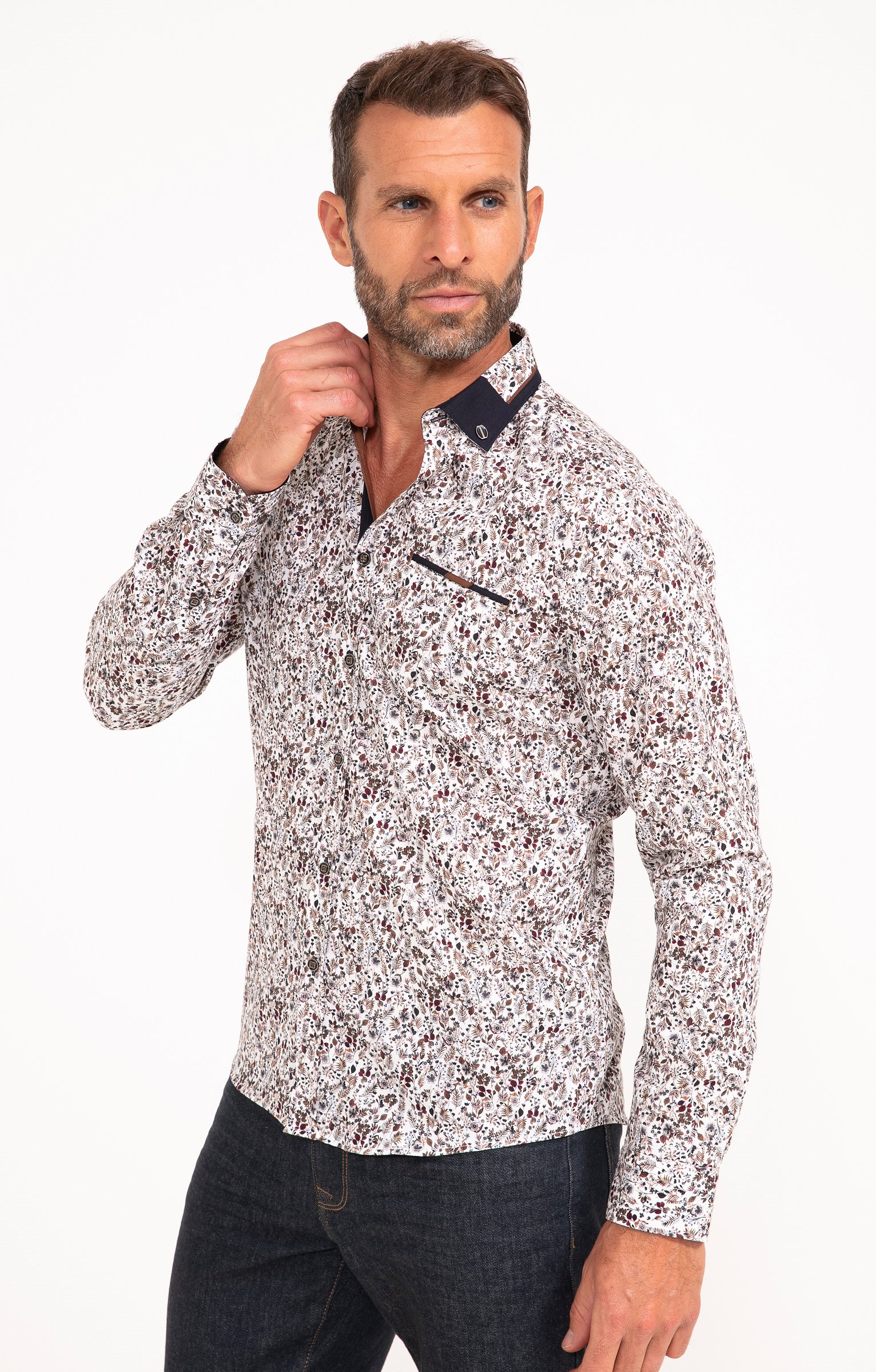Chemise à manches longues imprimée. Coupe ajustée. Manches longues avec poignets boutonnés. Col chemise uni et imprimé avec boutons fantaisie au niveau des pointes. Fermeture par des boutons fantaisie sur le devant. Une poche passepoilée sur la poitrine, avec passepoil bicolore. Imprimé à motif végétal sur l'ensemble du modèle. Découpe horizontale dans le haut du dos. Bas liquette.