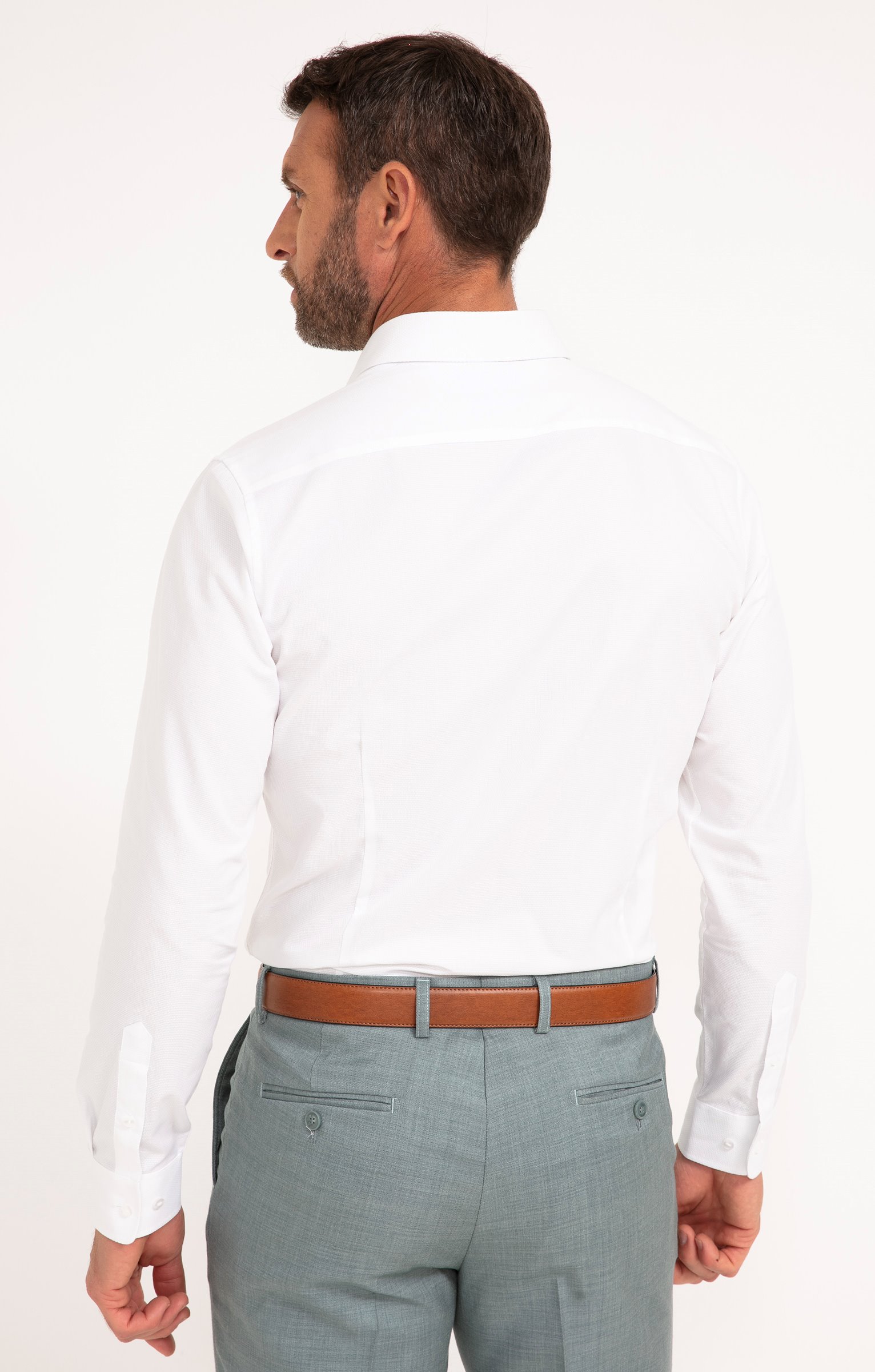 Chemise manches longues ajustée en coton. Coupe ajustée. Manches longues avec poignets boutonnés. Col chemise classique. Fermeture par des boutons nacrés discrets sur le devant. Une poche plaquée sur la poitrine. Coloris uni. Matière texturée à motifs géométriques. Découpe horizontale dans le haut du dos.