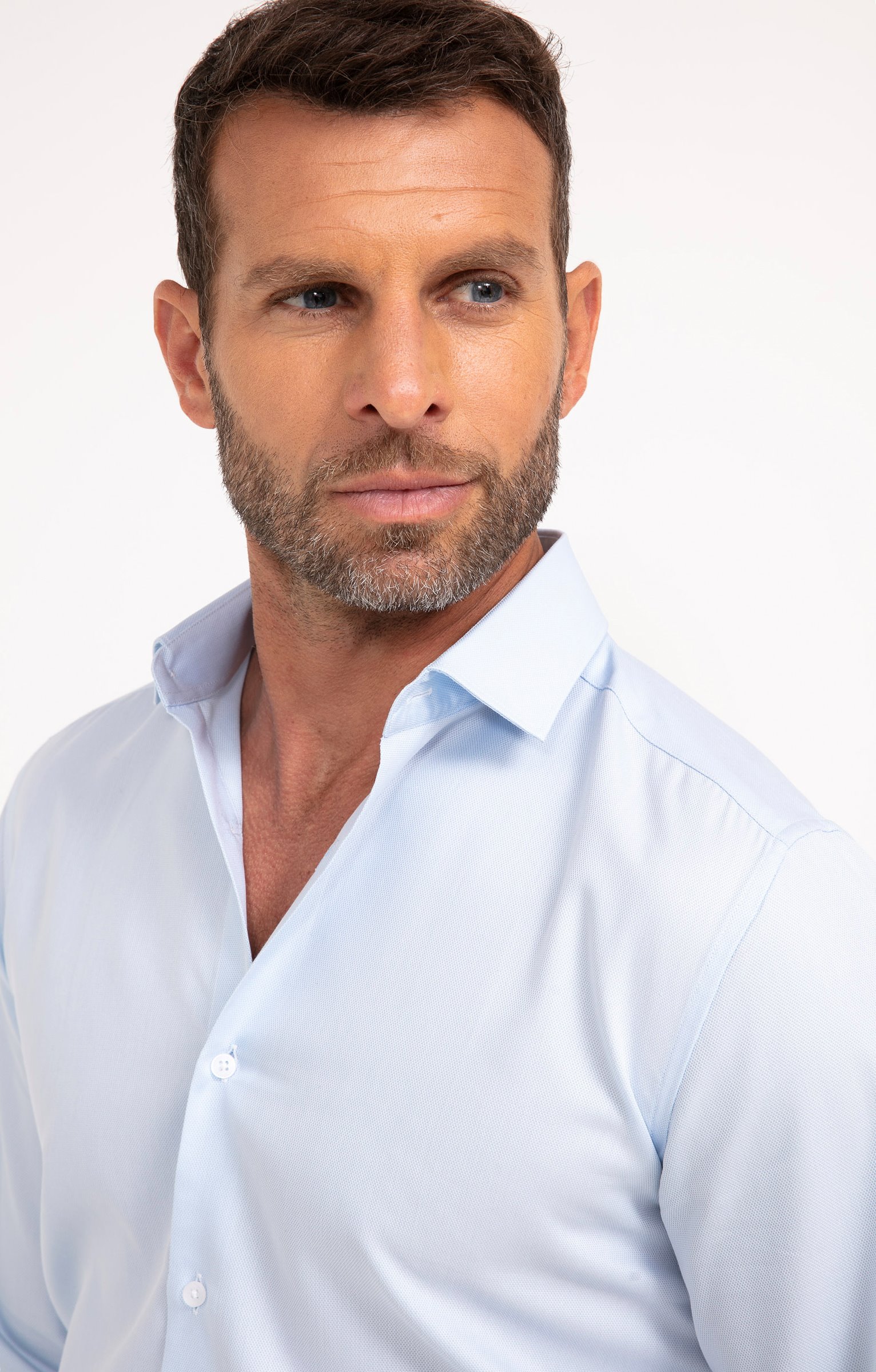Chemise manches longues ajustée. Coupe ajustée. Manches longues avec poignets boutonnés. Col chemise classique. Fermeture par des boutons nacrés discrets sur le devant. Mini motifs impression tissu uni. Découpe horizontale dans le haut du dos. Portez cette chemise de ville élégante avec un pantalon de costume.