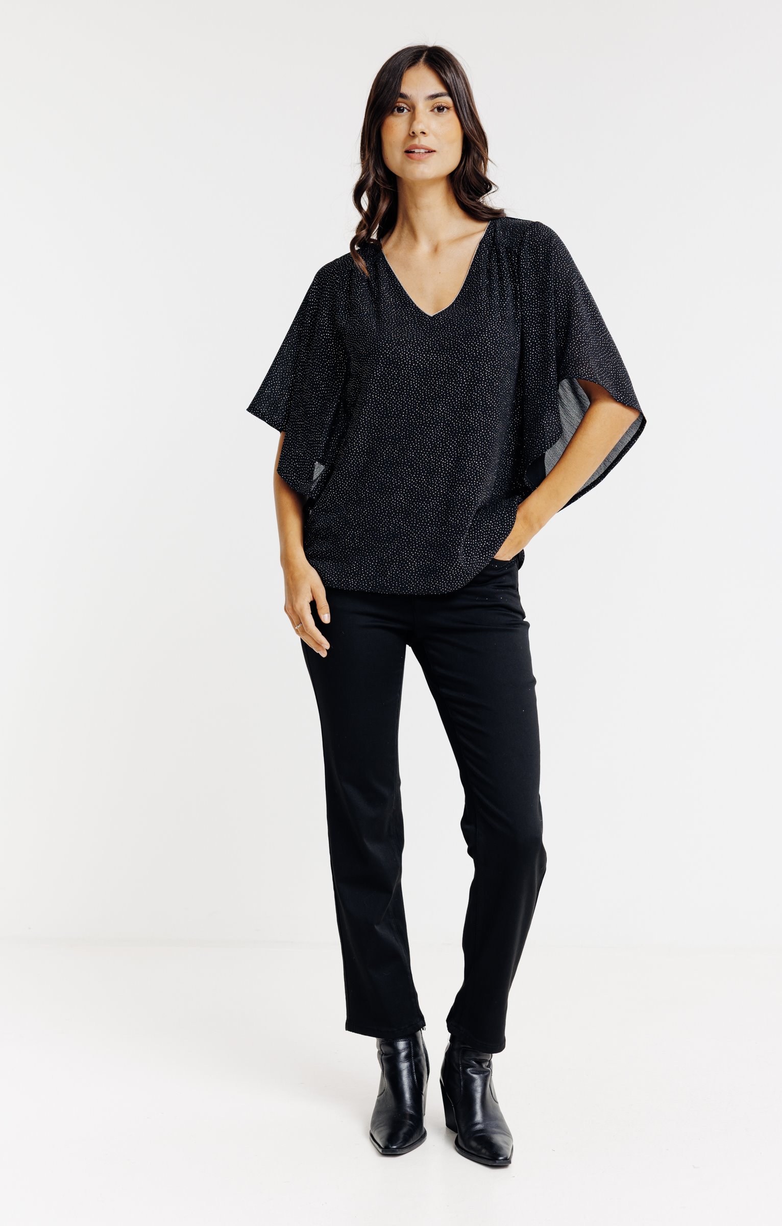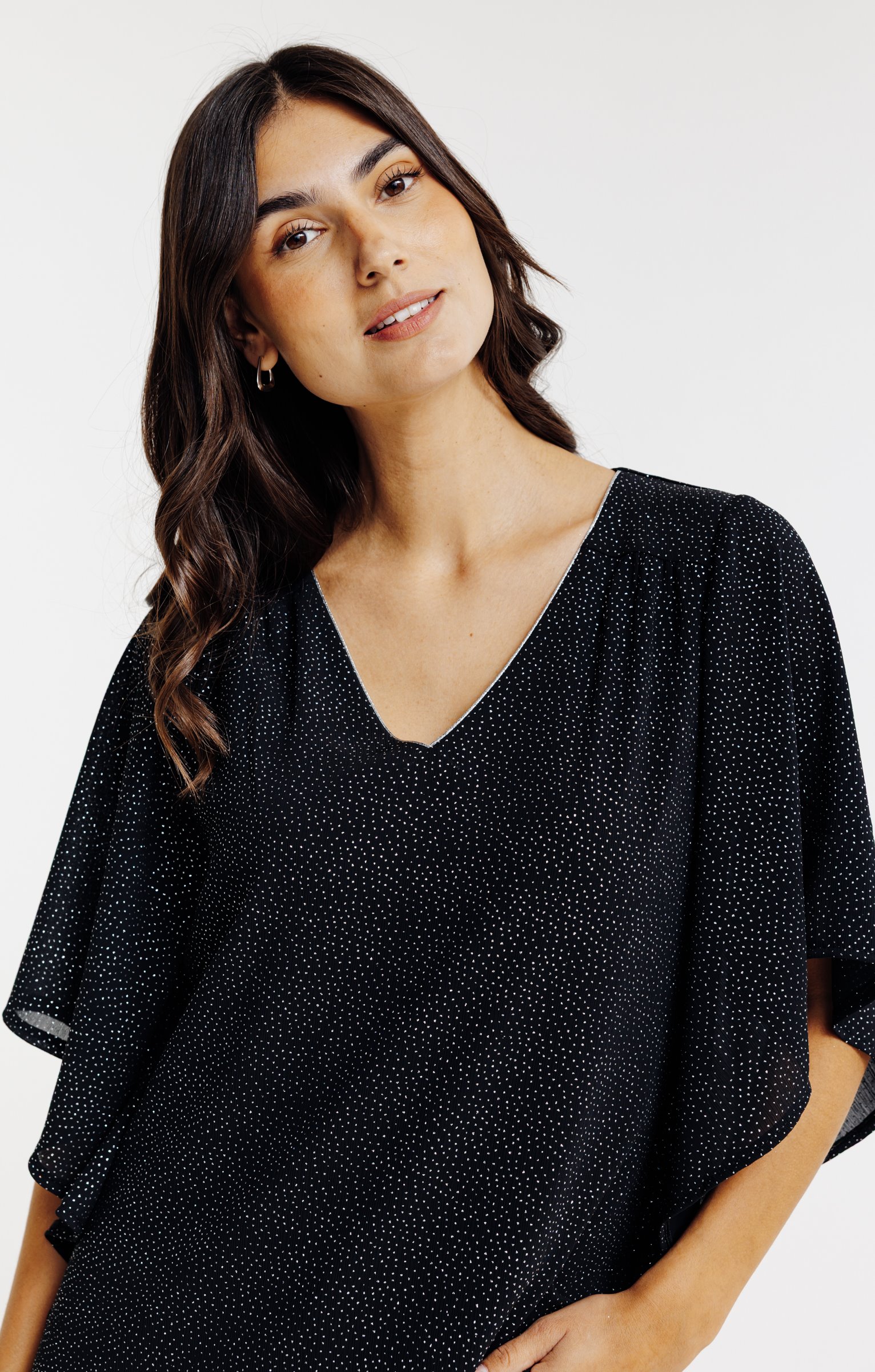 Tunique effet poncho en voile pointillé à manches courtes et col V passepoilé. Coupe droite forme poncho. Manches courtes amples et évasées. Col V. Motifs pointillés. Tissu en voile plissé. Doublure corps ton sur ton. Passepoil contrastant brillant en bordure de l'encolure. Couture avec fines fronces sous la ligne d'épaules. Surpiqûres discrètes en finition des manches et de la base. Base droite.