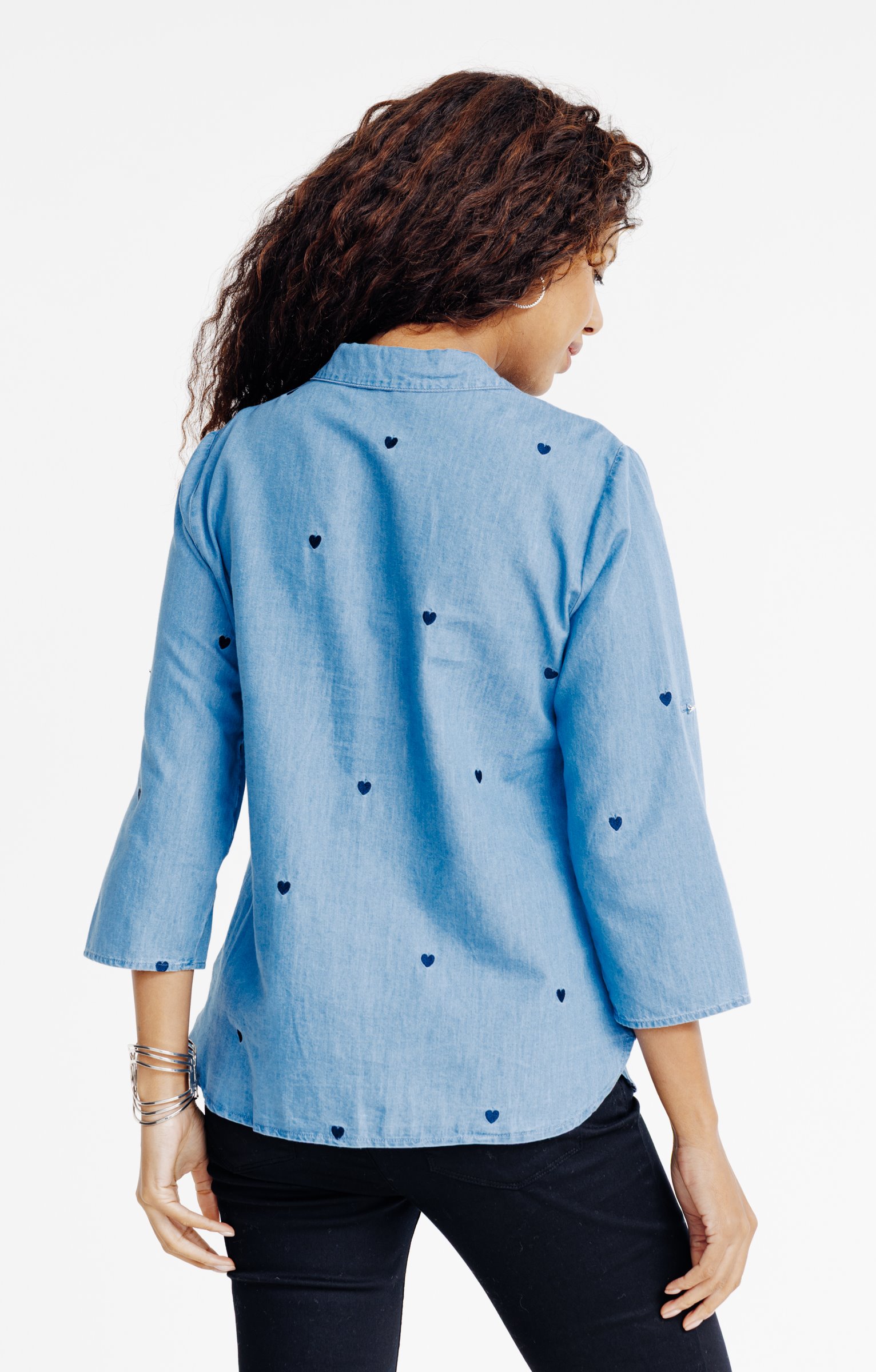 "Chemisier en jean à manches retroussables et cœurs brodés. Coupe droite. Manches 3/4 à remonter au moyen de pattes boutonnées. Emmanchures droites. Col classique mixé à un col V. Fermeture à boutons plats métalliques. 2 poches poitrine plaquées à rabat boutonné. Teinte unie. Tissu façon denim. Broderies cœurs sur toute la surface. Côtés légèrement incurvés. Composition contenant du lyocell.
