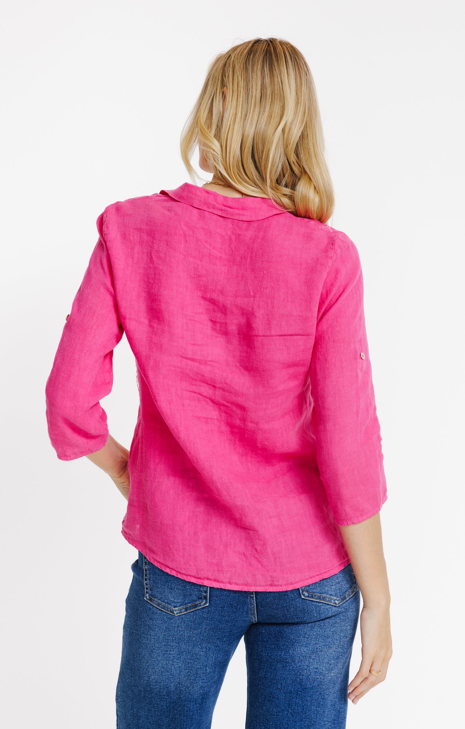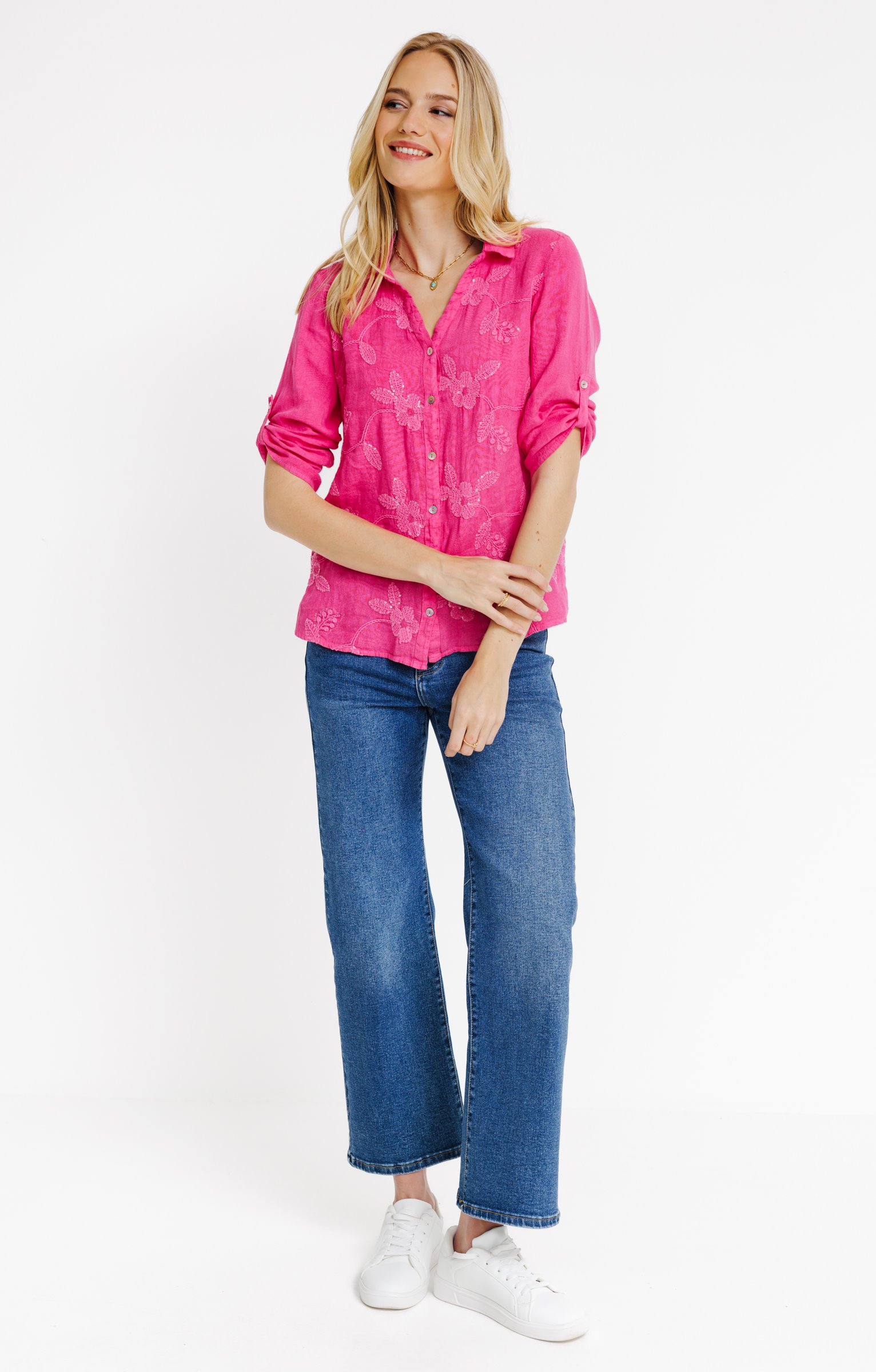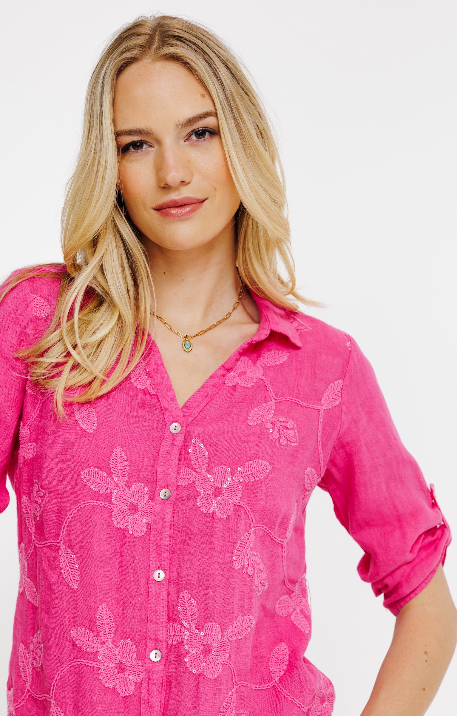 Chemisier à manches 3/4 avec col chemise. Coupe droite. Fermeture par boutons sur le devant. Détails de broderies florales sur l'ensemble du modèle. Longueur standard. Manches retroussables avec bouton.