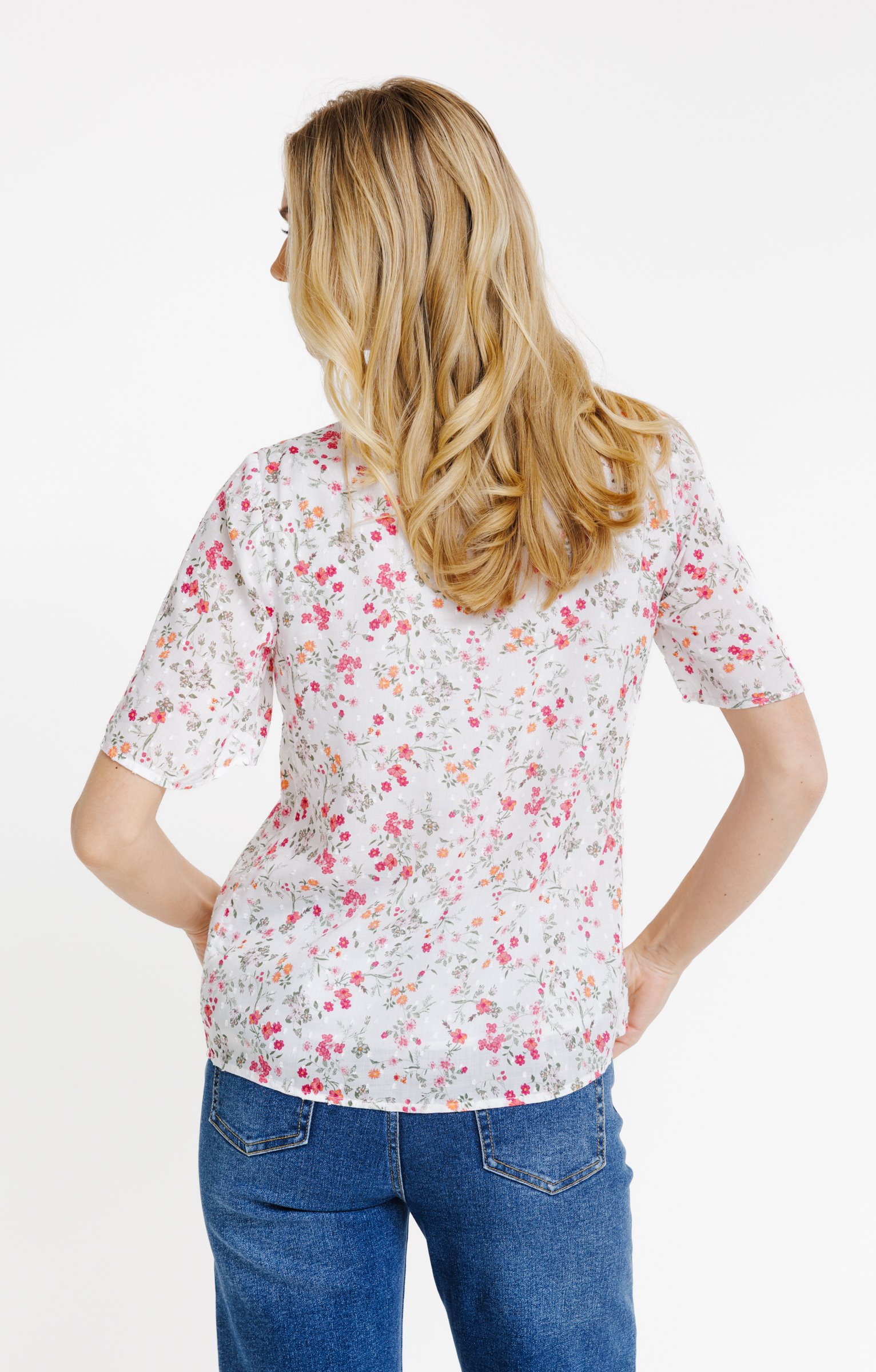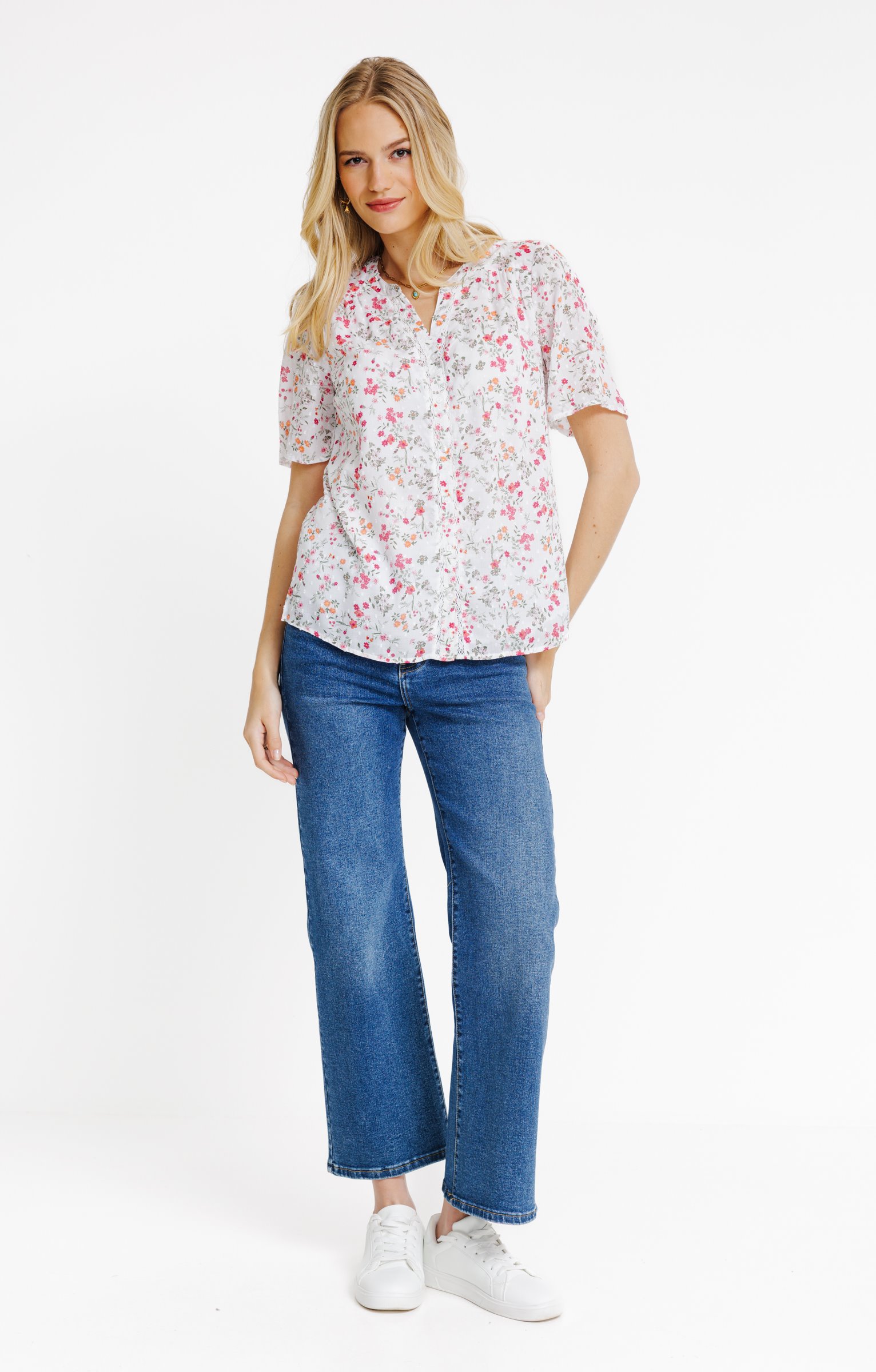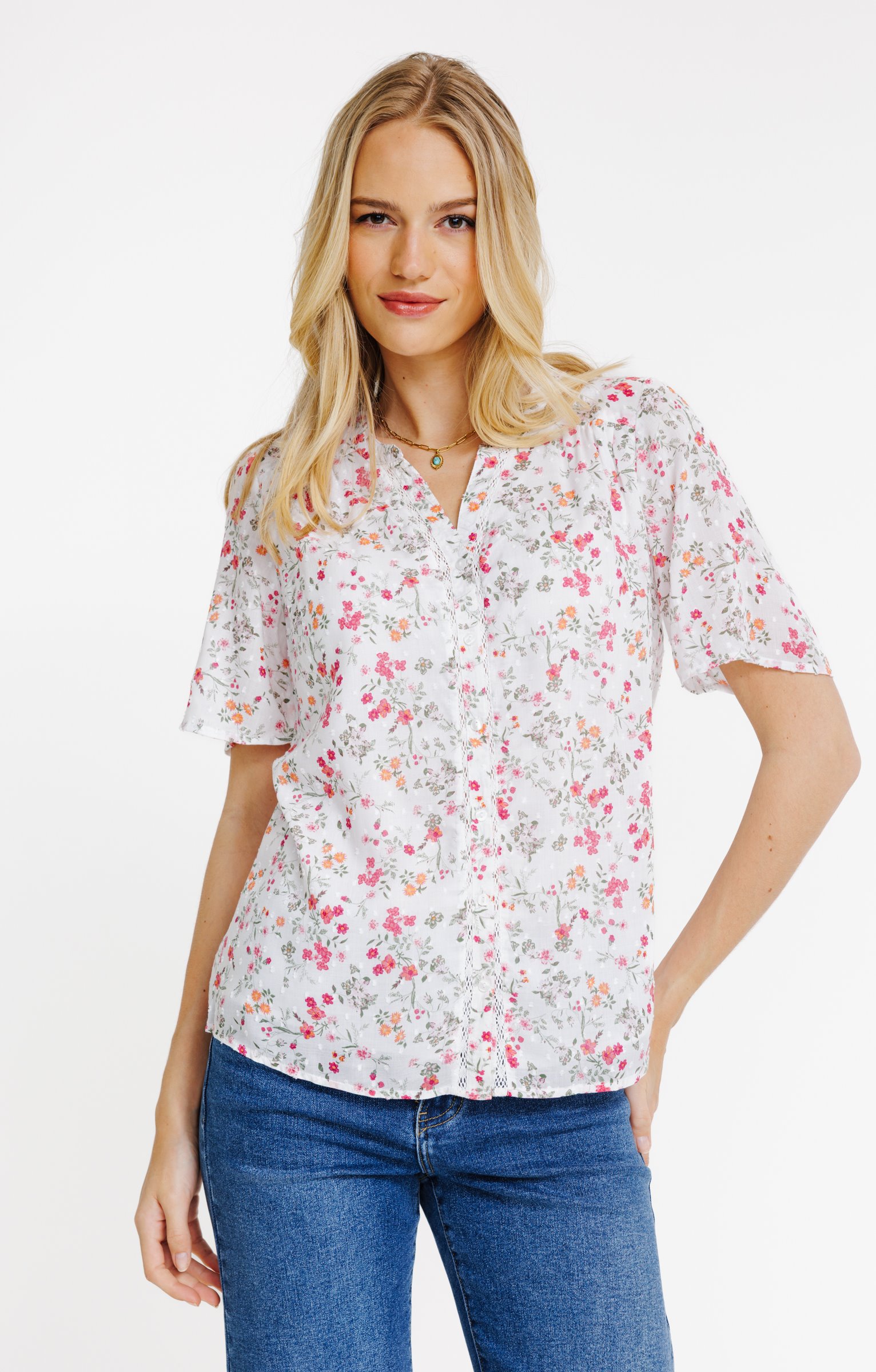 Chemisier à manches courtes avec col mao. Coupe droite. Fermeture boutonnée sur le devant. Imprimé floral multicolore sur l'ensemble. Détails en dentelle le long du col et de la patte de boutonnage. Longueur standard.