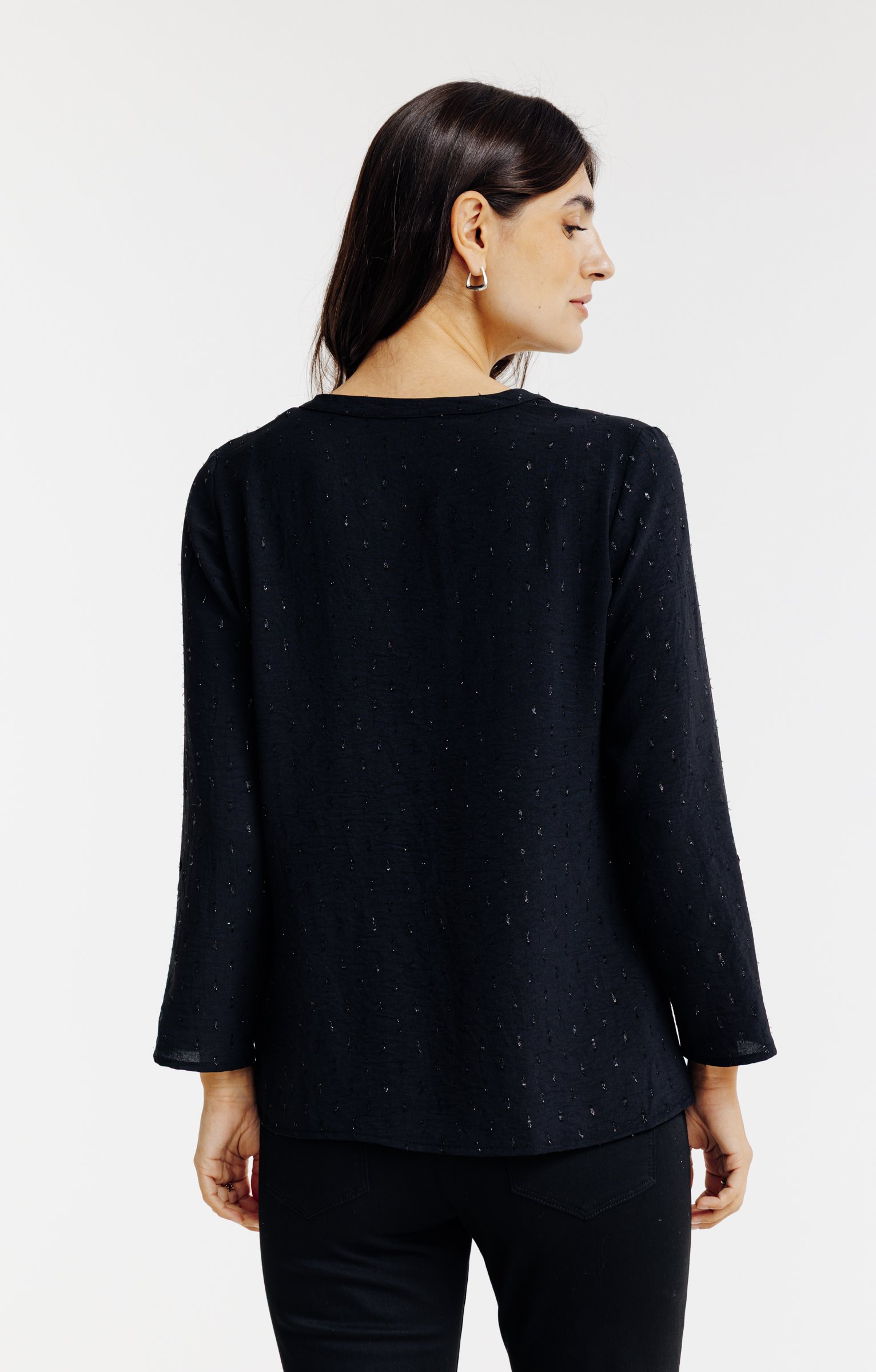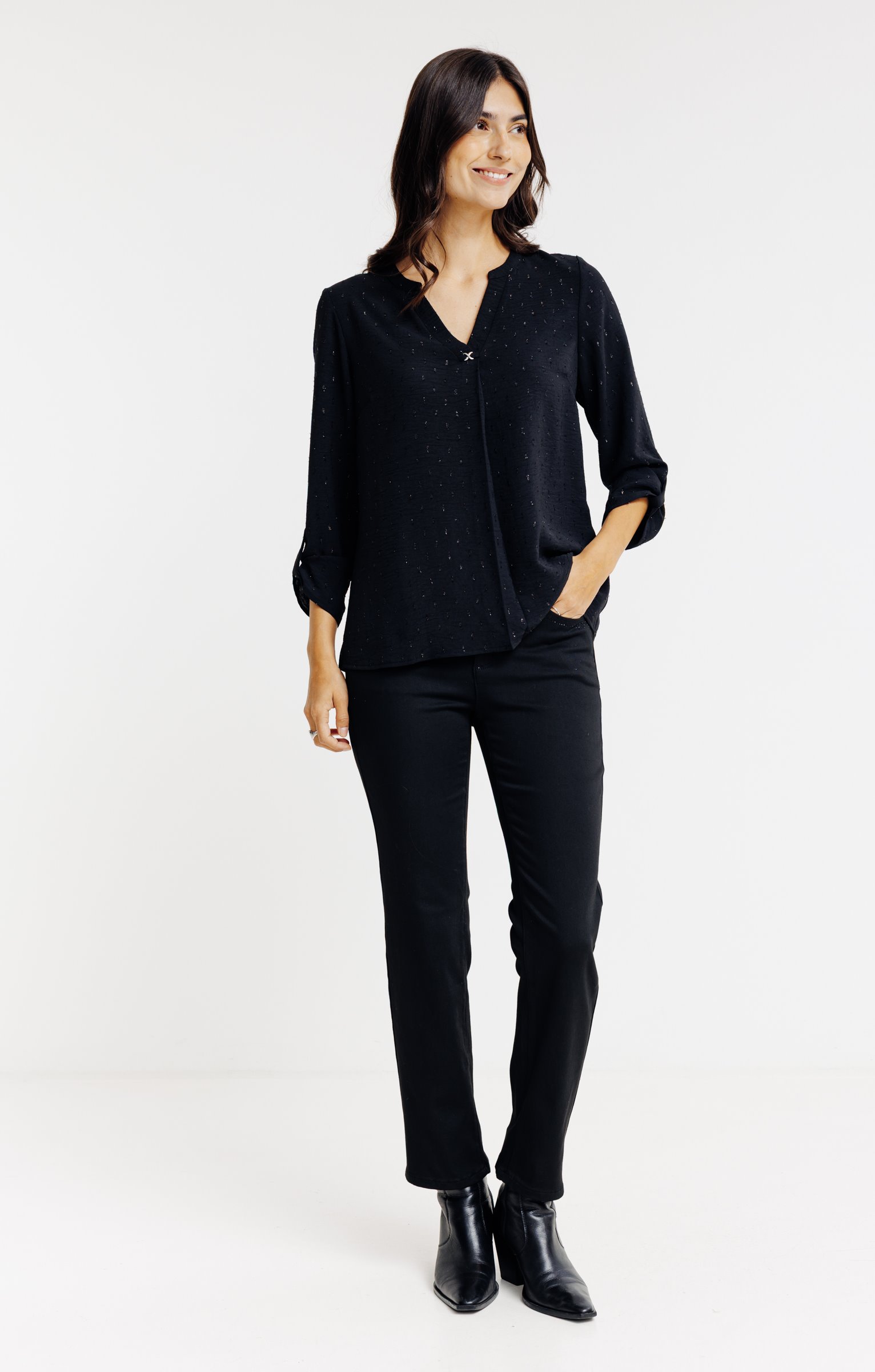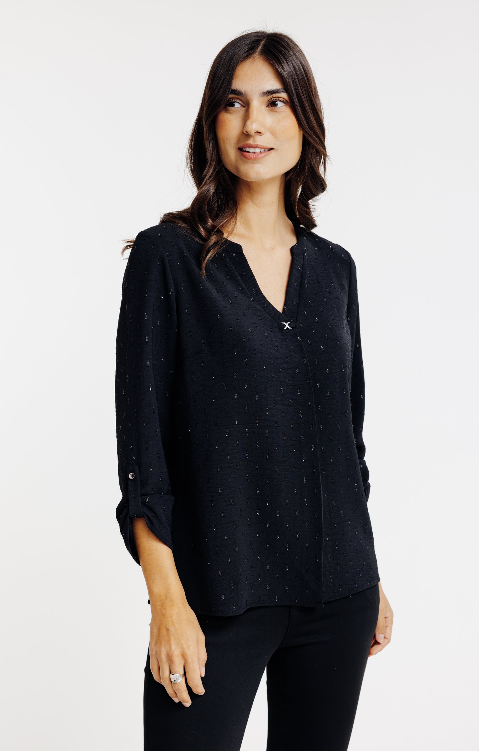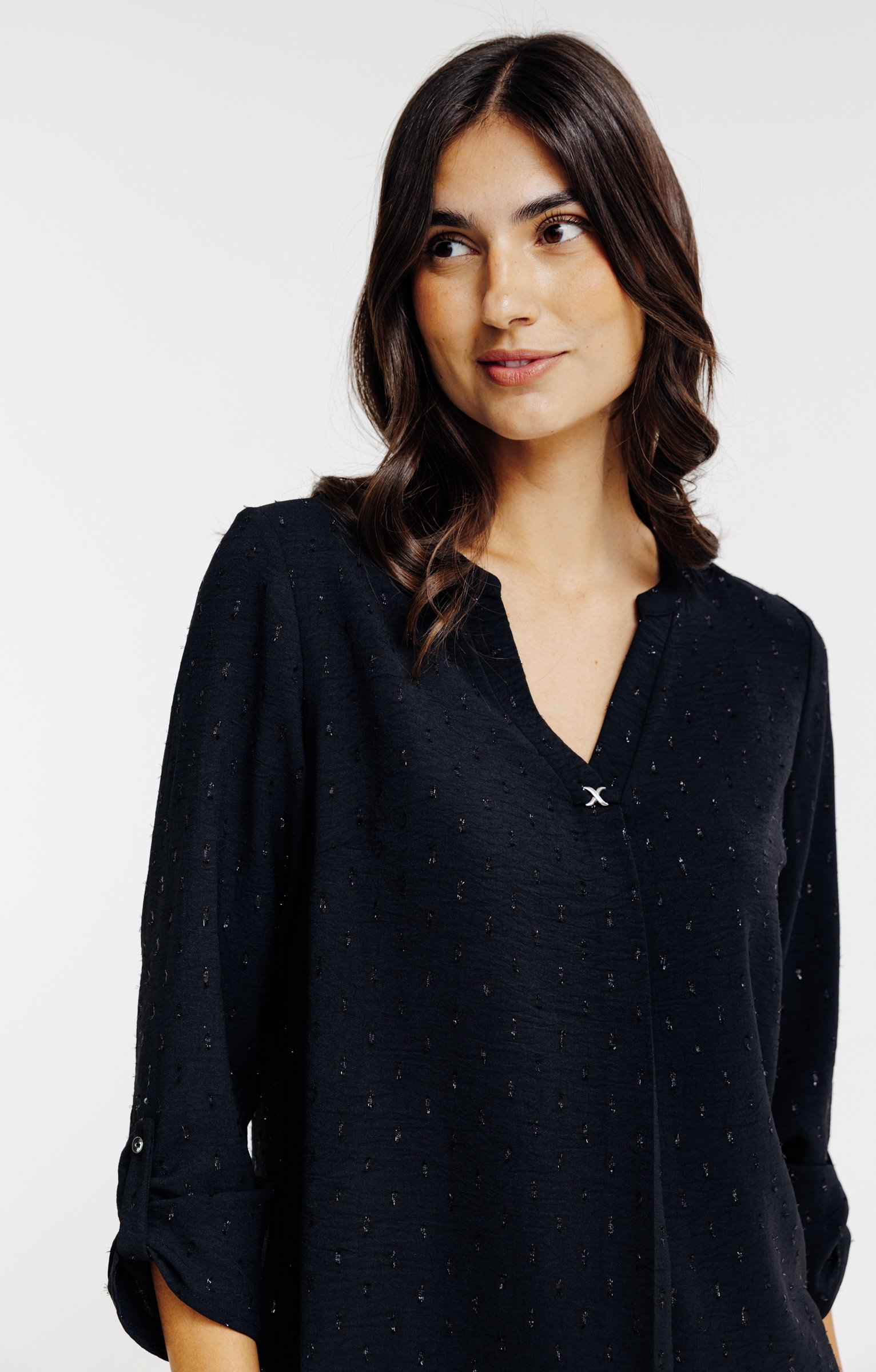 Tunique en tissu plumetis uni à manches 3/4 et col V avec bijou. Coupe droite. Manches 3/4 retroussables avec patte de relevage boutonnée. Col V avec boucle style infini à la base. Coloris uni. Tissu plumetis aspect crêpe texturé. Col croisé à la base avec un pli plat. Petits boutons ton sur ton. Fines surpiqûres discrètes en finition du modèle. Base droite.
