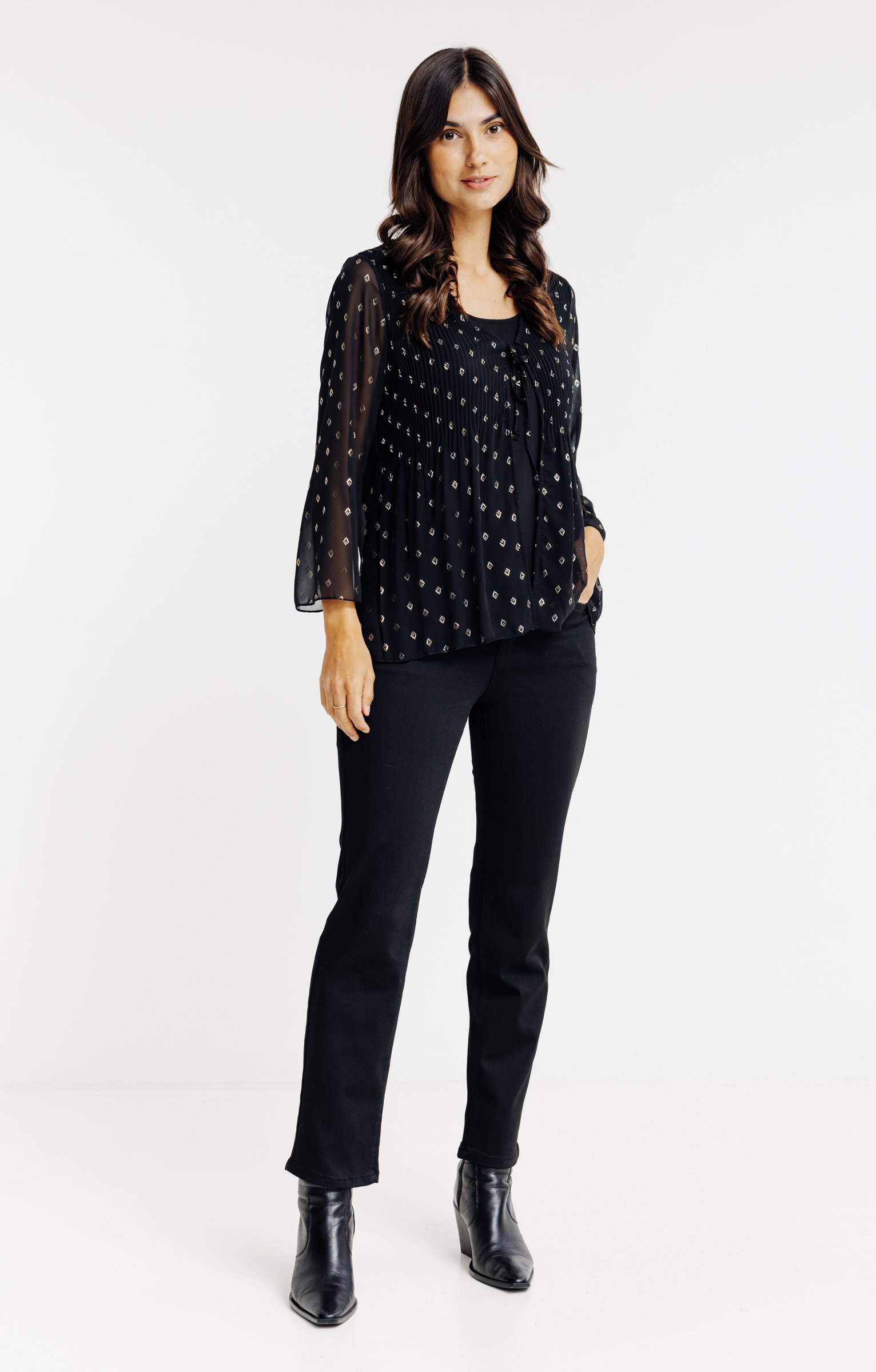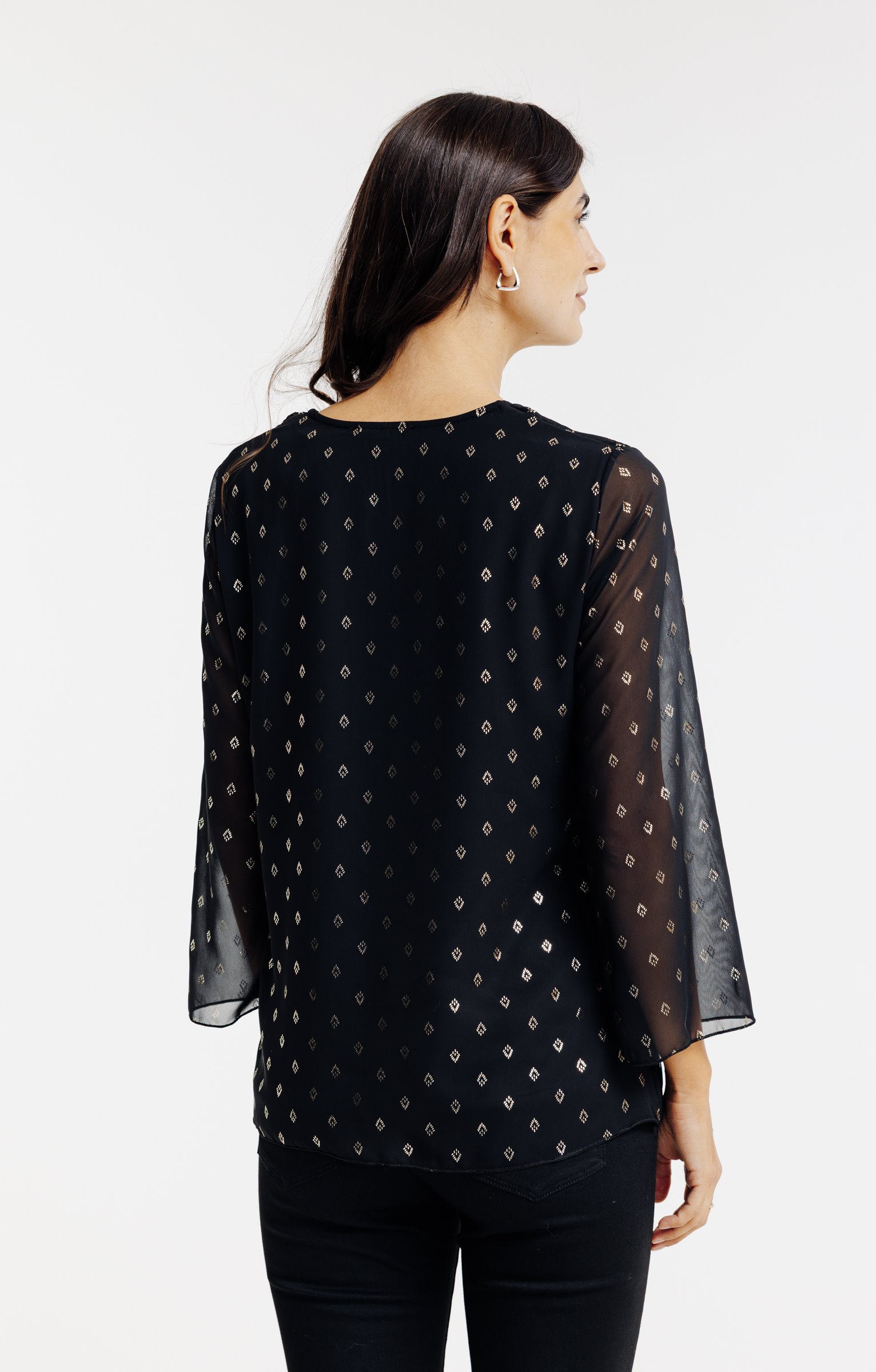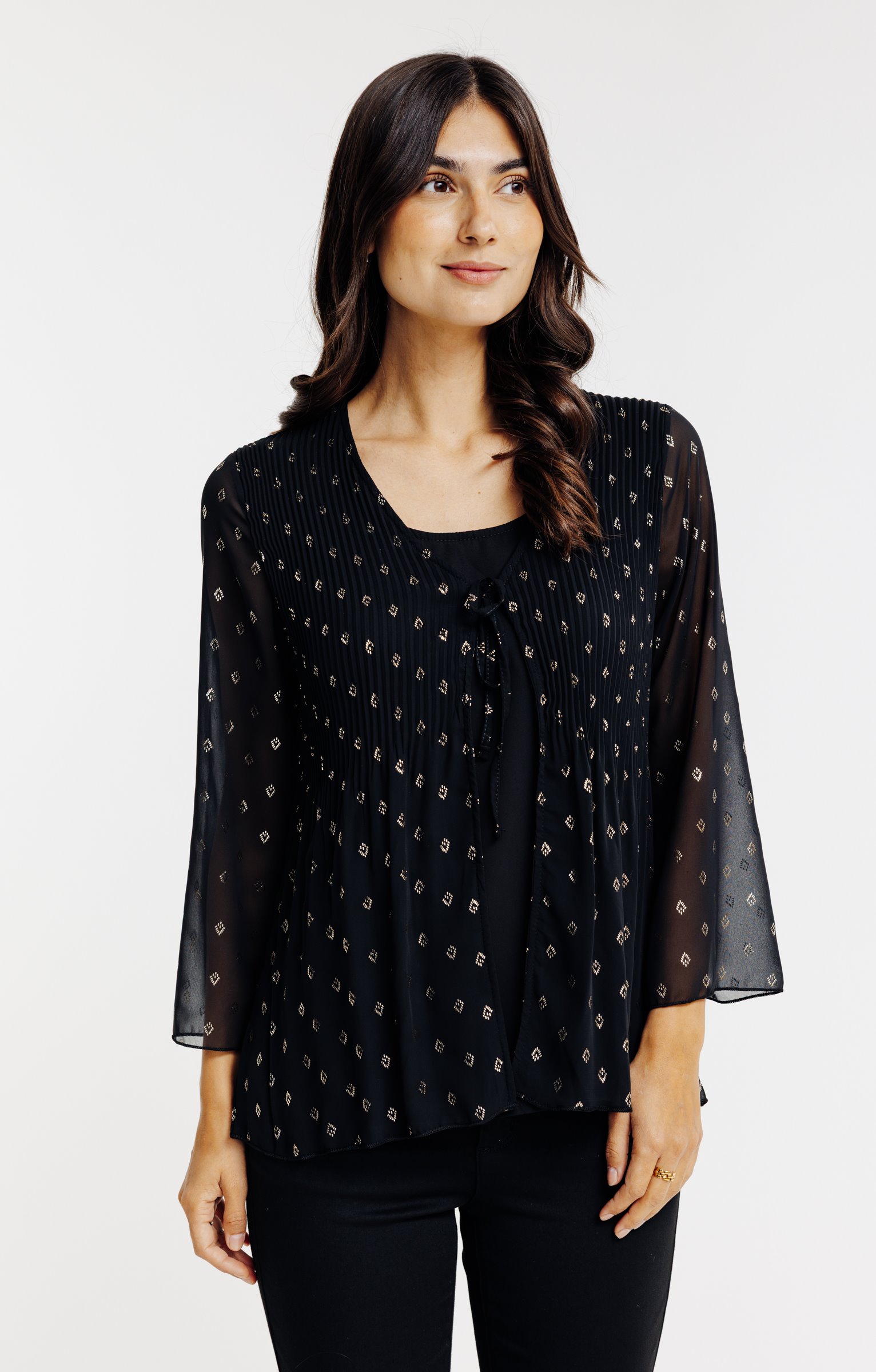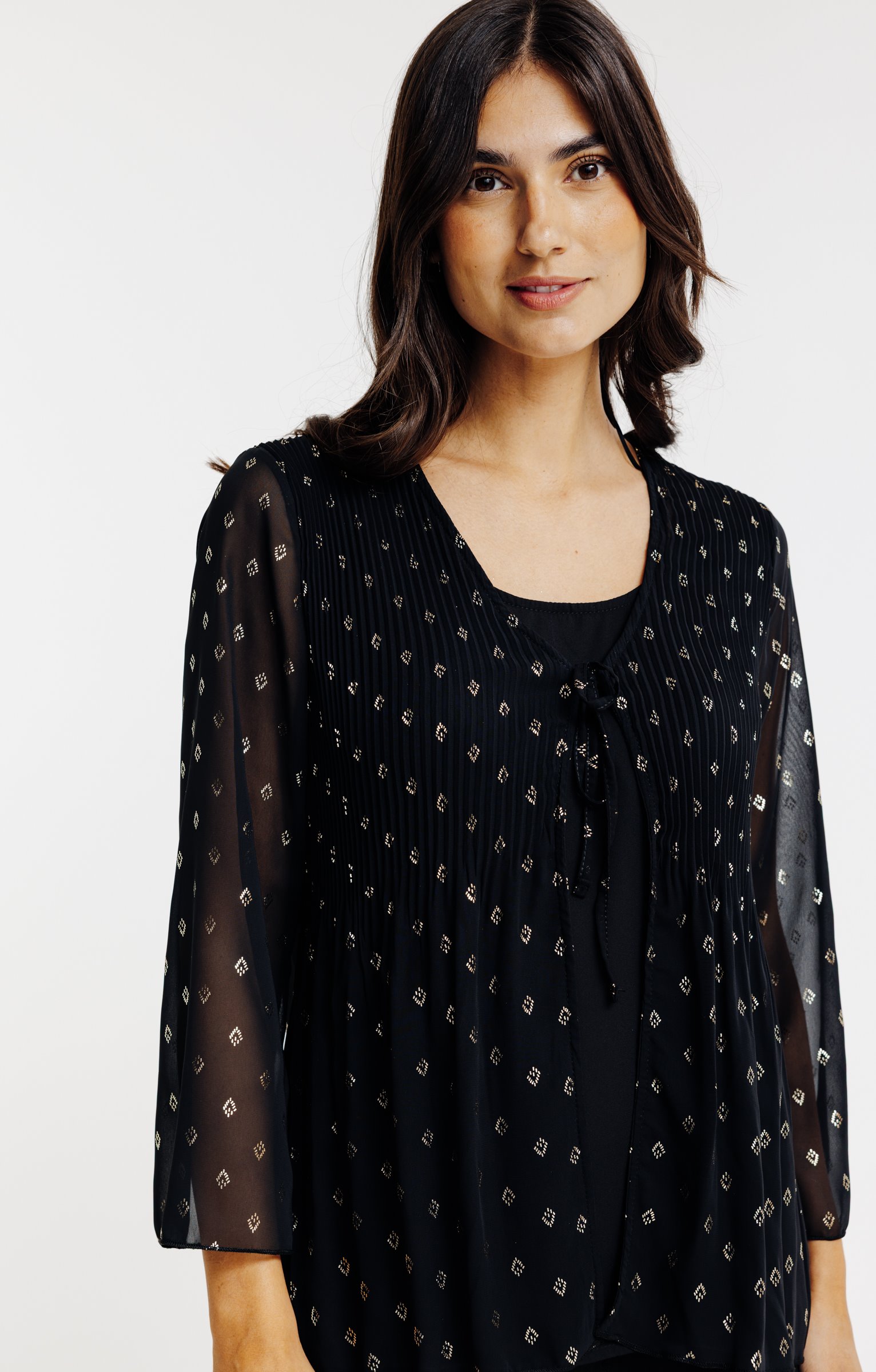 Tunique 2-en-1 en voile plumetis plissé à manches 3/4 et col à nouettes. Coupe droite. Manches 3/4 légèrement amples. Col V à nouette avec col rond à l'intérieur. Tunique sans fermeture avec liens à nouer au col. Mini-motifs métallisés avec intérieur uni. Tissu en voile plumetis plissé. Intérieur en tissu léger. Fines surpiqûres ton sur ton en finition du modèle. Base droite.