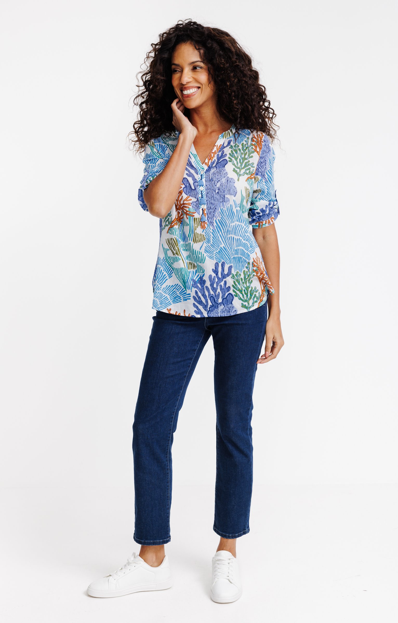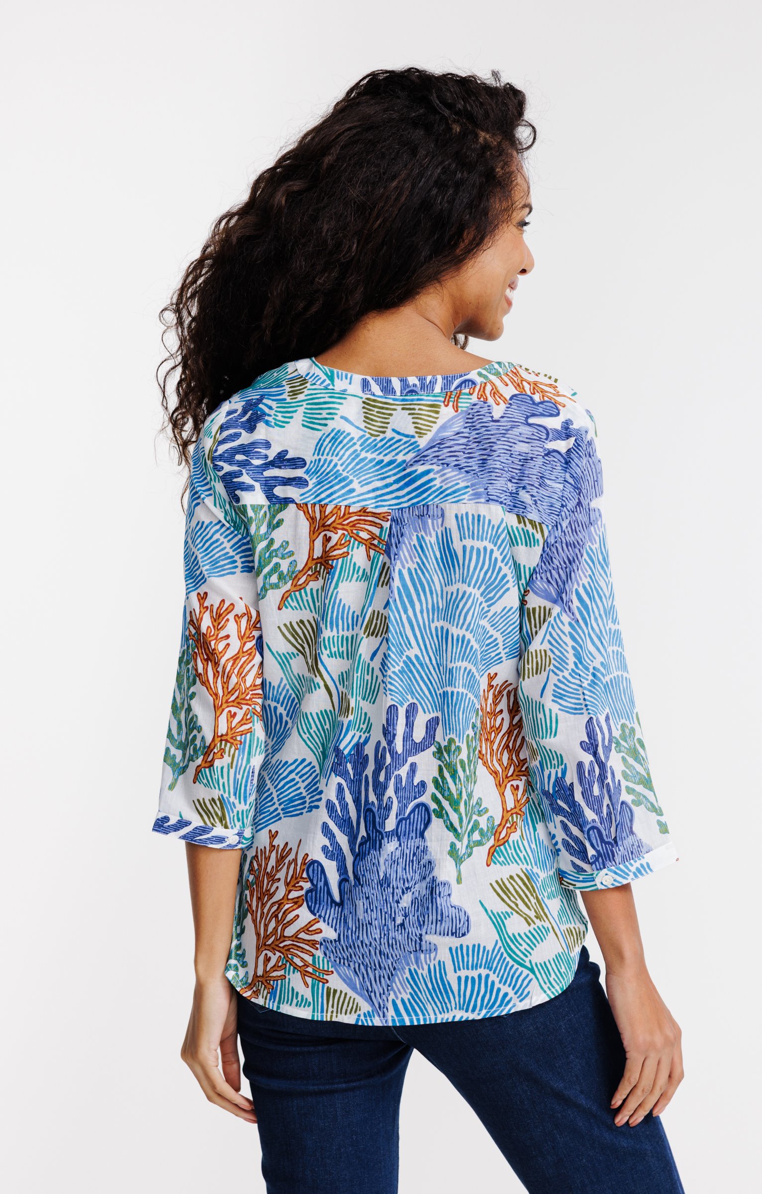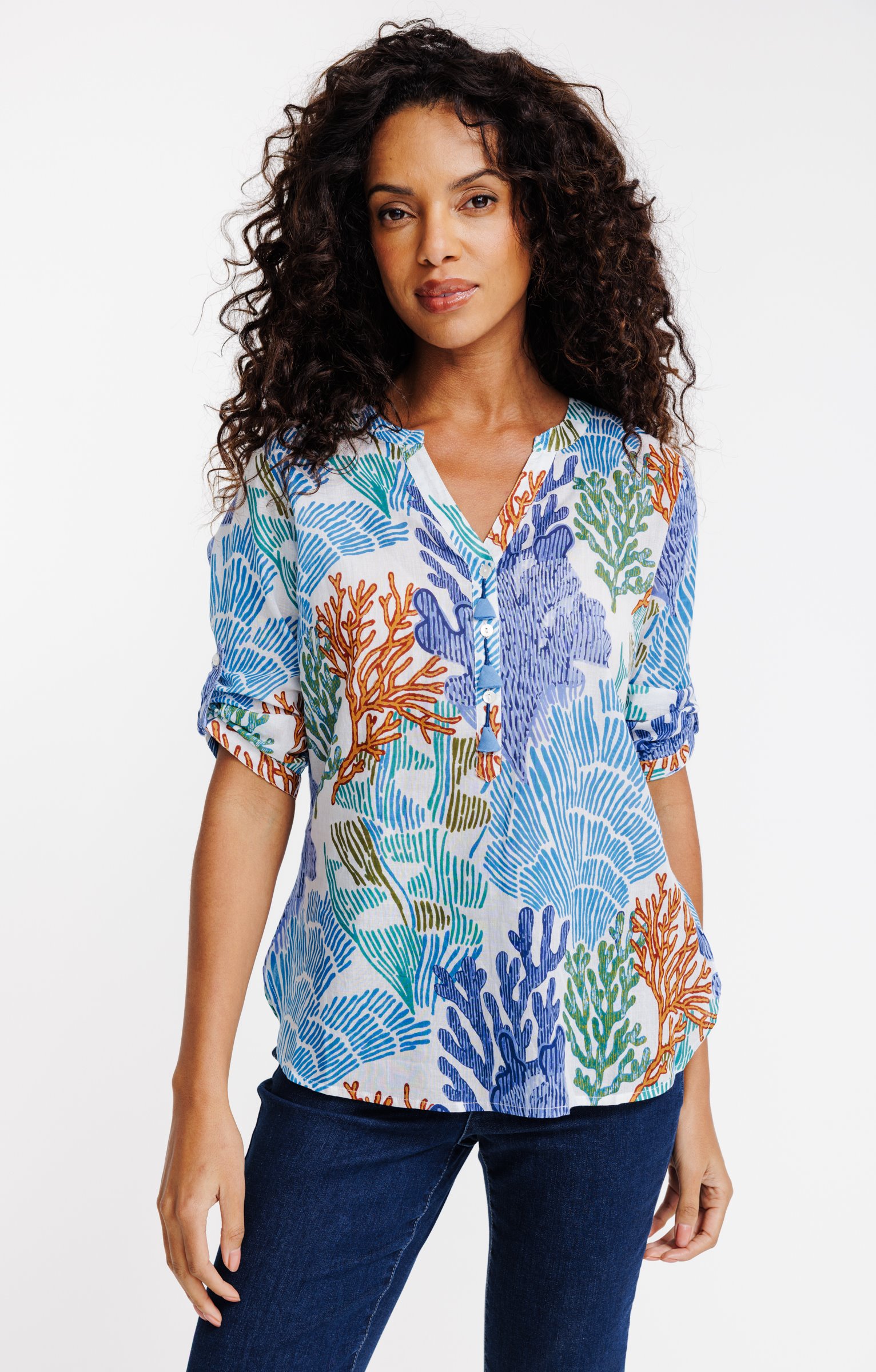 Chemisier à manches 3/4 avec col mao. Coupe droite. Fermeture par boutons nacrés sur le devant. Imprimé multicolore avec motifs de coraux. Détails de pompons en coton au niveau de la fermeture. Manches 3/4 retroussables par une patte de boutonnage. Longueur standard.