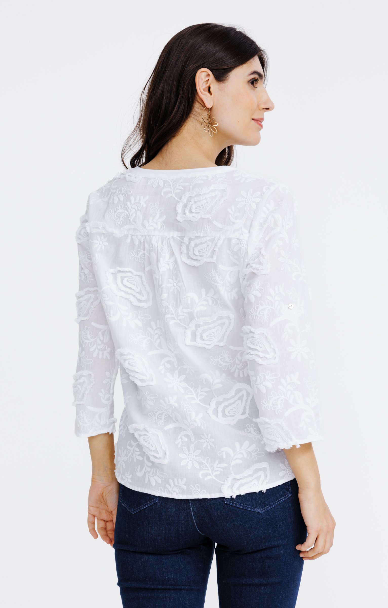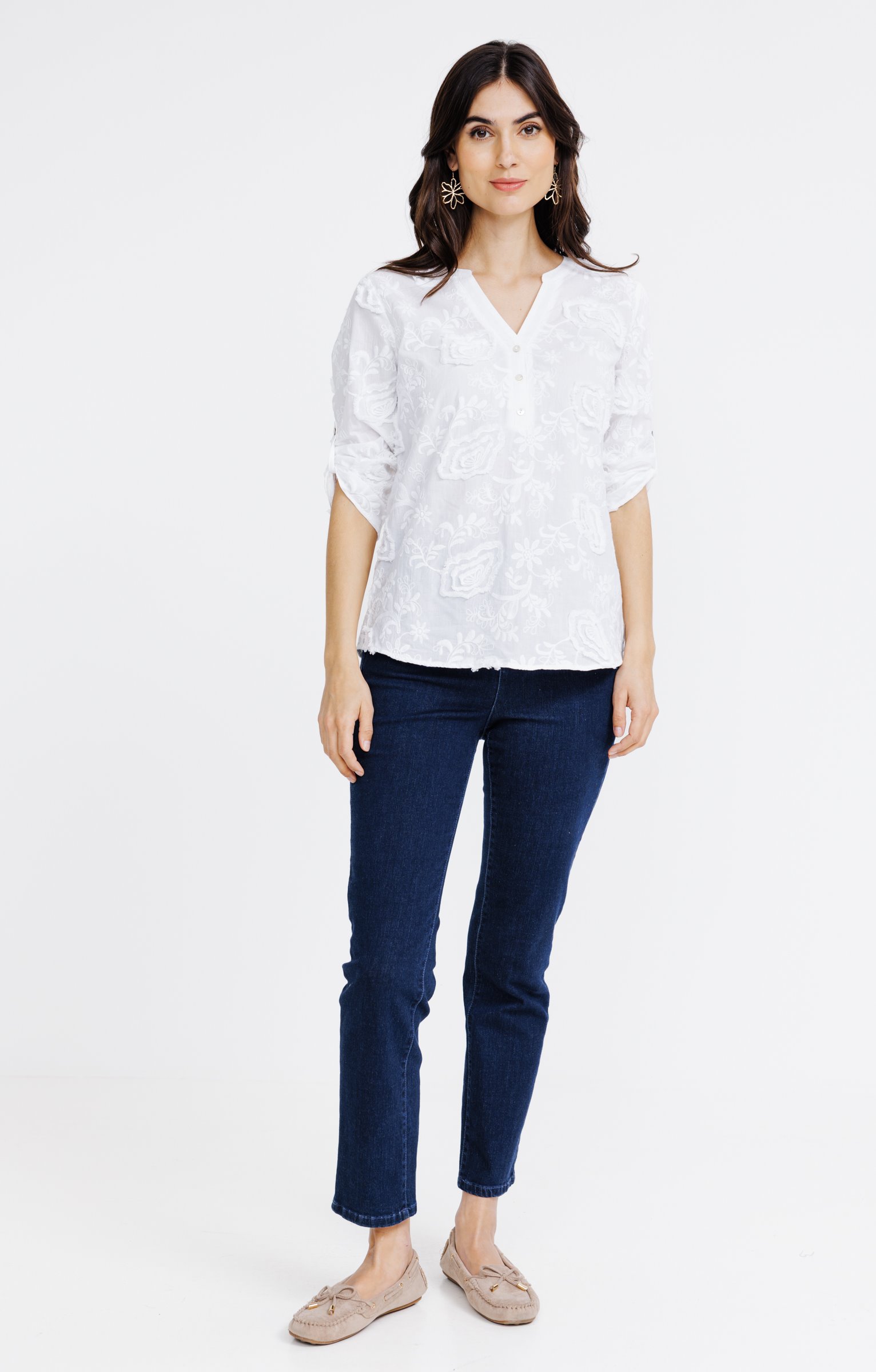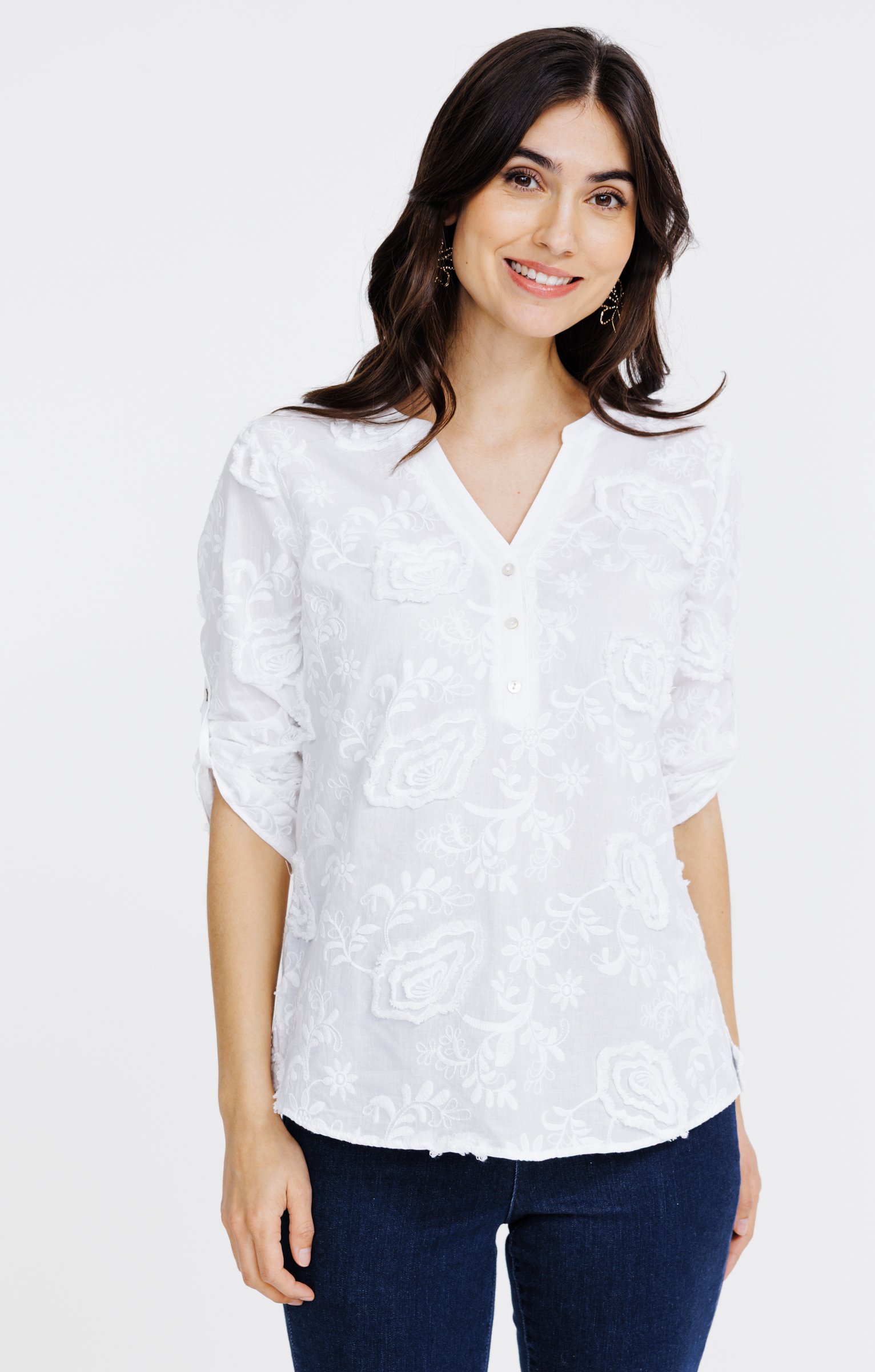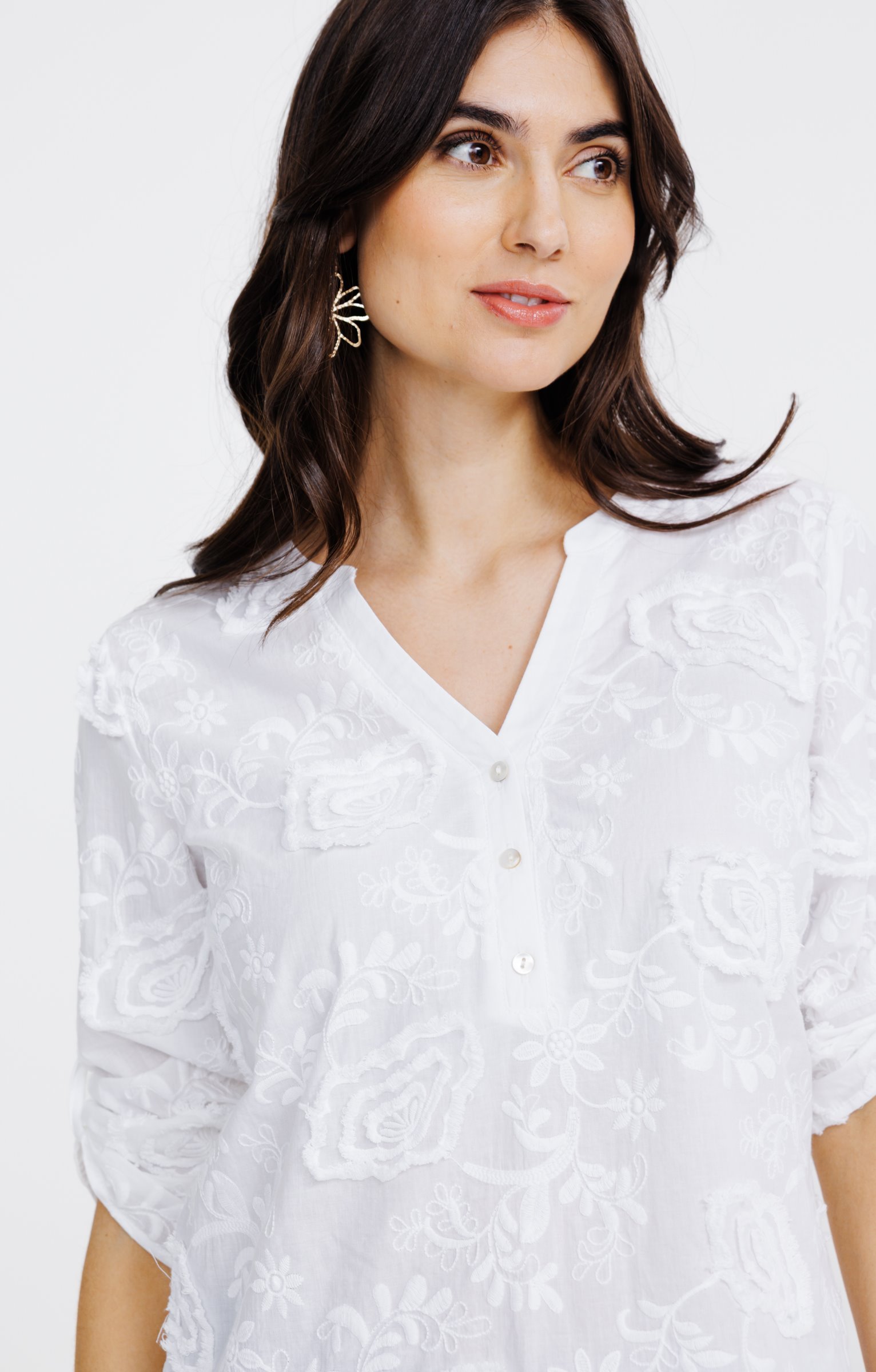 Chemisier à manches 3/4 retroussables avec col mao. Coupe droite. Trois boutons décoratifs sur le devant. Détails de broderie florale sur l'ensemble du modèle. Longueur standard. Finitions brutes au niveau des bords.