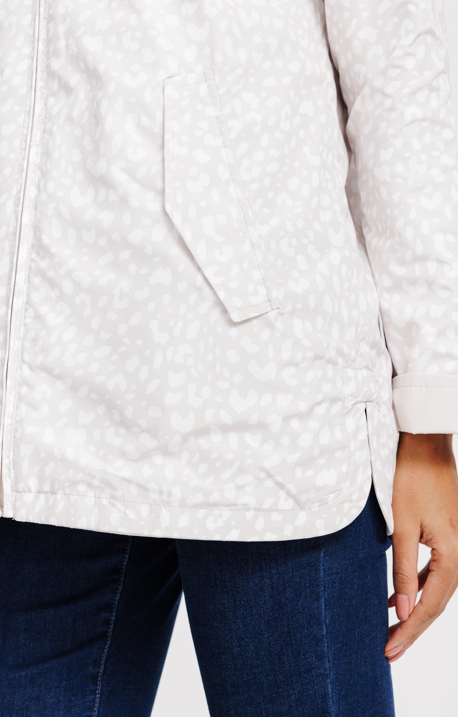 Imperméable réversible à capuche. Coupe droite. Manches longues. Col montant avec capuche. Fermeture zippée sur le devant. 2 poches devant, zippées sur une face, avec rabat pressionné sur l'autre face. Modèle réversible : une face unie et l'autre imprimée à motif animalier. Doublure. Composition 55% polyester recyclé.