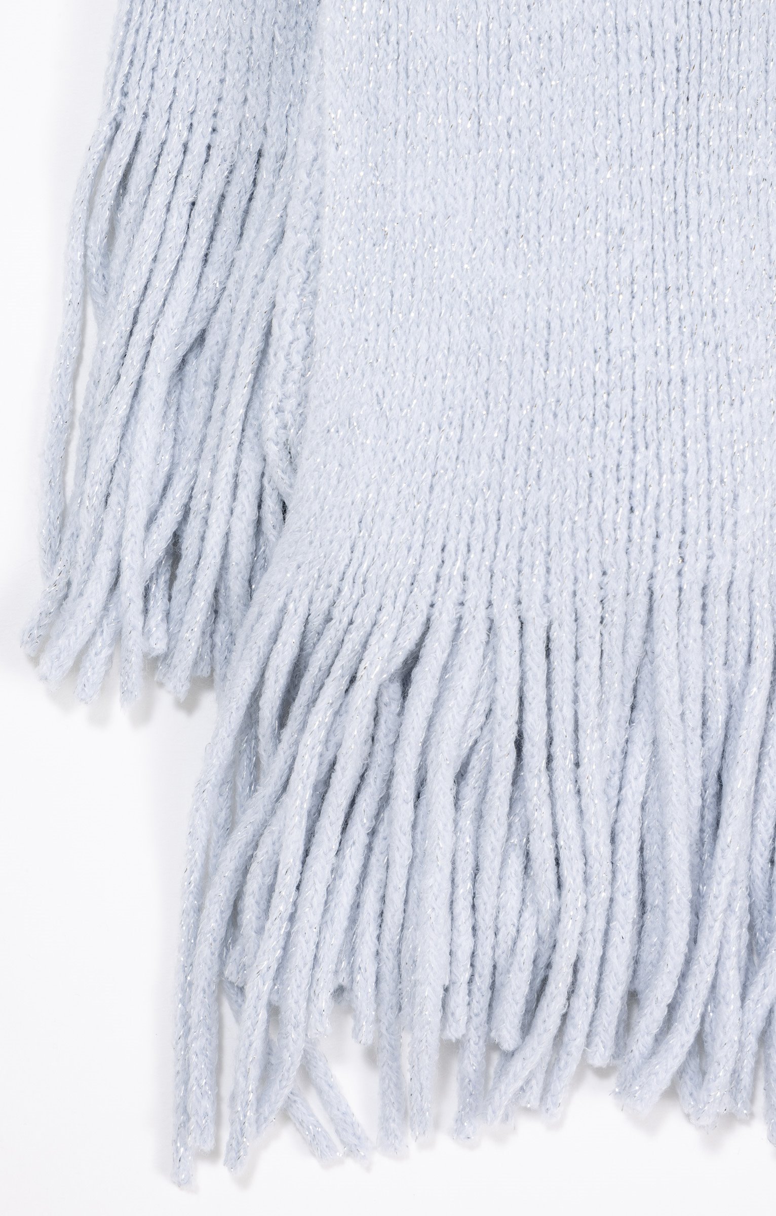 Écharpe à franges en maille métallisée. Forme rectangulaire classique. Dimensions : 38 x 180 cm. Matière chaude. Maille unie rehaussée de fils métallisés. Finitions à fines franges torsadées. Portez cette écharpe au quotidien, sur une veste en jean ou en cuir.