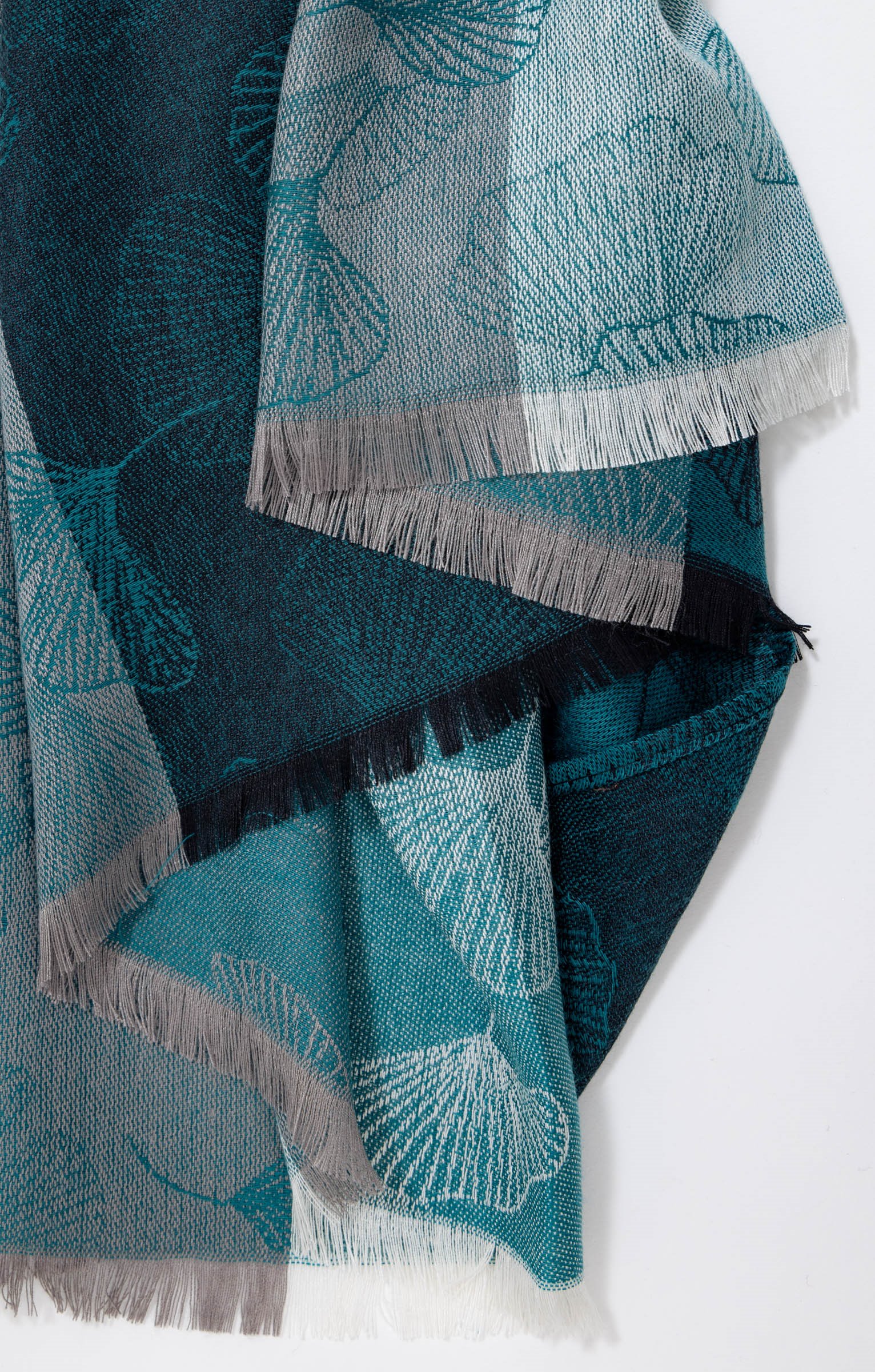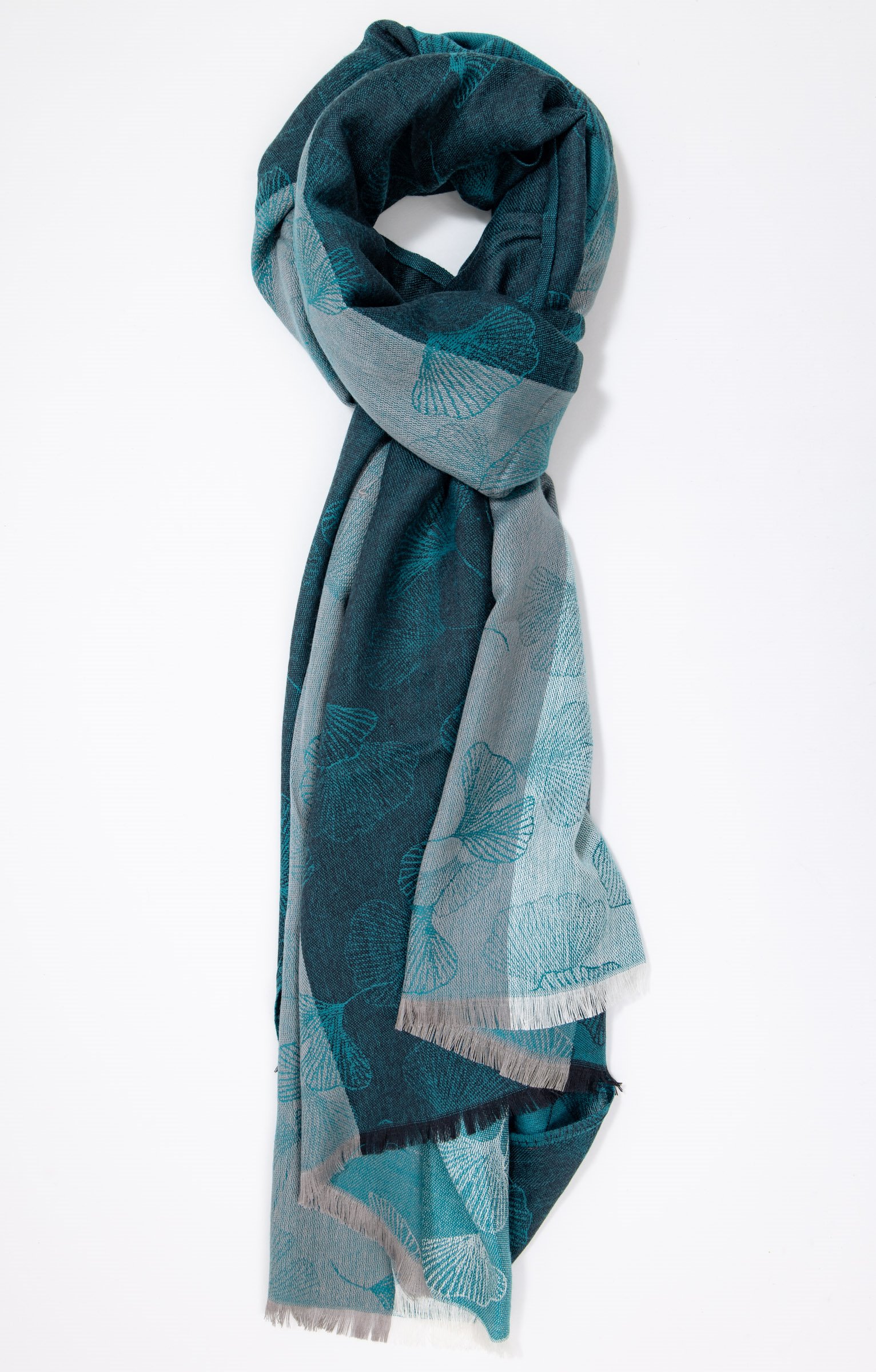 Grand foulard multicolore frangé à motifs végétaux tissés. Forme rectangulaire. Matière douce. Larges rayures verticales et motifs ginkgo biloba tissés dans un camaïeu de tons. Courtes franges en fil à fil en finition des largeurs. Dimensions : 70 x 180 cm.
