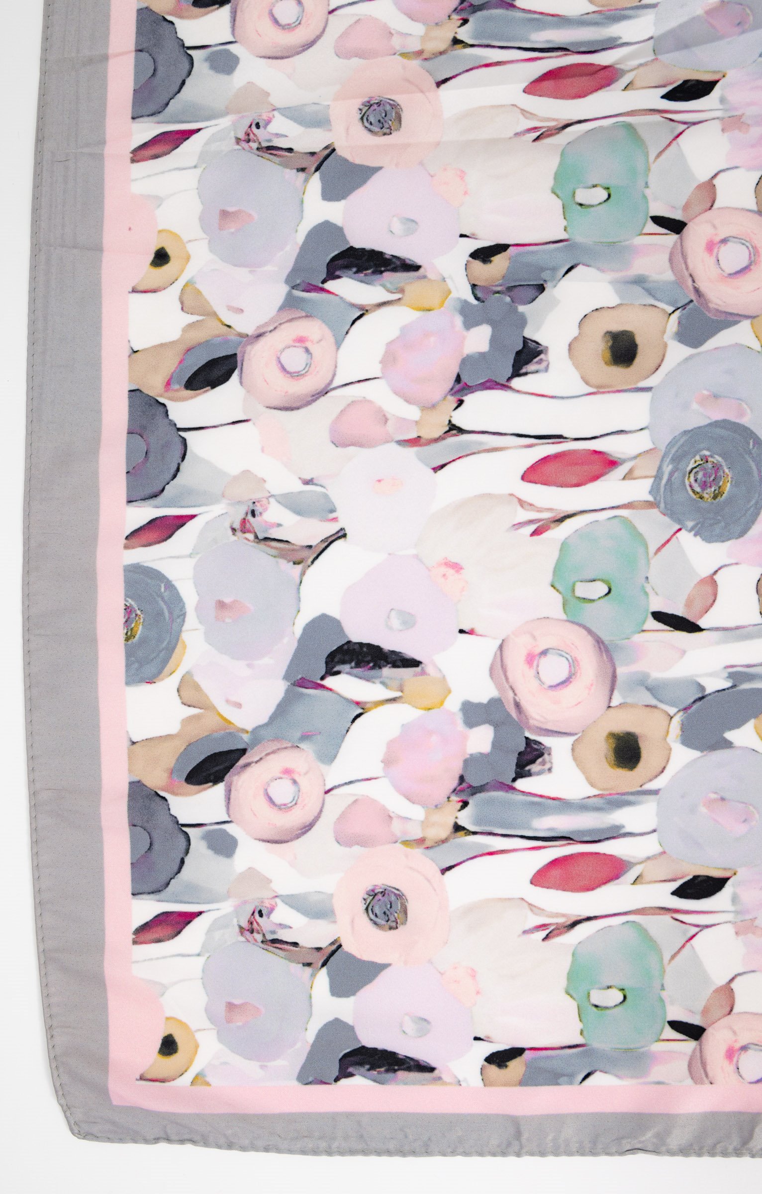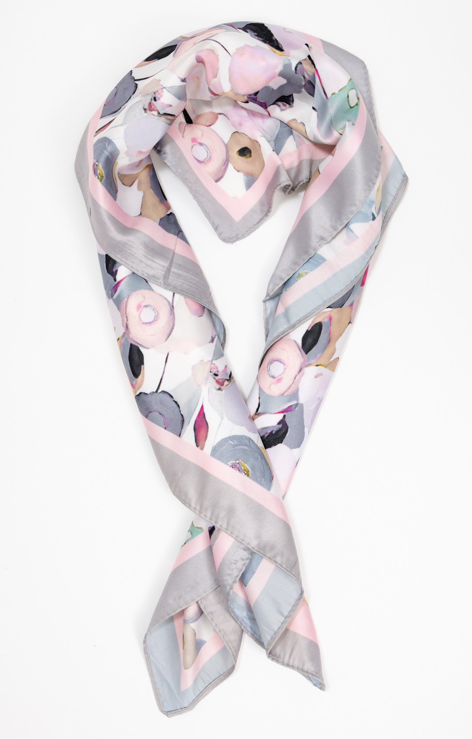 Petit foulard carré léger à motifs fleurs. Forme carrée. Modèle petit format. 69 x 69 cm de dimensions. Tissu léger aspect satiné. Motifs fleurs multicolores avec cadre uni. Motifs effet aquarelle. Fines bordures ourlées sur tout le pourtour du modèle. Surpiqûres discrètes ton sur ton en finition. Angles très légèrement arrondis.