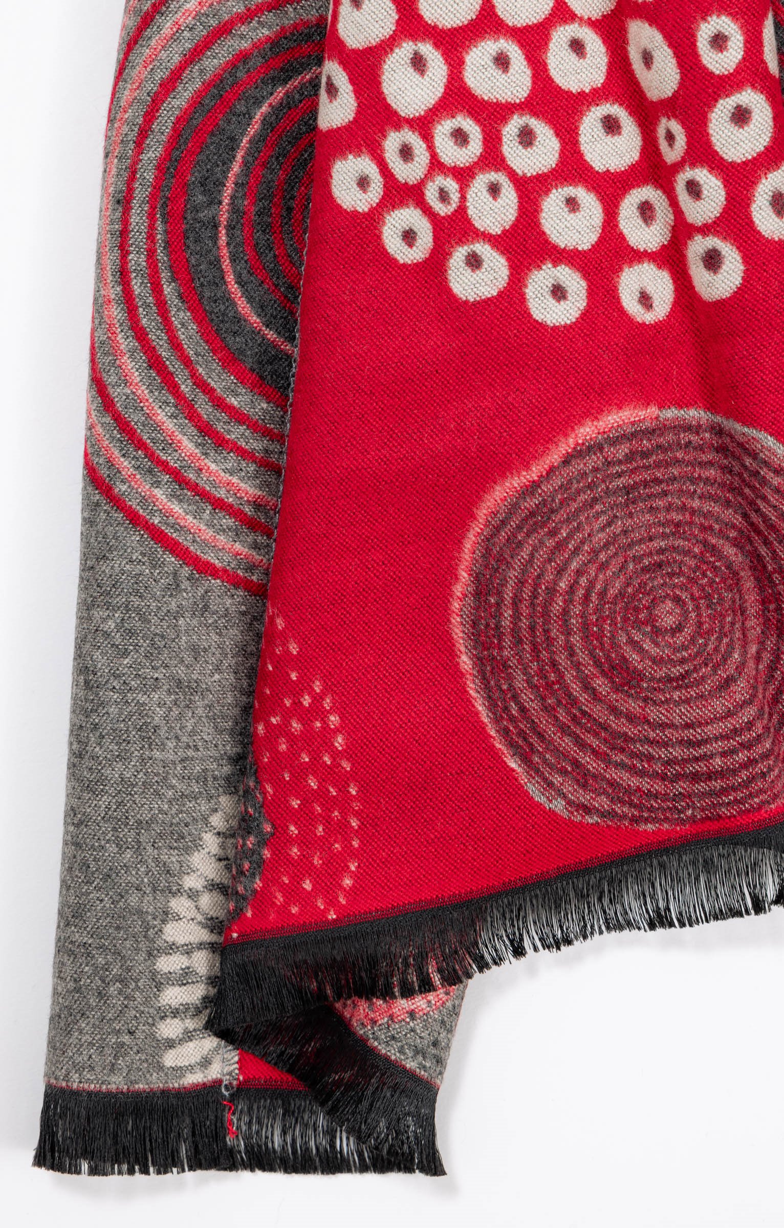 Foulard en voile jacquard chaud avec motifs multironds. Modèle grand format rectangulaire. Foulard de 65 cm de large et 190 cm de long. Tissu en voile chaud. Matière aspect chiné. Motifs jacquard multironds fantaisie. Bordures droites avec finitions surjetées sur la longueur. Finitions frangées sur la largeur. Fines franges contrastantes.