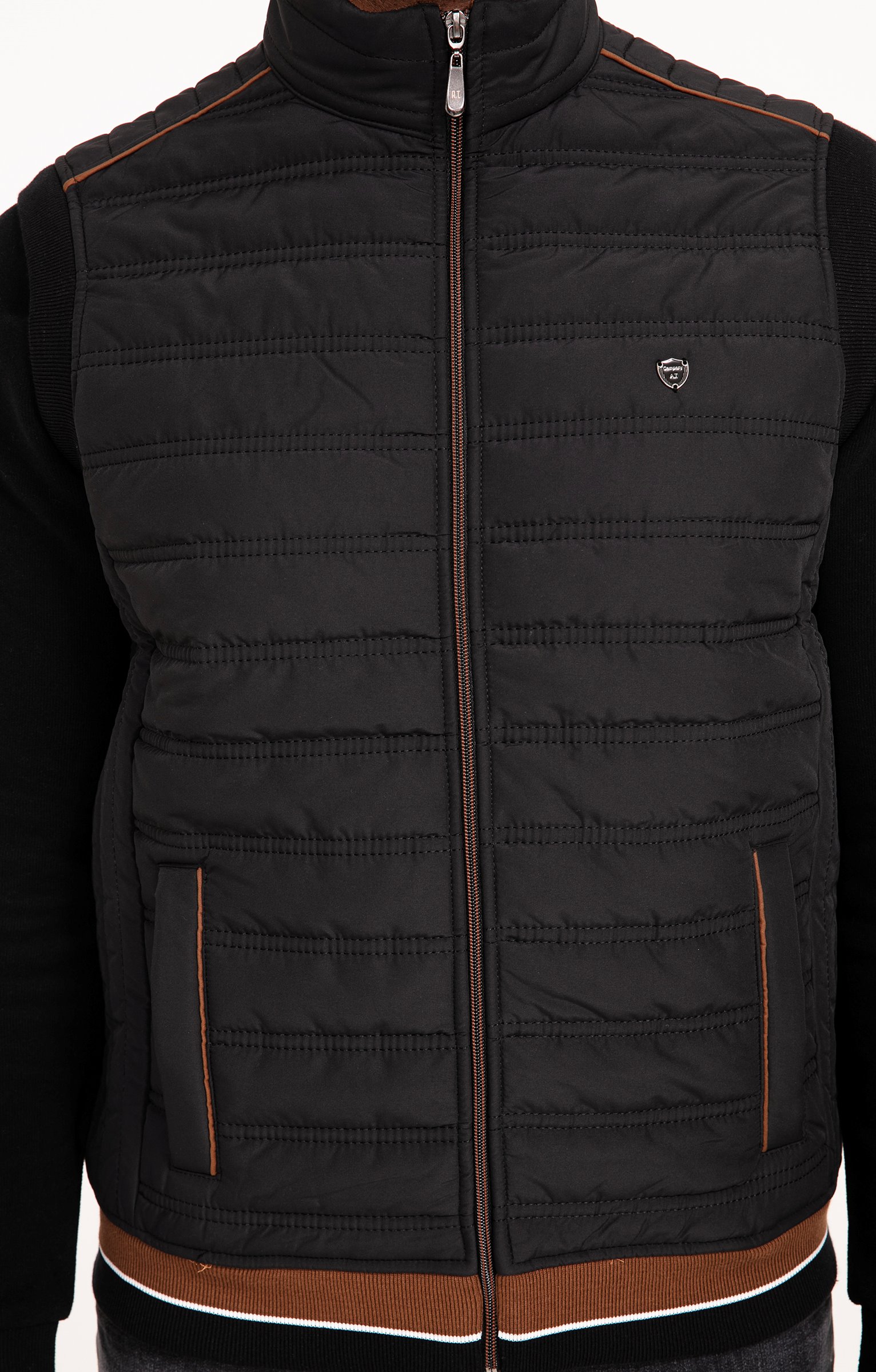 Gilet matelassé sans manches à col montant. Coupe droite. Fermeture zippée sur le devant. 2 poches verticales passepoilées à l'avant. Empiècements épaules avec surpiqûres. Base en bords-côtes. Coloris uni. Dos en tissu lisse contrastant. Notre mannequin Marvin mesure 1m87 et porte un gilet taille M.