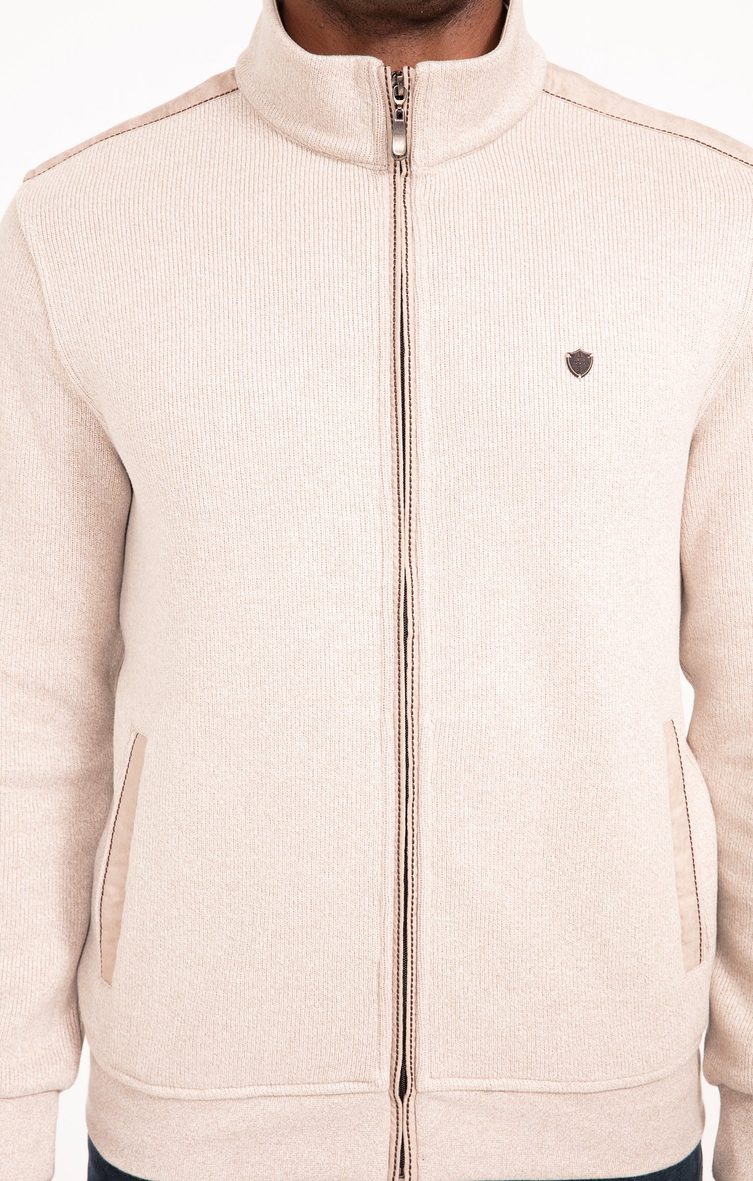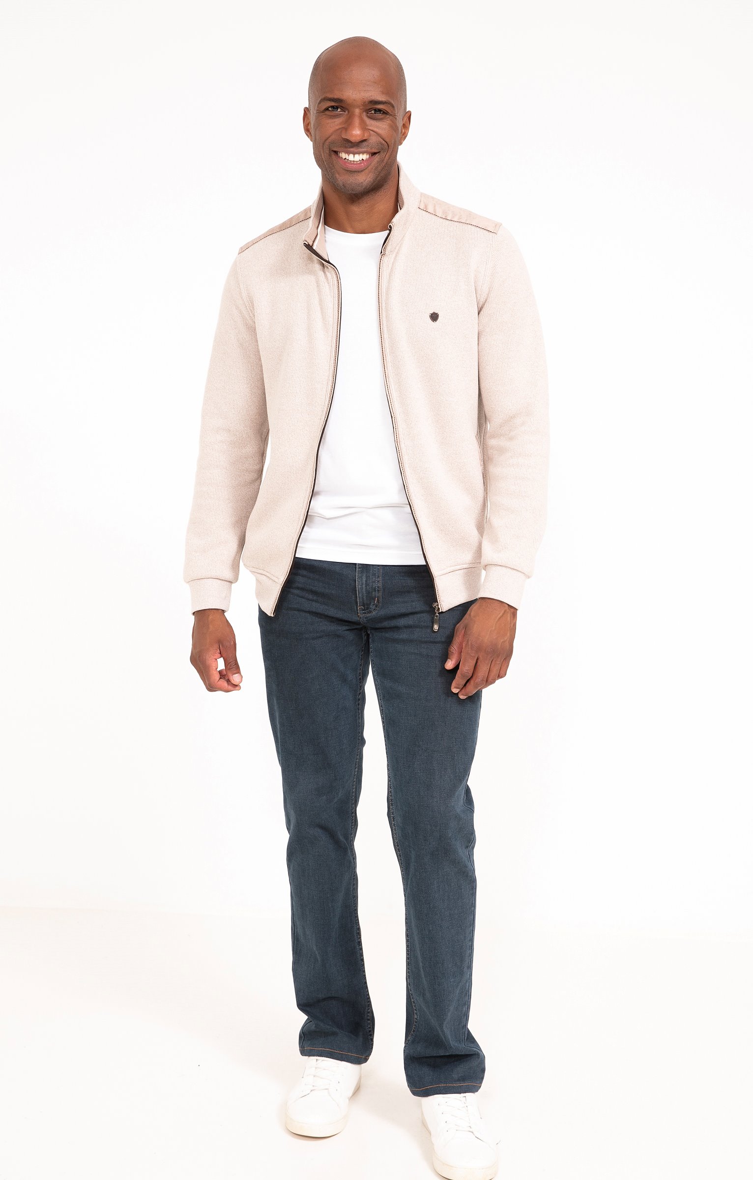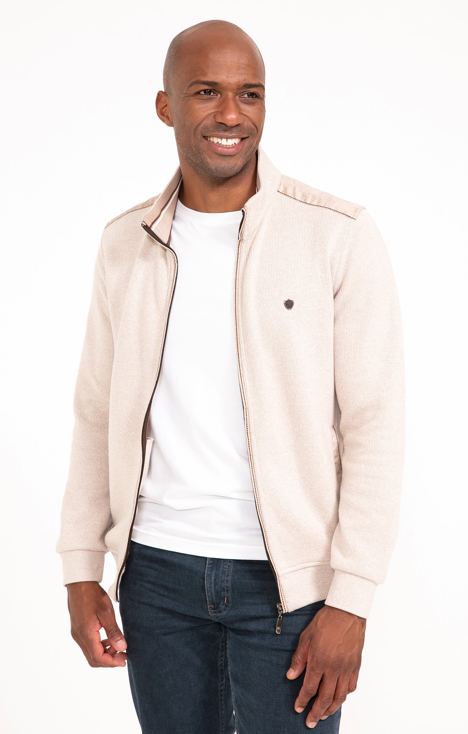 Gilet sport zippé avec poches. Coupe droite légèrement ajustée. Manches longues. Emmanchures droites. Col montant. Fermeture à zip contrasté. 2 poches passepoilées sous la taille devant. Teinte unie. Maille jersey. Base et poignets en bord-côte. Empiècements sur les épaules et passepoil des poches en matière unie aux surpiqûres contrastées. Écusson cousu sur la poitrine.
