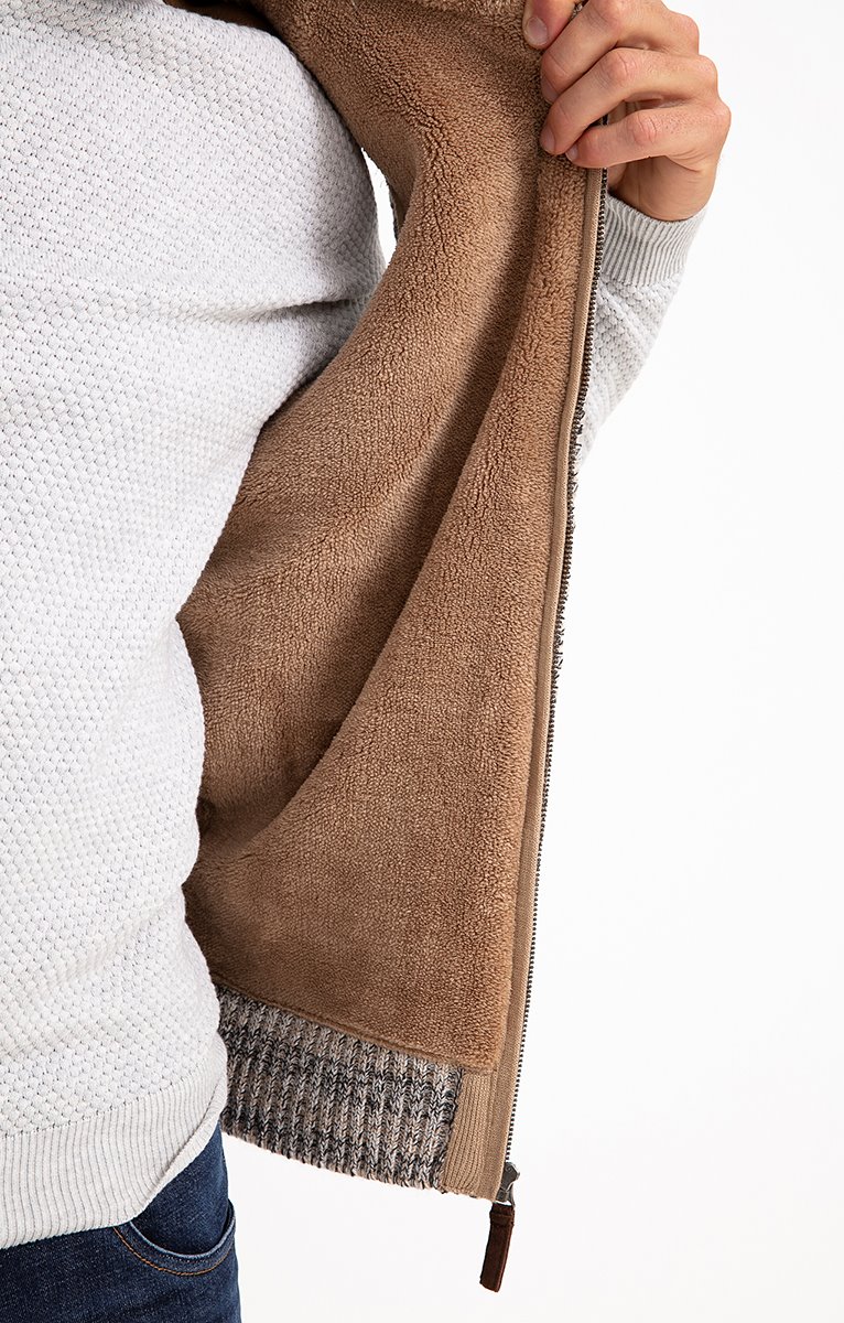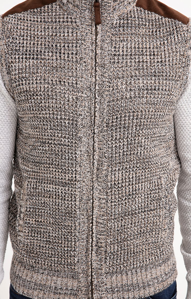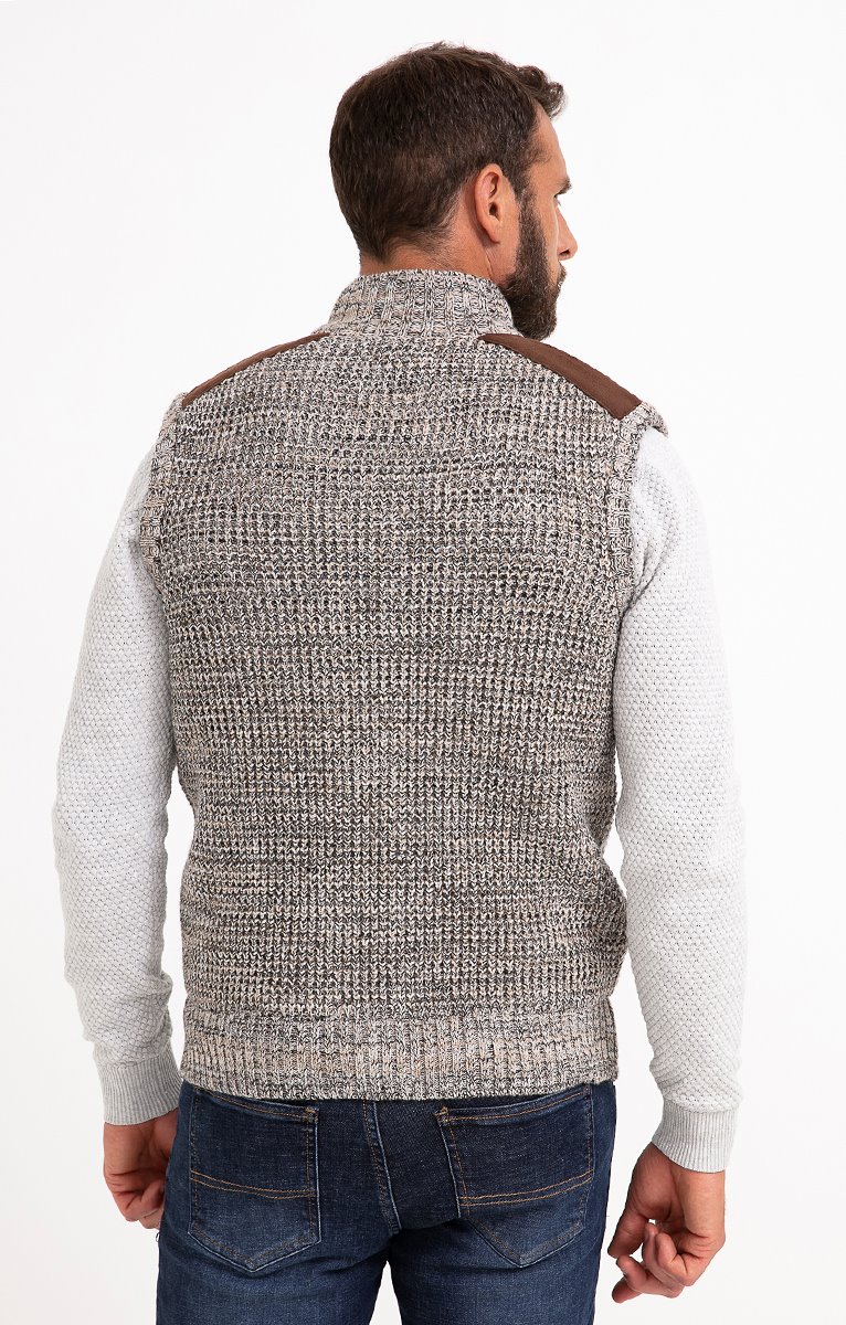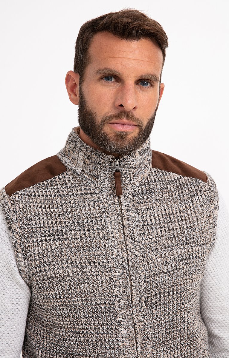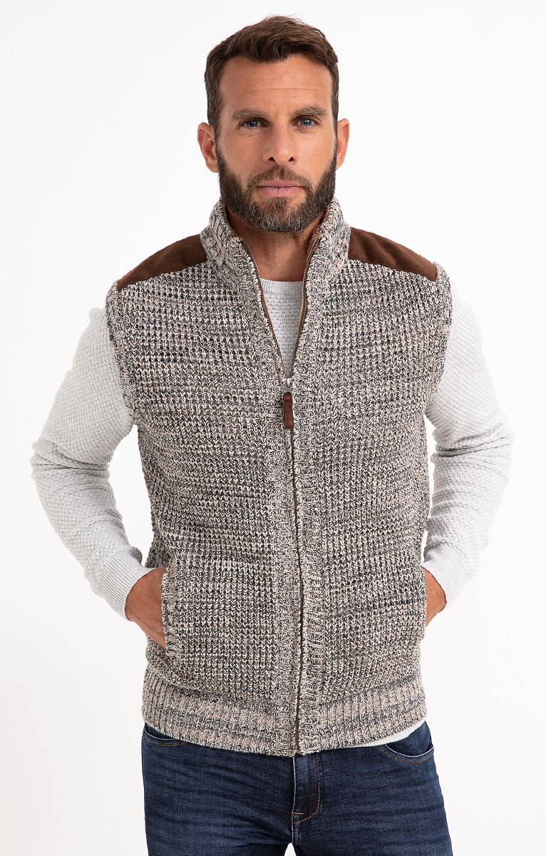 Gilet sans manches en tricot fantaisie doublé et finitions suédées. Coupe droite. Sans manches. Col montant. Fermeture zippée. 2 poches à la taille. Teinte chinée à motifs fantaisie. Maille moyenne. Doublure duveteuse. Empiècements aux épaules et tire-zip en matière suédée. Col et base en côtes.
