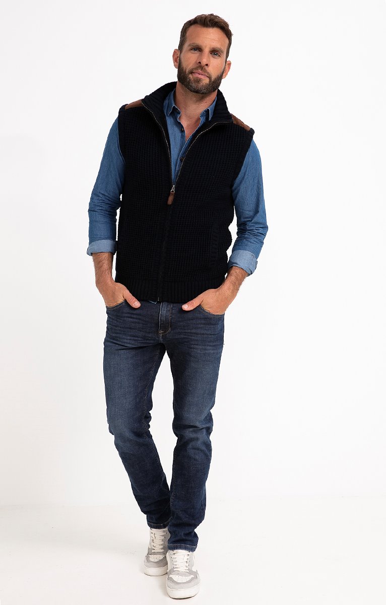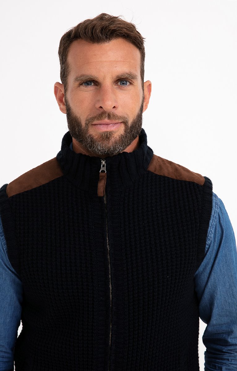 Gilet sans manches en tricot fantaisie doublé et finitions suédées. Coupe droite. Sans manches. Col montant. Fermeture zippée. 2 poches à la taille. Teinte chinée à motifs fantaisie. Maille moyenne. Doublure duveteuse. Empiècements aux épaules et tire-zip en matière suédée. Col et base en côtes.