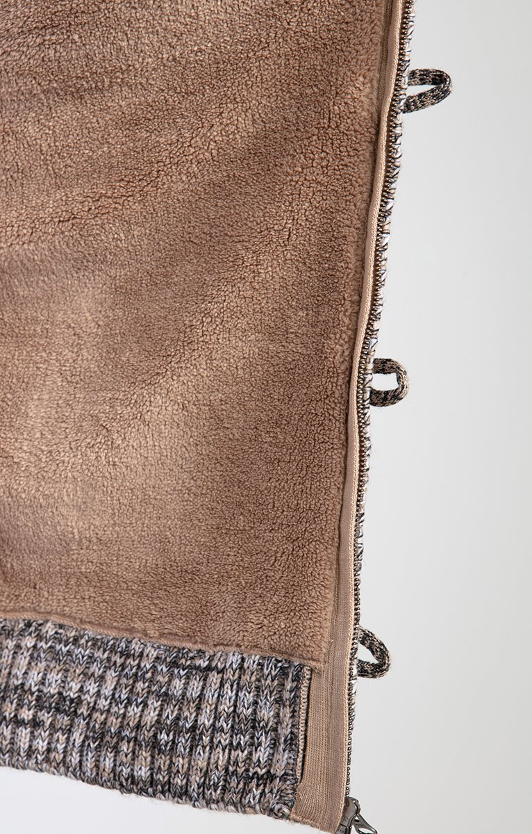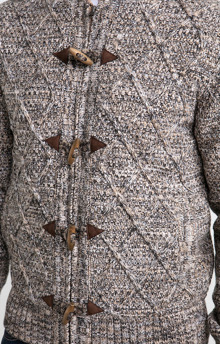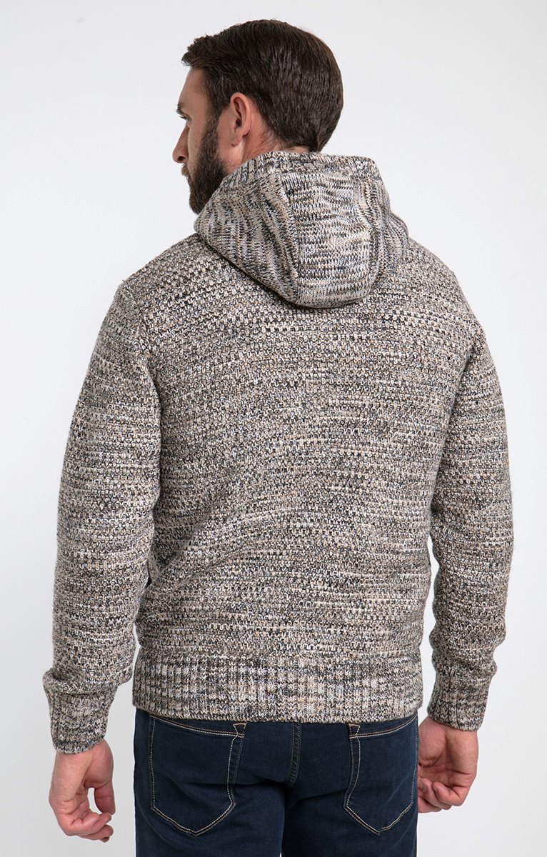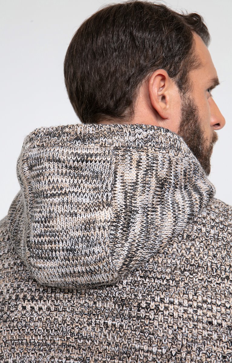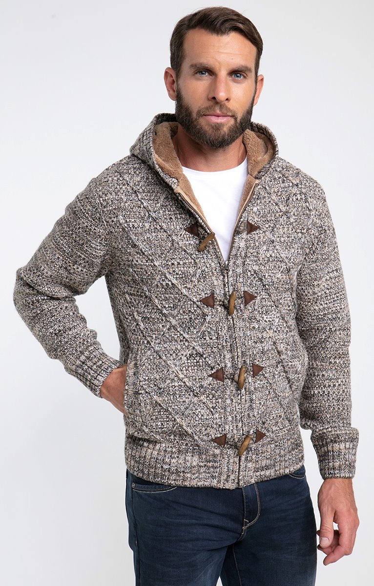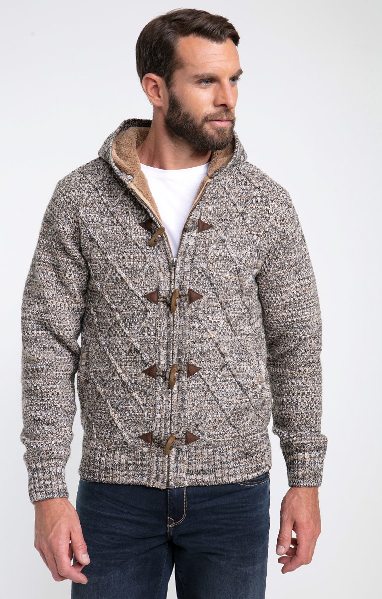 Gilet doublé à capuche en tricot fantaisie chiné. Coupe droite. Manches longues. Col à capuche. Fermeture zippée et à brandebourgs suédés avec boutons bois. 2 poches au niveau de la taille. Coloris chiné à motifs losanges devant et motifs reliefs au dos. Maille moyenne. Doublure duveteuse. Poignets et base en côtes.
