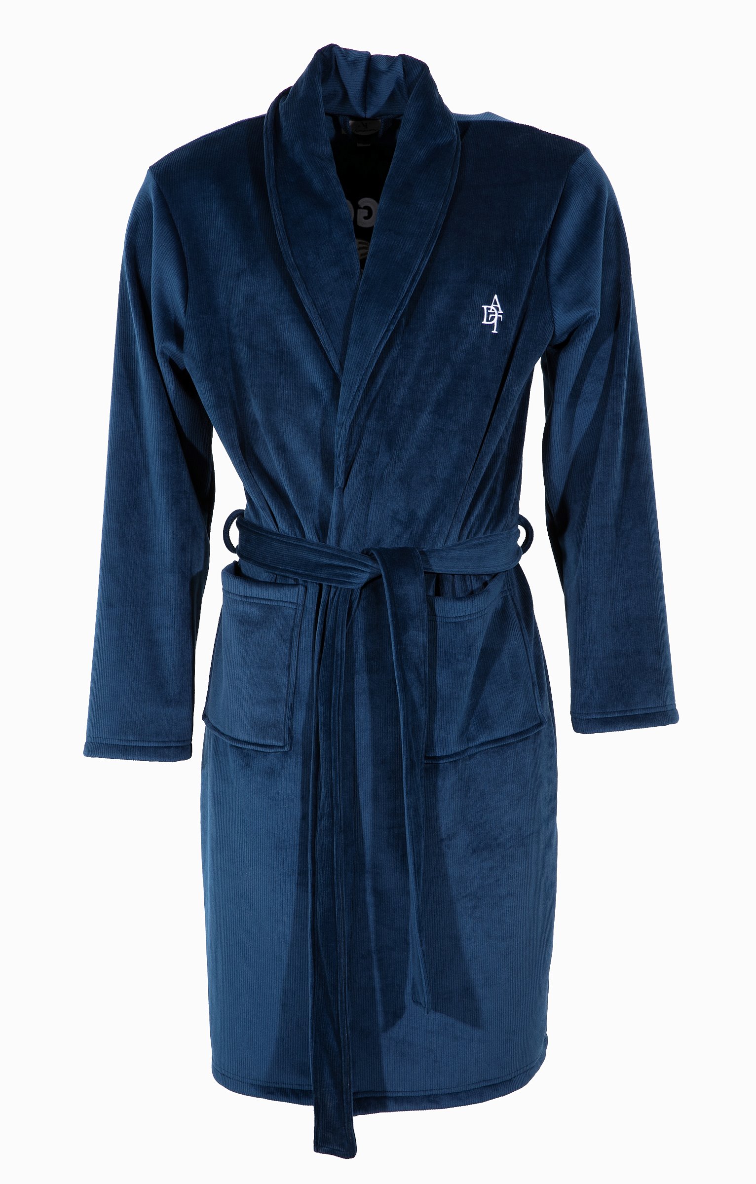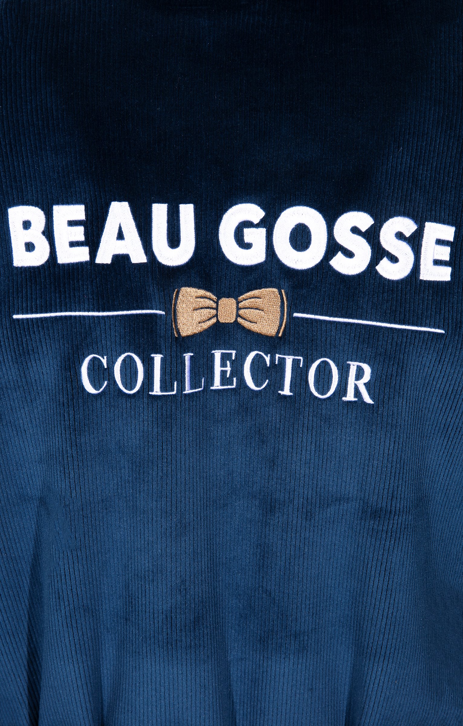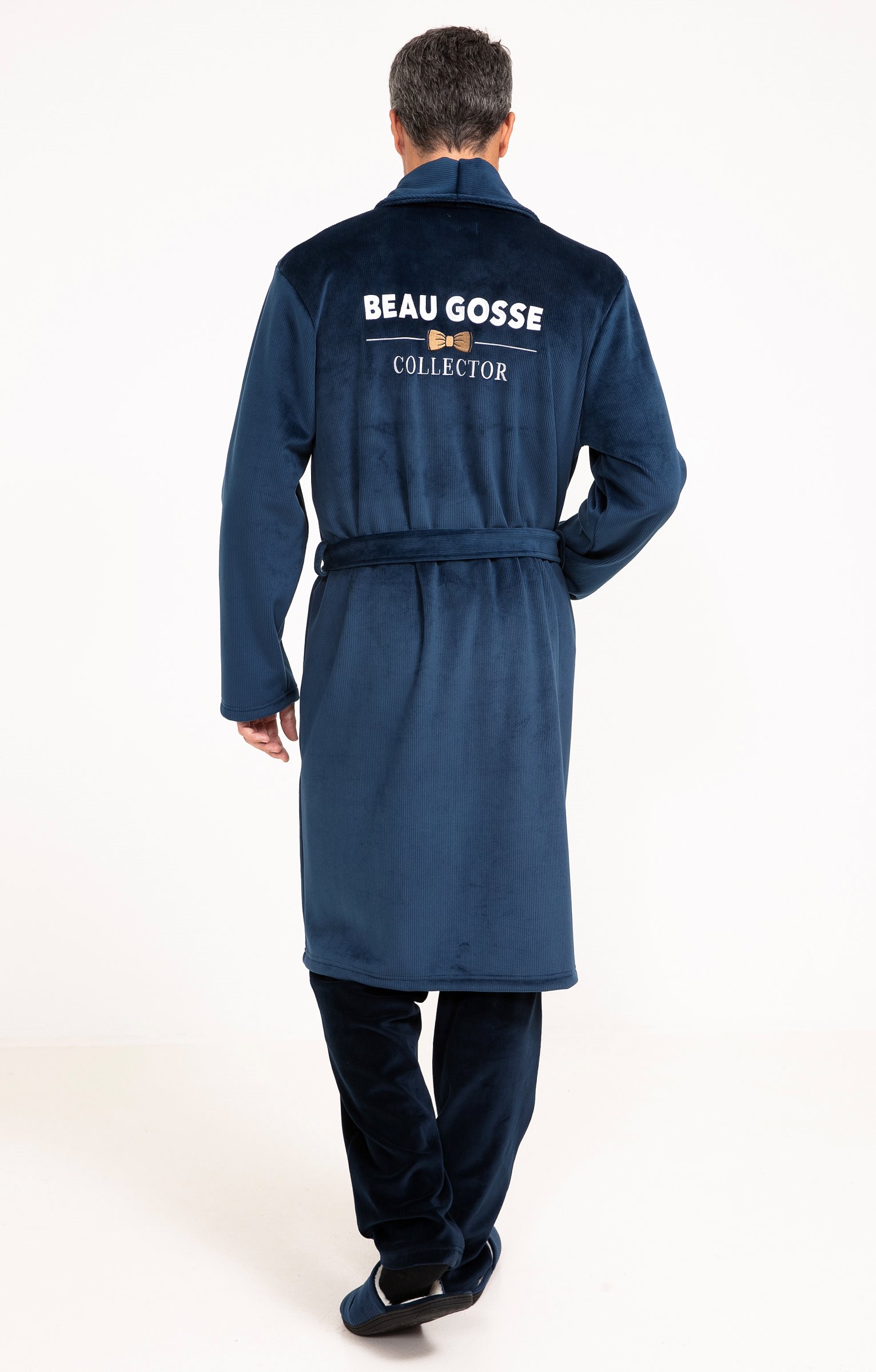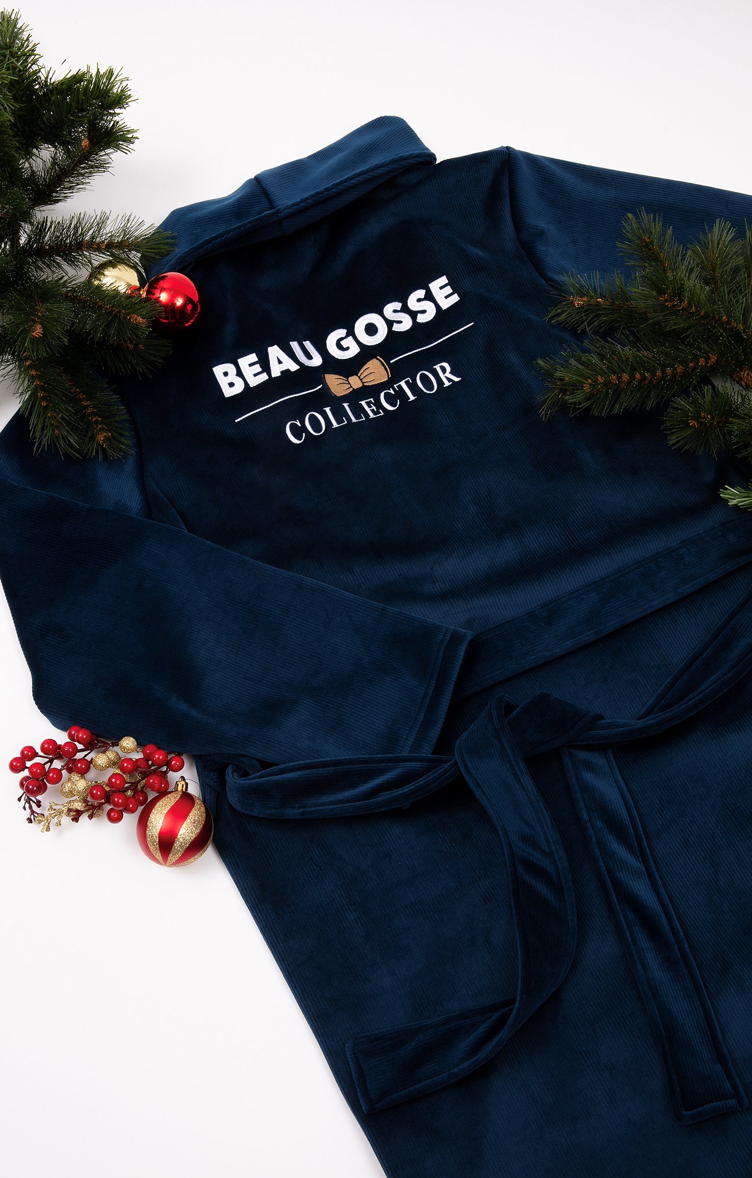 Peignoir humoristique. Coupe droite à cintrer par une ceinture ton sur ton à nouer sur la taille. Manches longues. Col châle. 2 grandes poches plaquées sur le devant. Message « Beau gosse collector » au dos, sur fond uni. Nœud brodé sous l'inscription « Beau gosse ». Logo contrastant brodé sur la poitrine. Tissu à côtes.