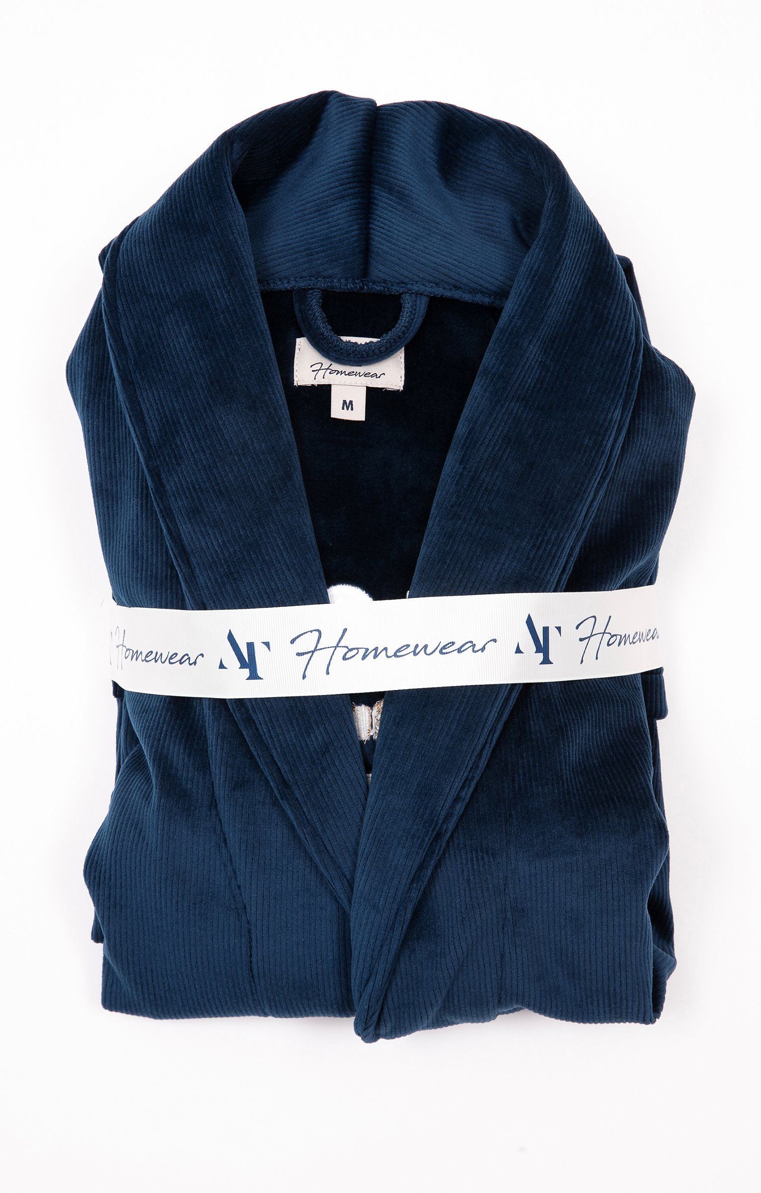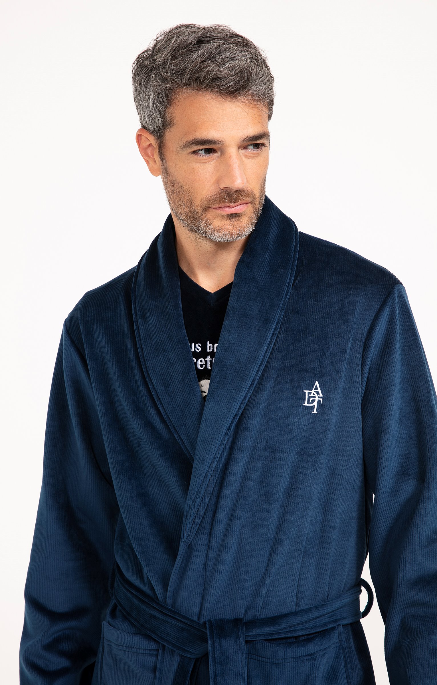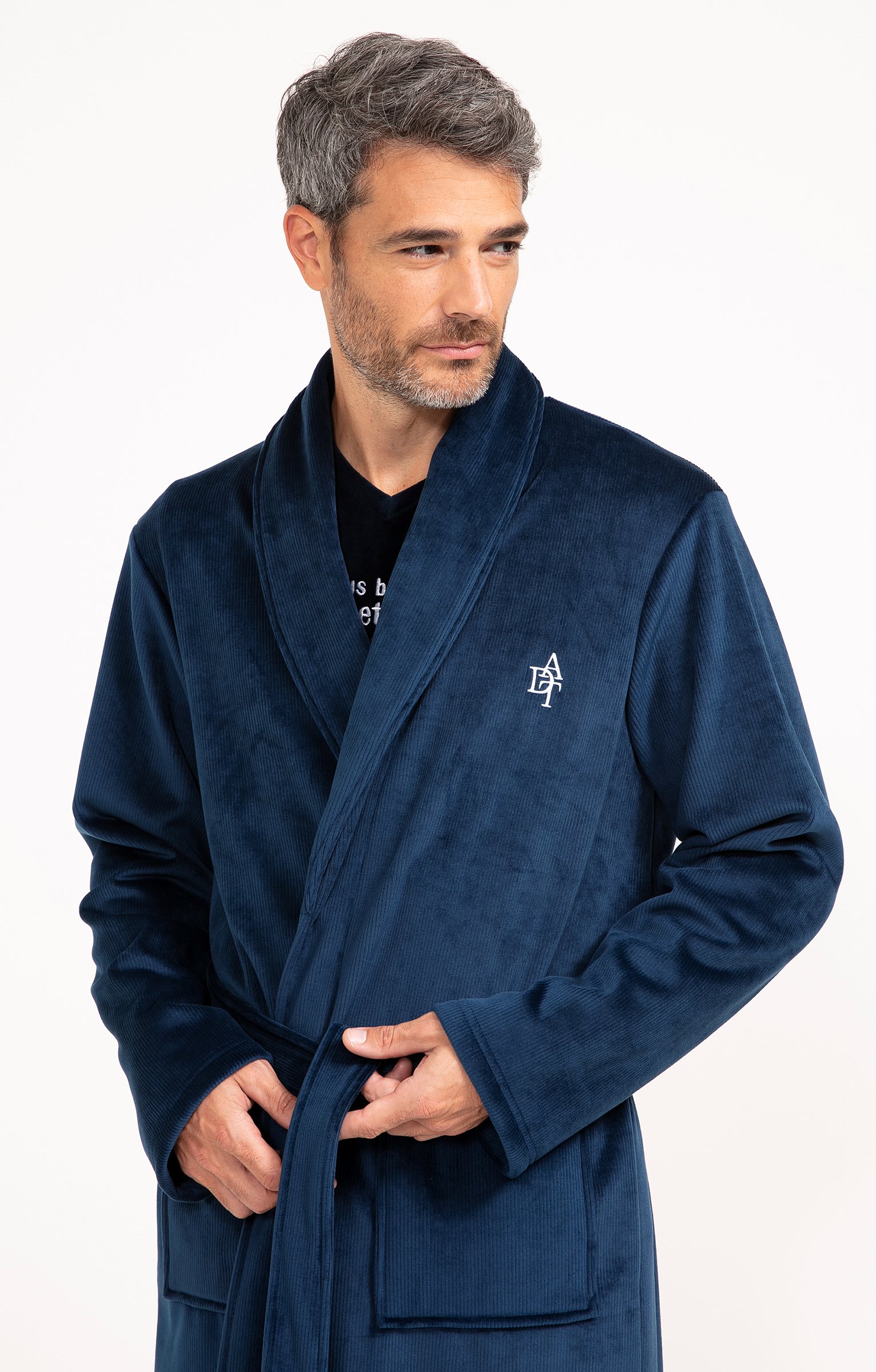 Notre mannequin Mathieu mesure 1m84 et porte un peignoir taille M.