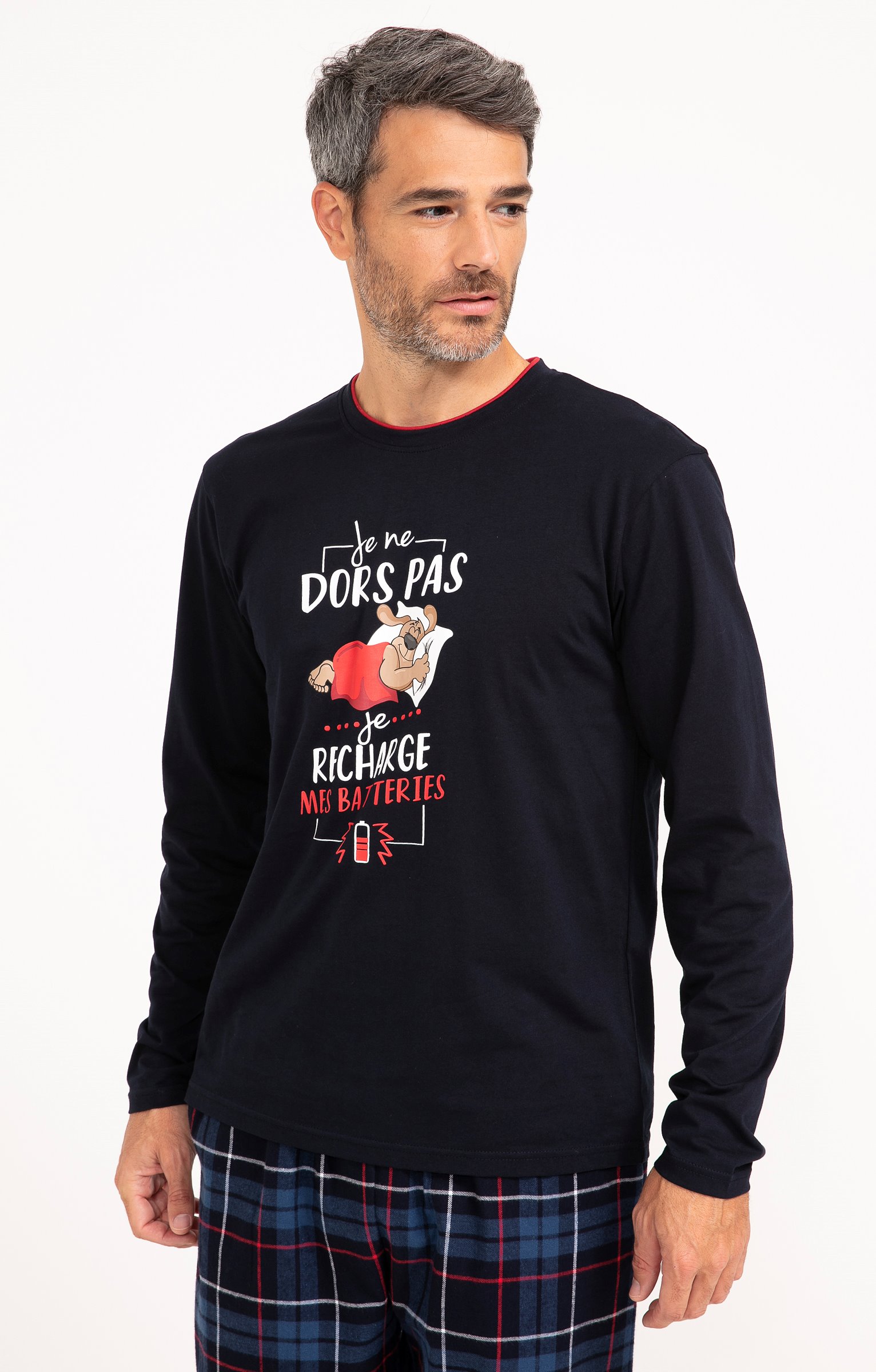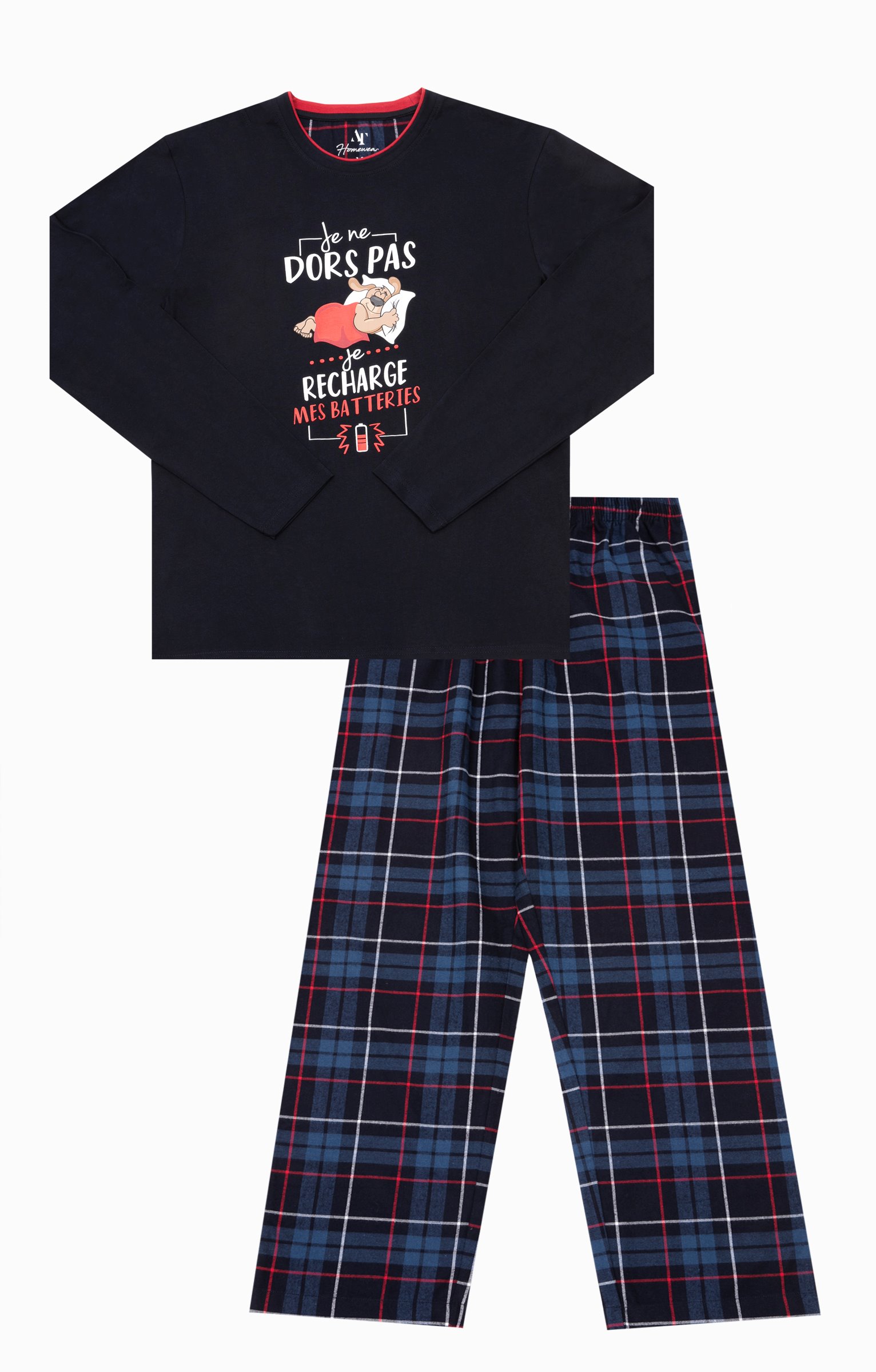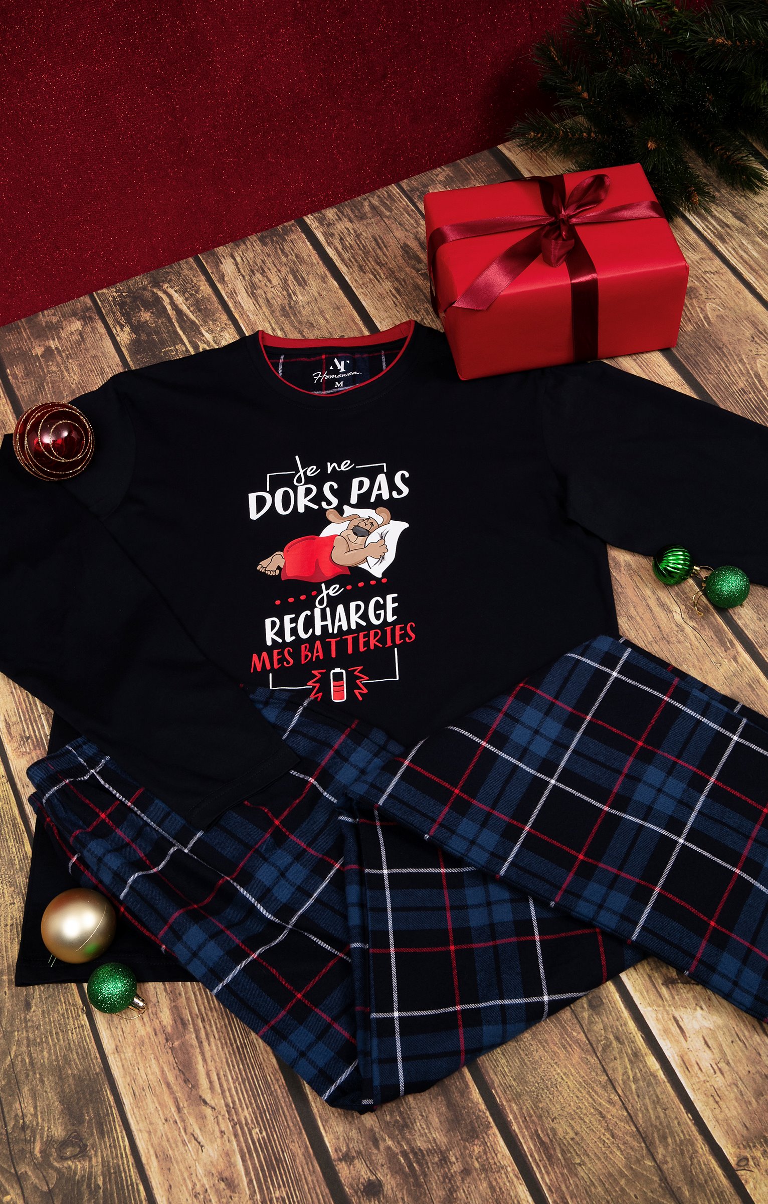Pyjama long à message humoristique. Collection d'idées cadeaux de Noël. T-shirt droit. Manches longues. Col rond bicolore. Imprimé chien endormi et messages «?Je ne dors pas… Je recharge mes batteries…?» devant. Pantalon à carreaux multicolores tissés. Maille jersey et tissu souple. Taille élastiquée. 2 poches latérales. Pyjama vendu dans son pochon avec fermeture par des liens à nouer.