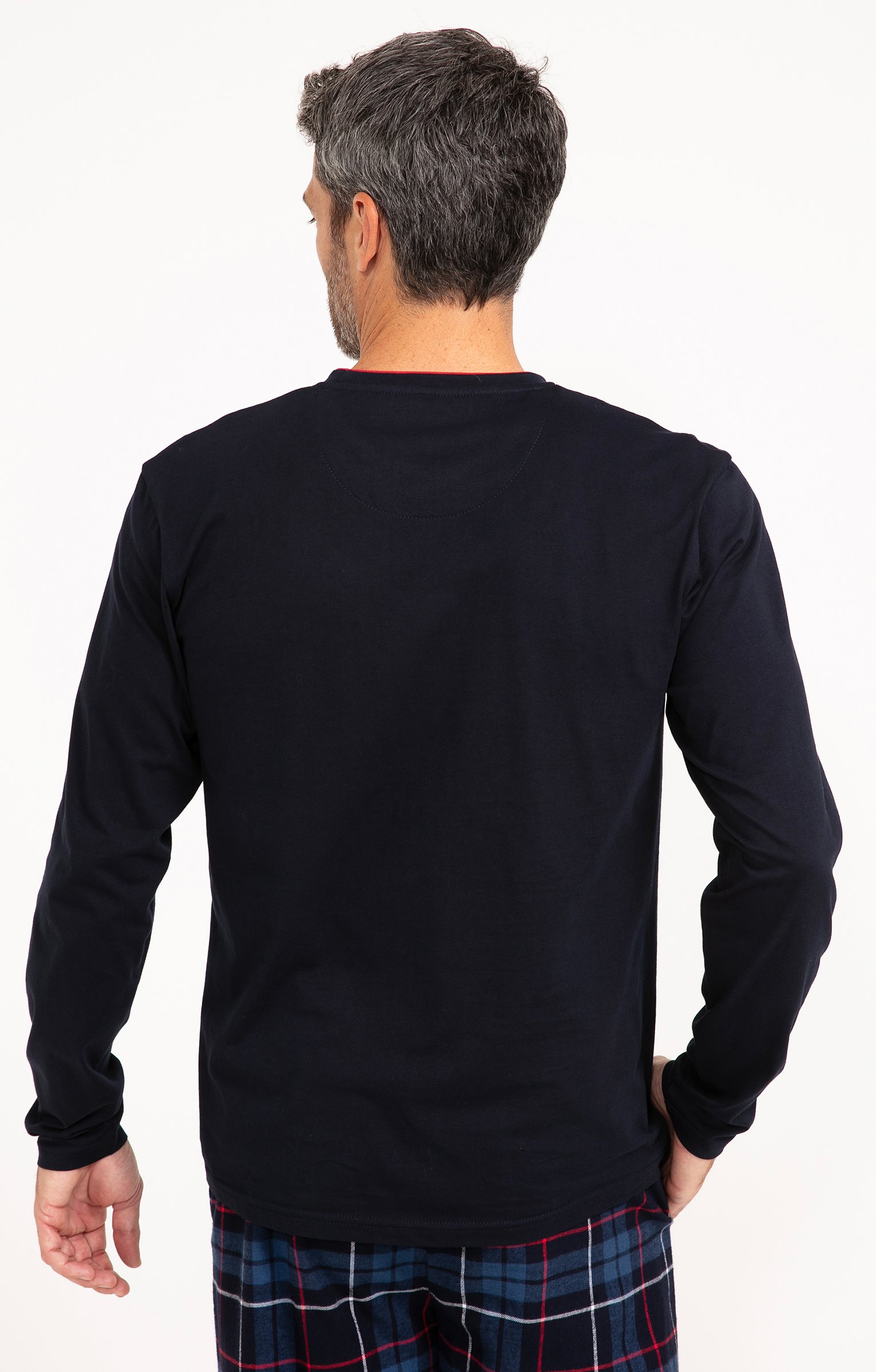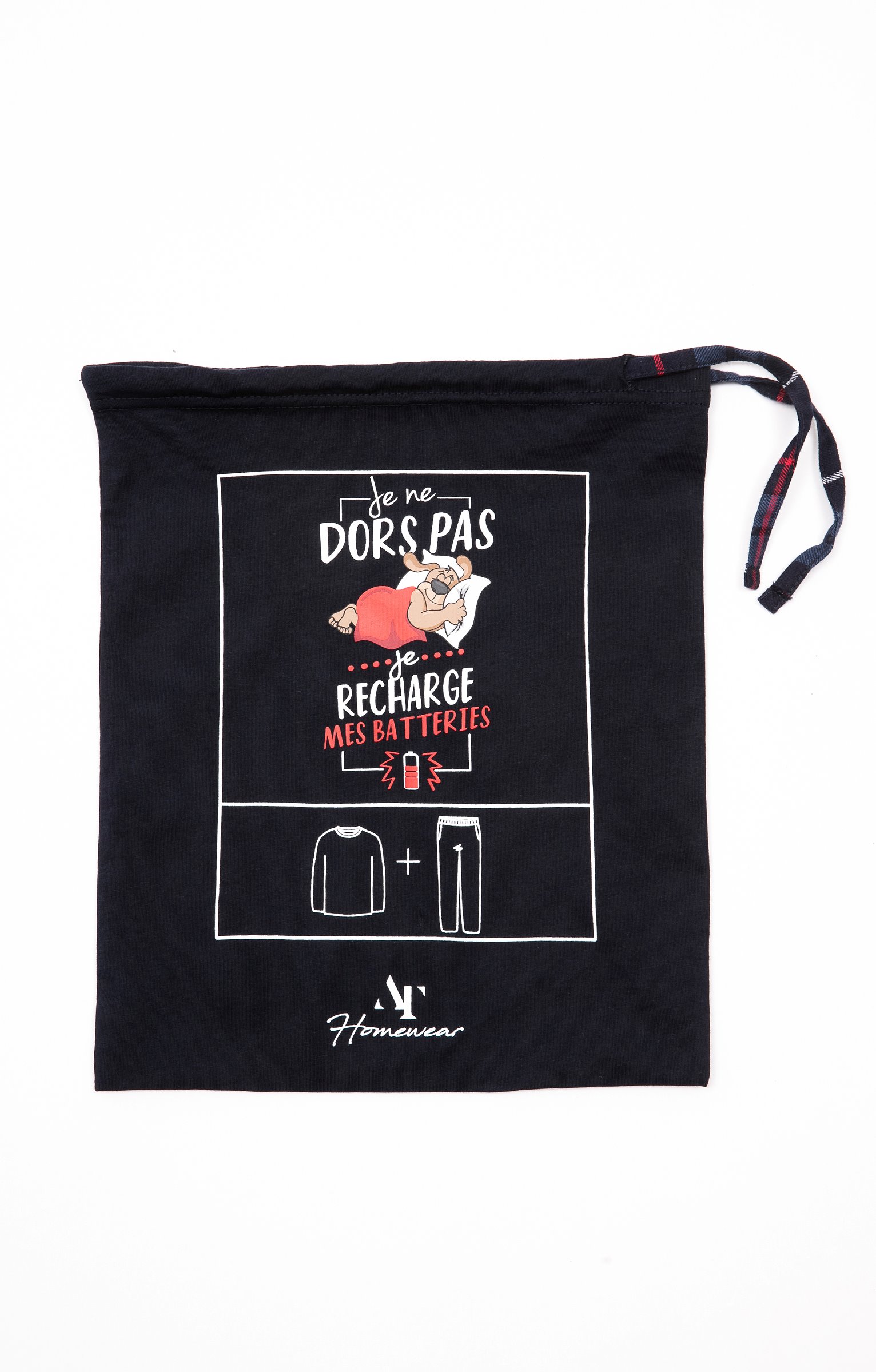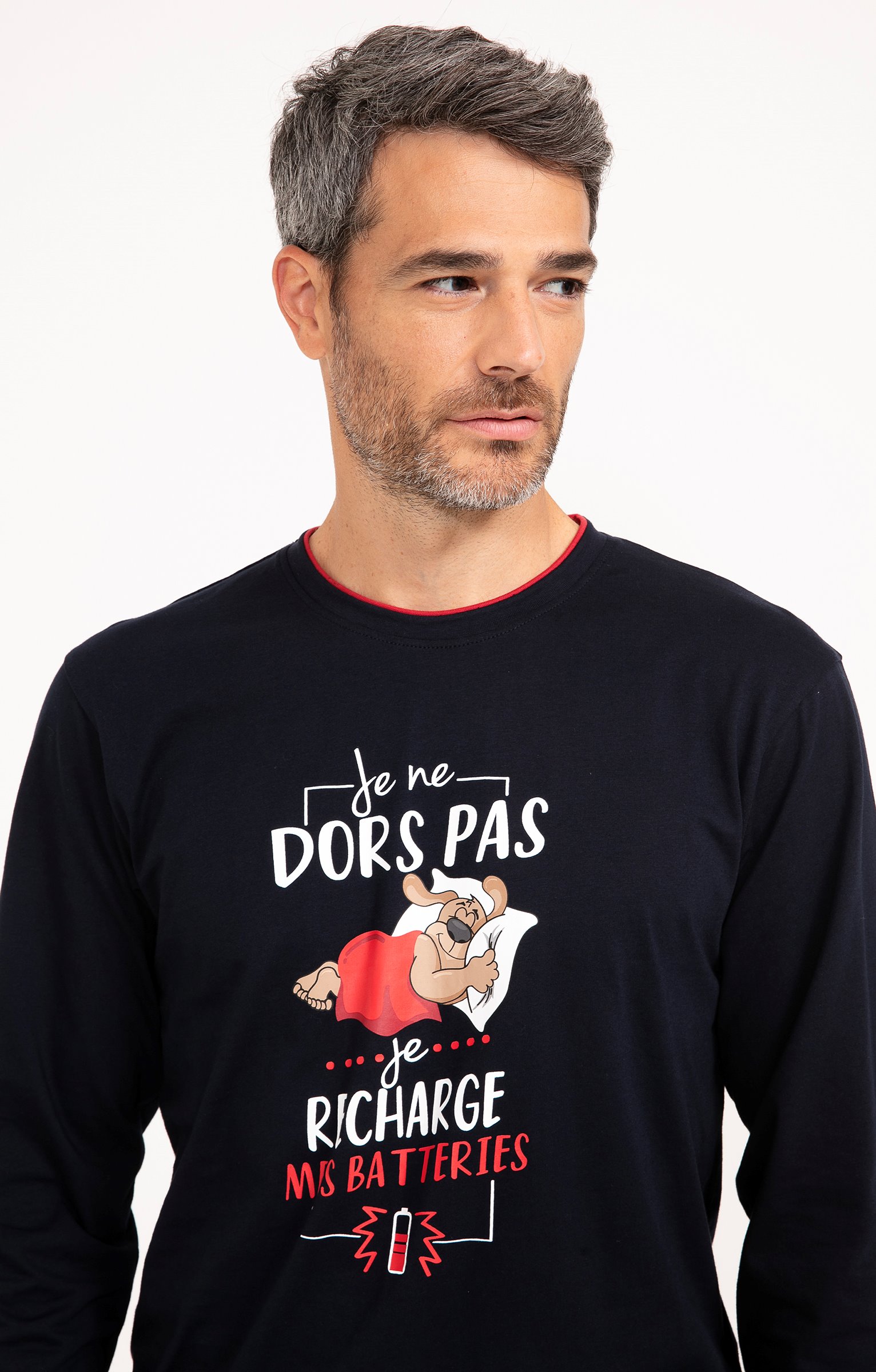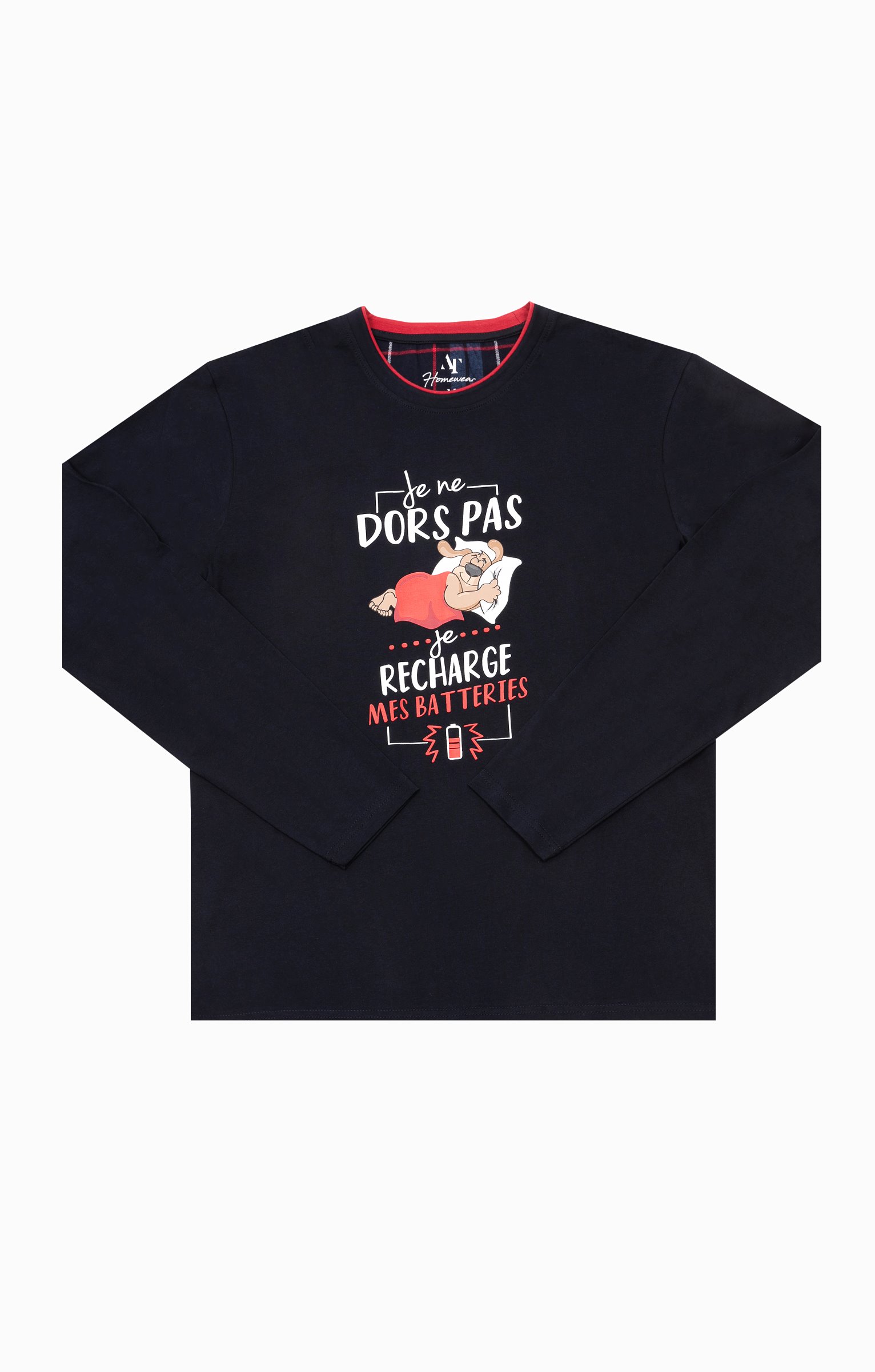 Pyjama long à message humoristique. Collection d'idées cadeaux de Noël. T-shirt droit. Manches longues. Col rond bicolore. Imprimé chien endormi et messages «?Je ne dors pas… Je recharge mes batteries…?» devant. Pantalon à carreaux multicolores tissés. Maille jersey et tissu souple. Taille élastiquée. 2 poches latérales. Pyjama vendu dans son pochon avec fermeture par des liens à nouer.
