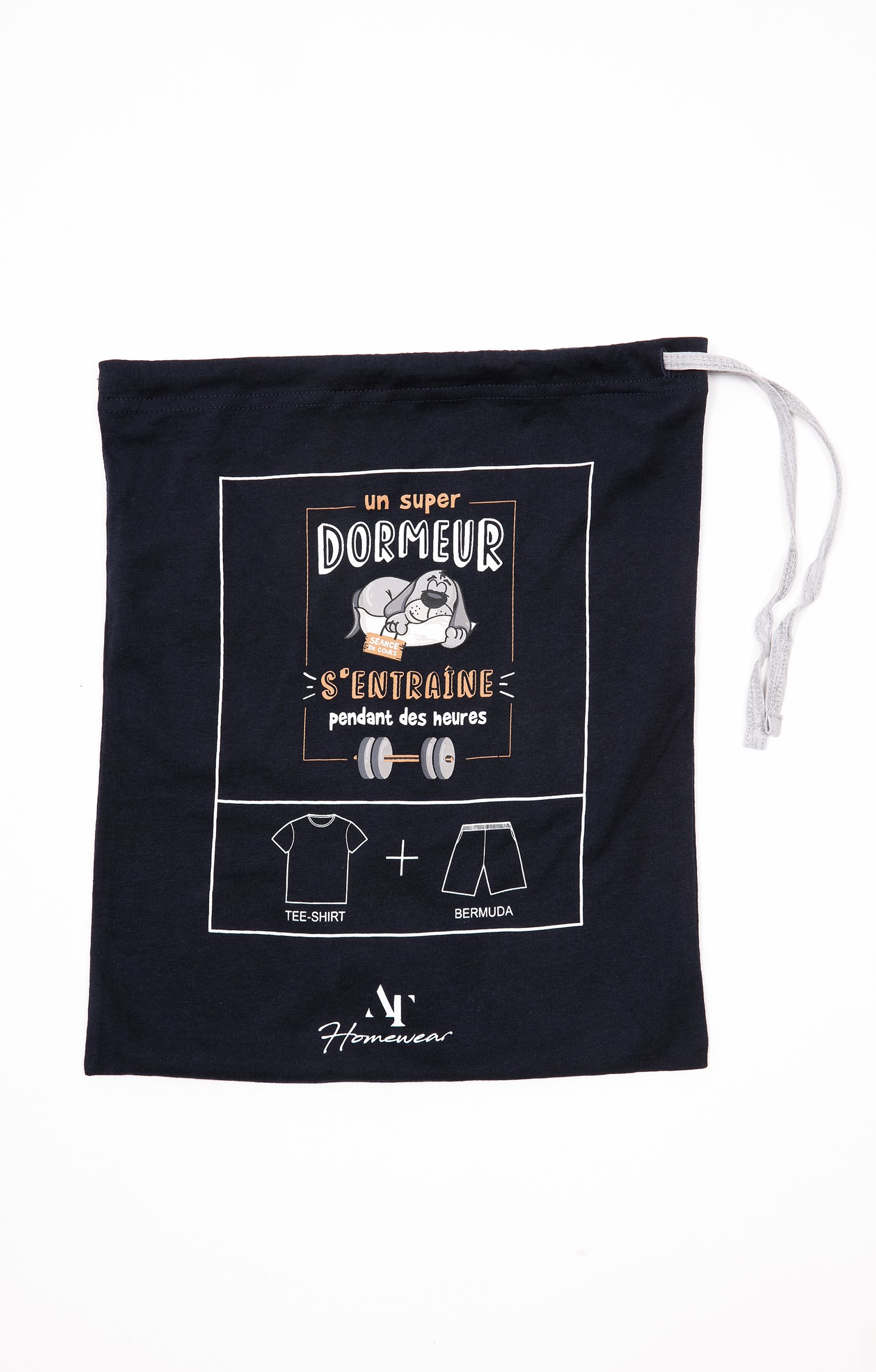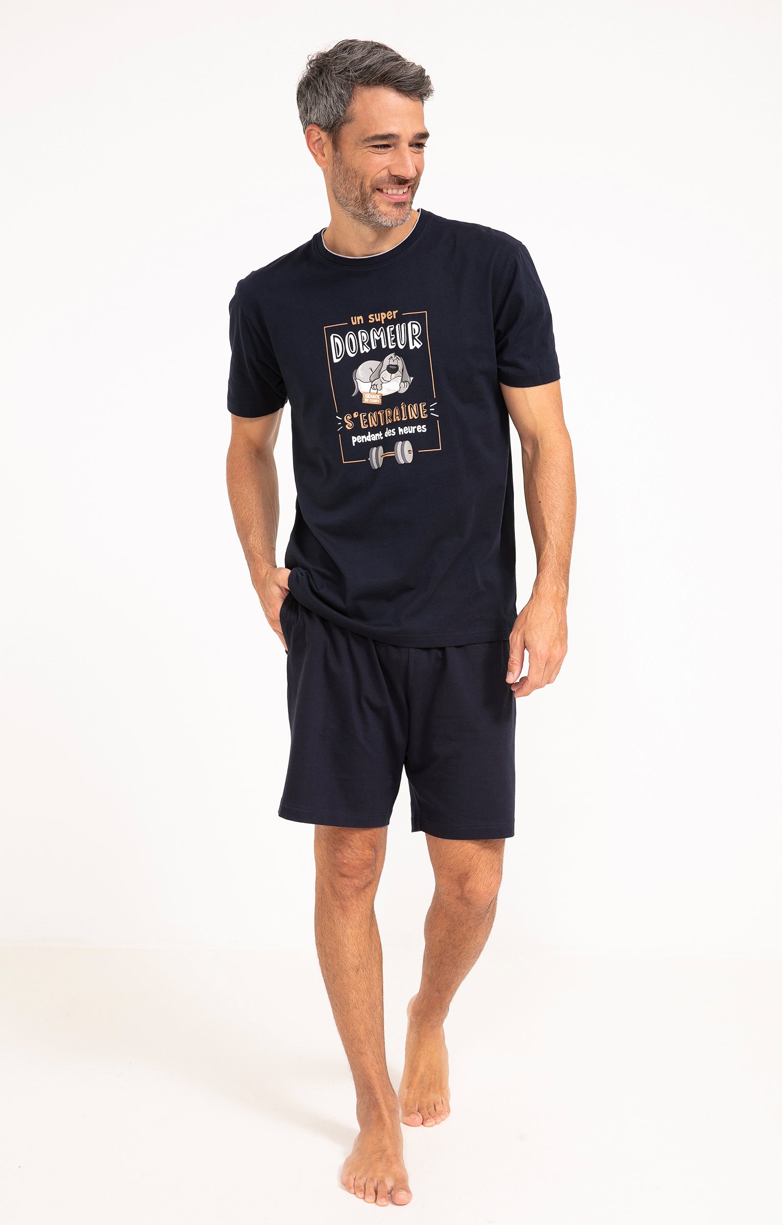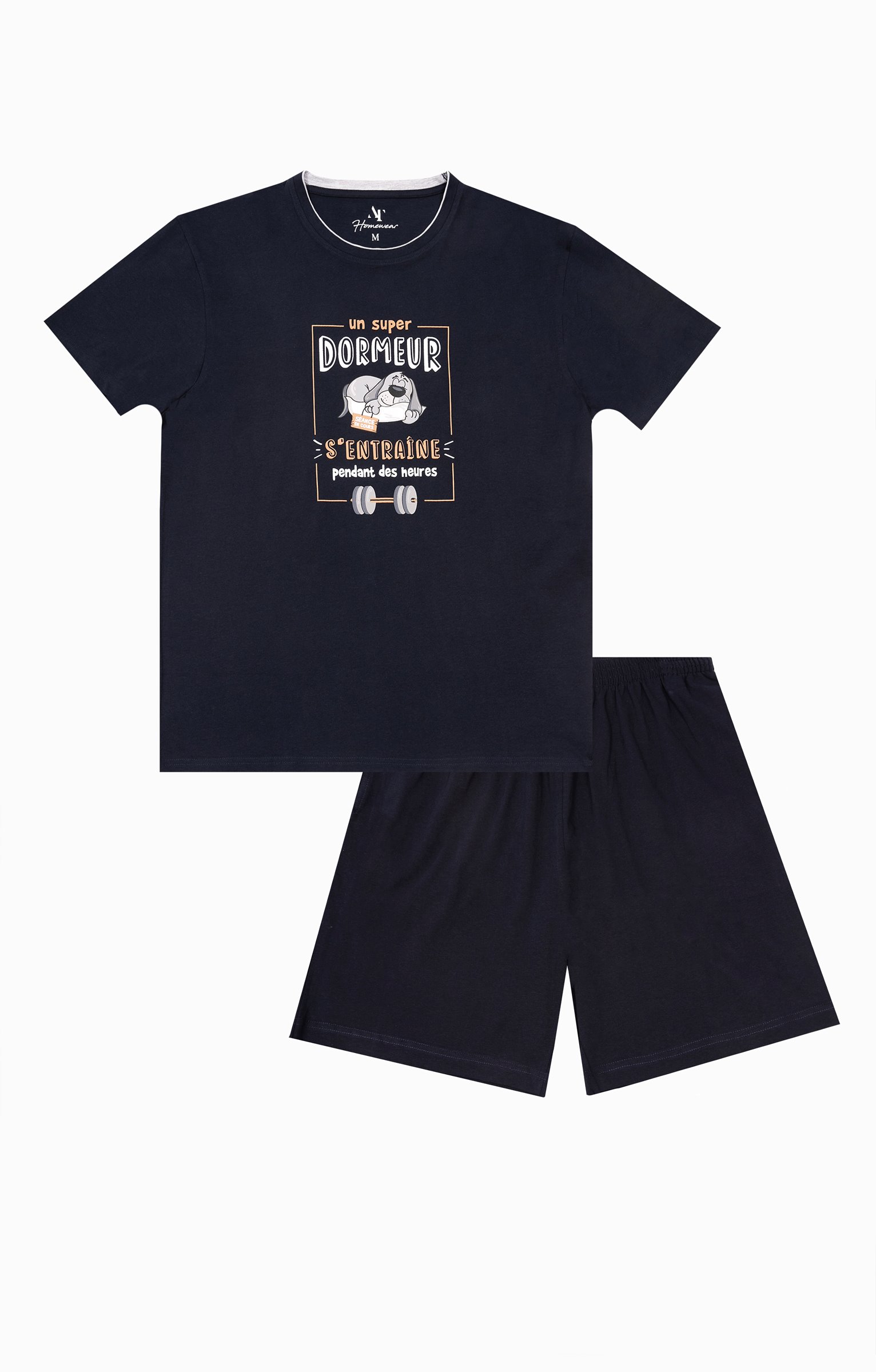 Pyjama short à message humoristique. Collection d'idées cadeaux de Noël. T-shirt droit. Manches courtes. Col rond. Imprimé chien endormi et message «?Un super dormeur s'entraîne pendant des heures?» devant. Maille jersey. Short uni contrastant. Taille élastiquée. 2 poches latérales. Pyjama vendu dans son pochon avec fermeture par des liens à nouer.