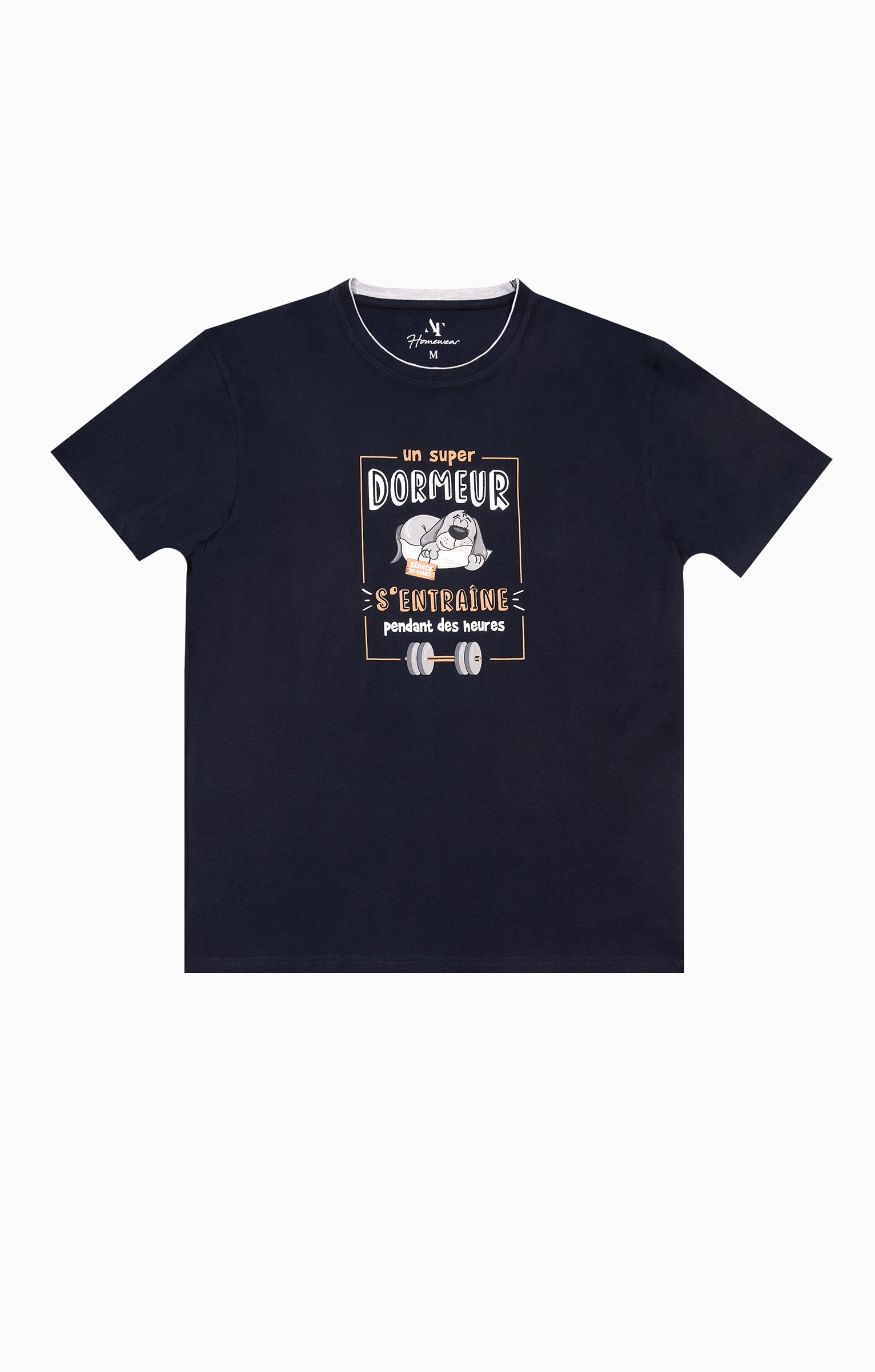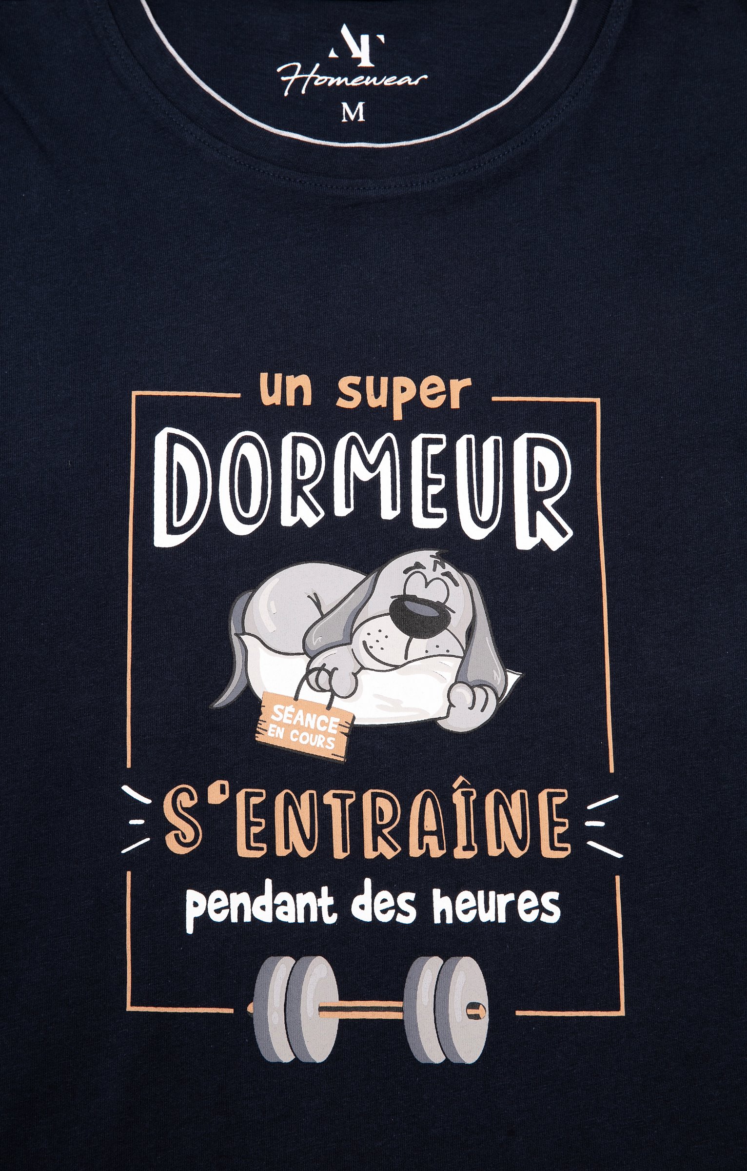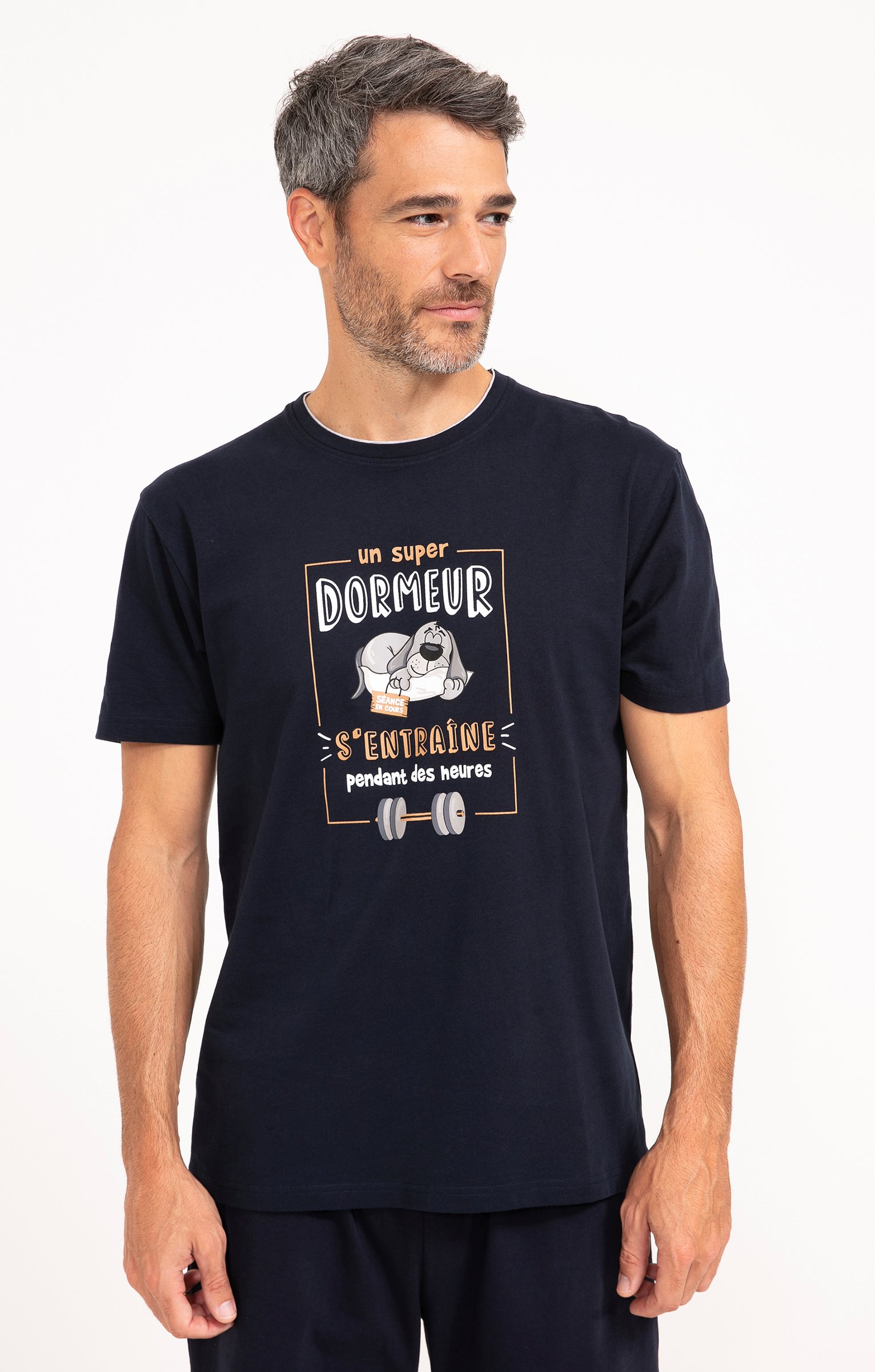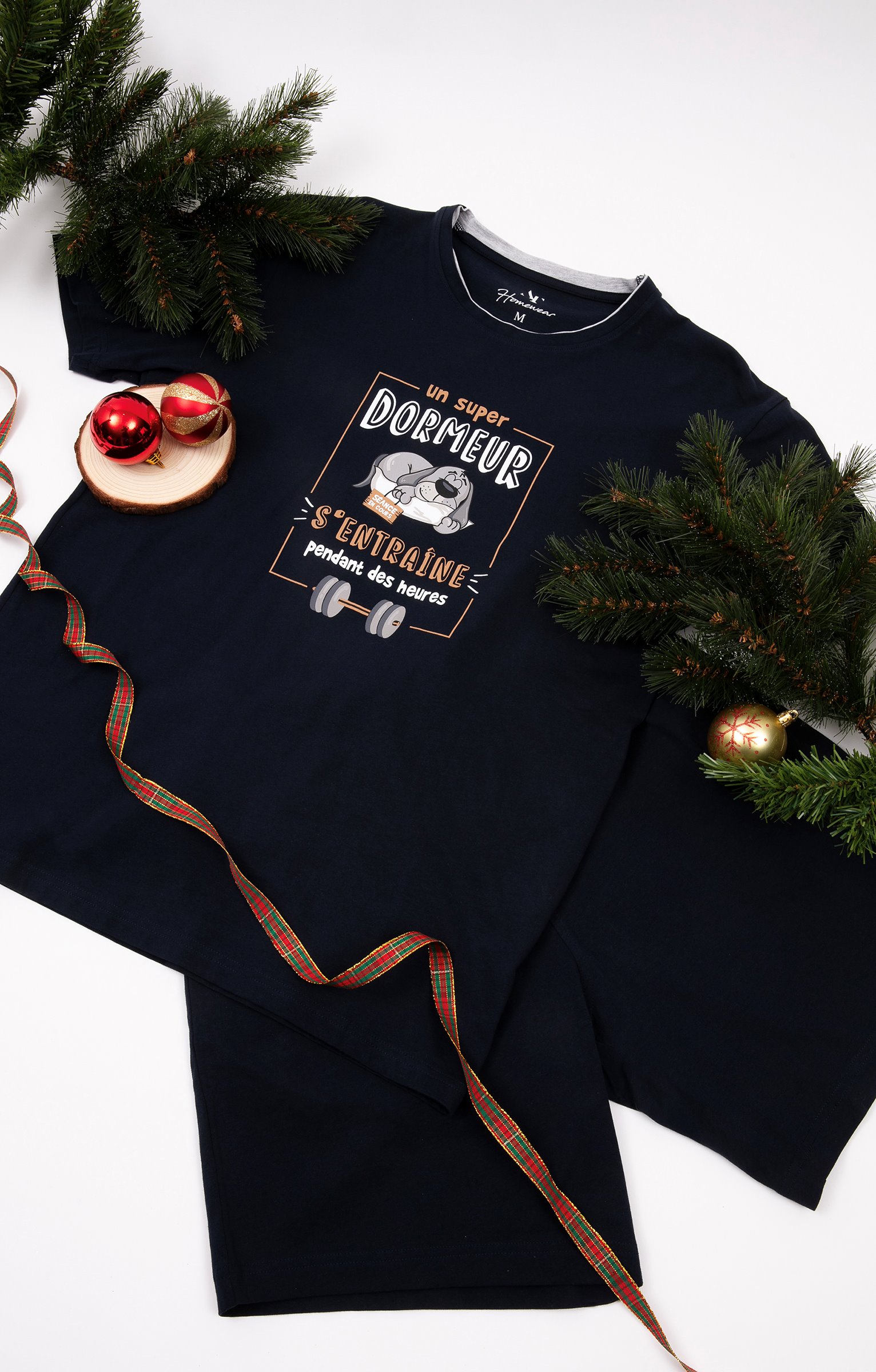 Pyjama short à message humoristique. Collection d'idées cadeaux de Noël. T-shirt droit. Manches courtes. Col rond. Imprimé chien endormi et message «?Un super dormeur s'entraîne pendant des heures?» devant. Maille jersey. Short uni contrastant. Taille élastiquée. 2 poches latérales. Pyjama vendu dans son pochon avec fermeture par des liens à nouer.