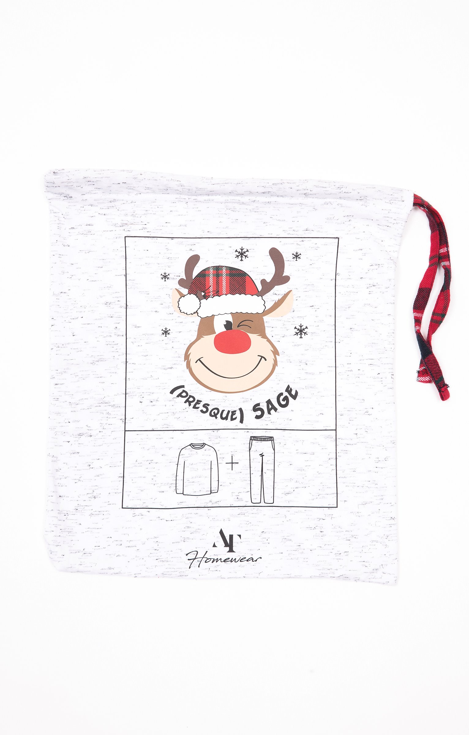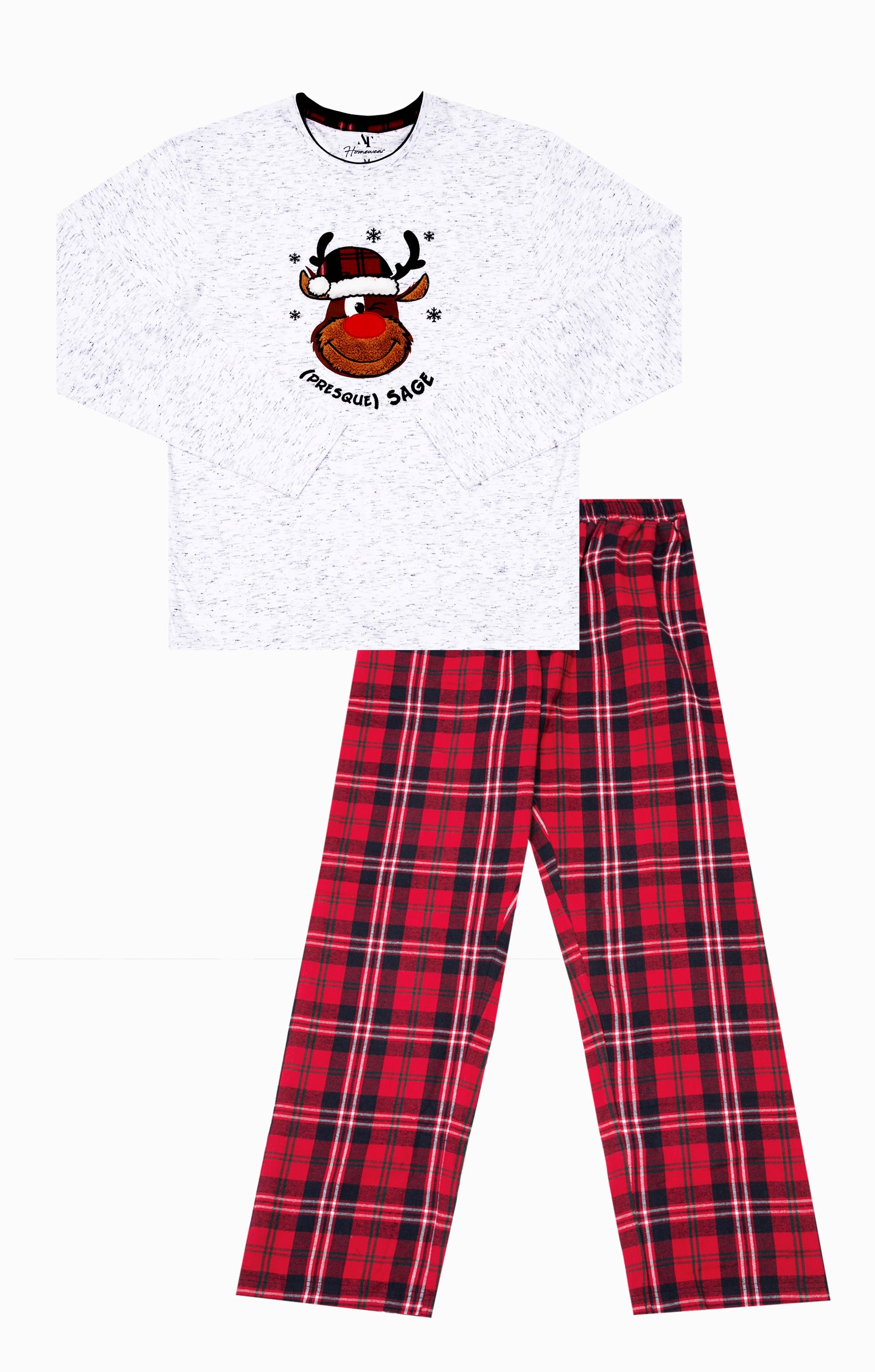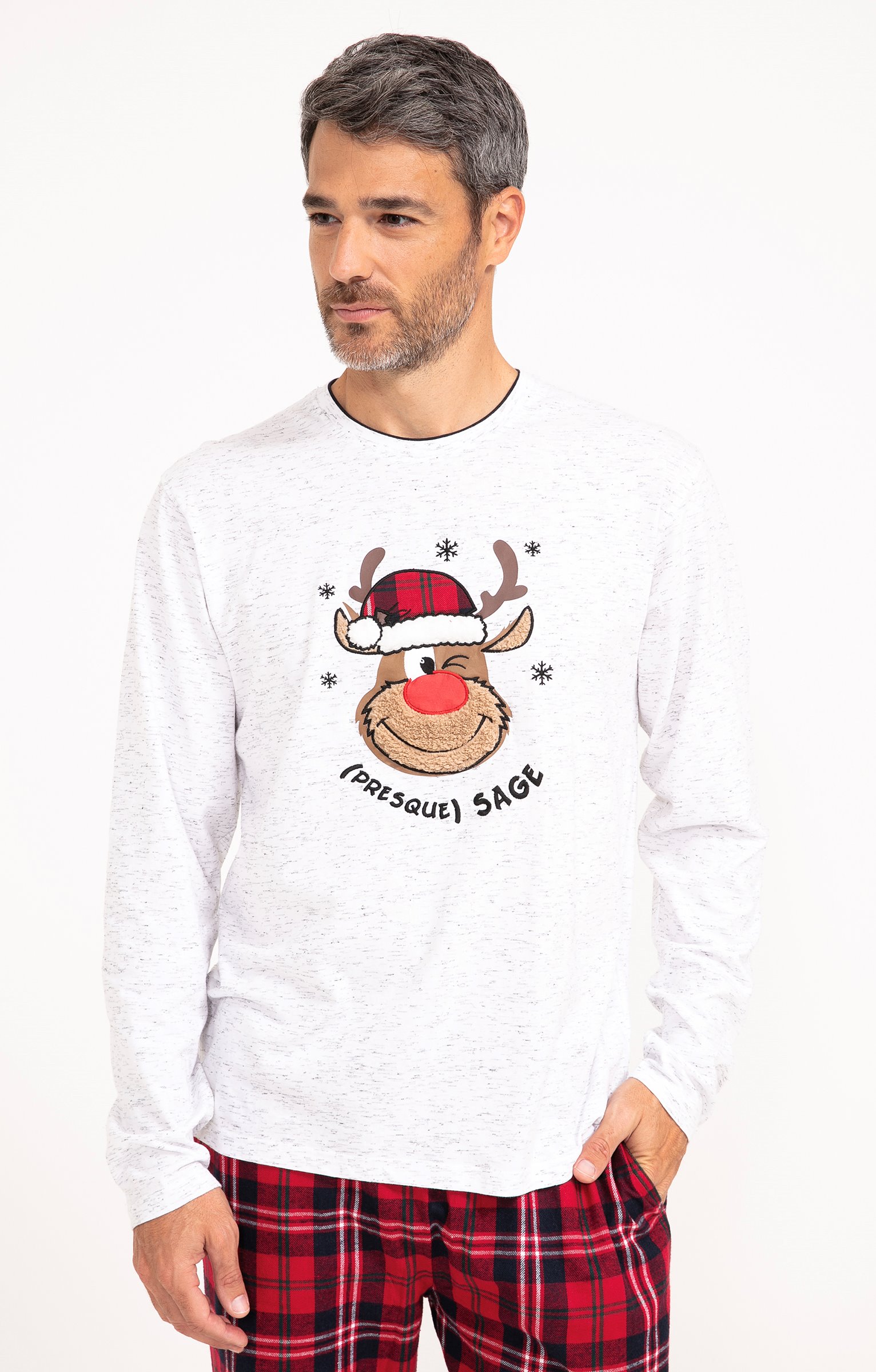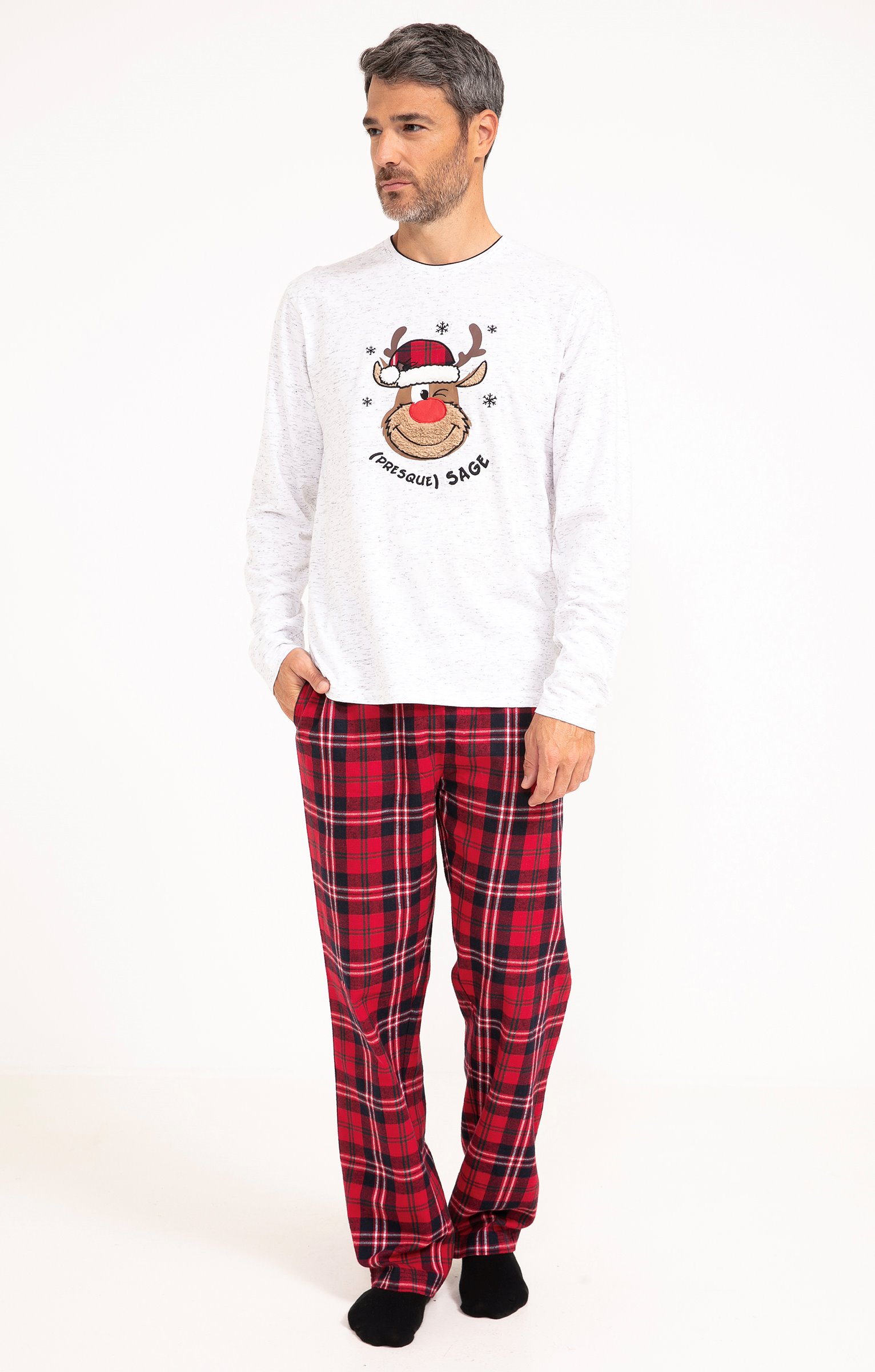 Pyjama long dépareillé. T-shirt coupe droite. Manches longues. Double col rond. Motif renne avec détails en tissu à carreaux et poilu devant. Message « (Presque) sage » brodé. Tissu en maille chinée. Pantalon coupe droite. Taille élastiquée. 2 poches italiennes devant. Motifs à carreaux. Tissu souple. Pochon de rangement assorti au t-shirt.