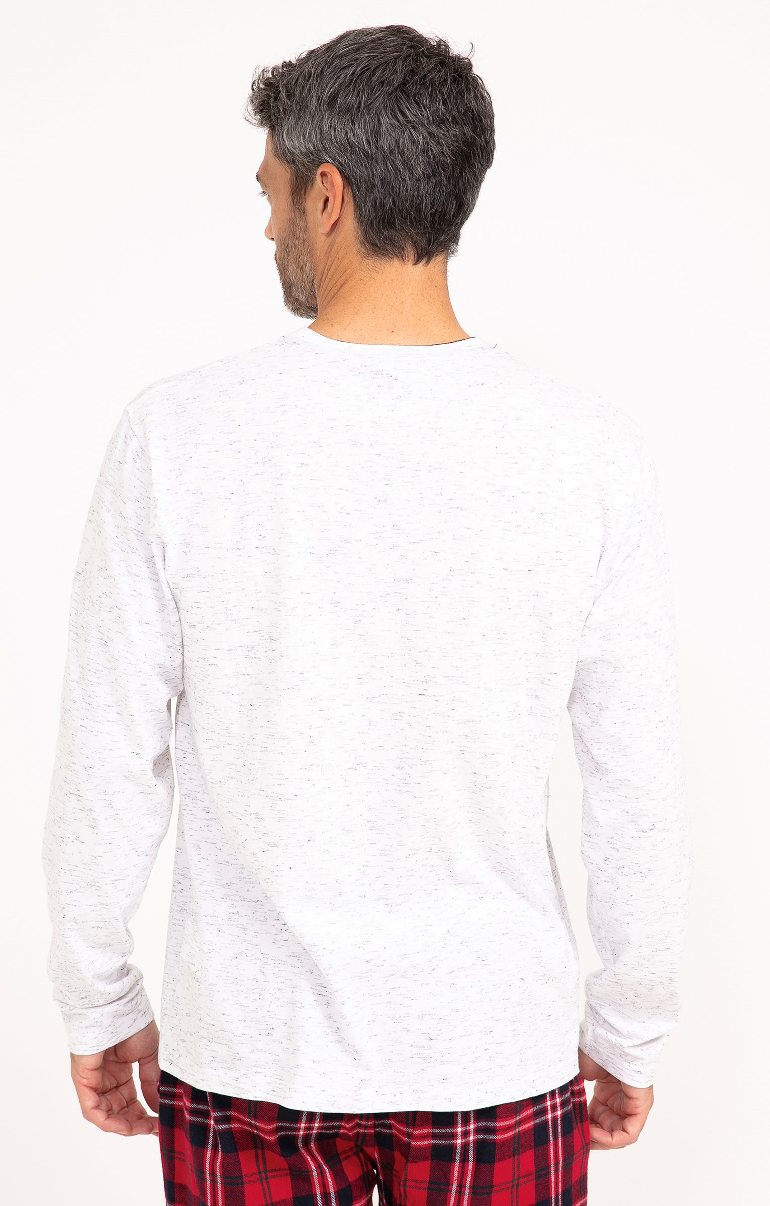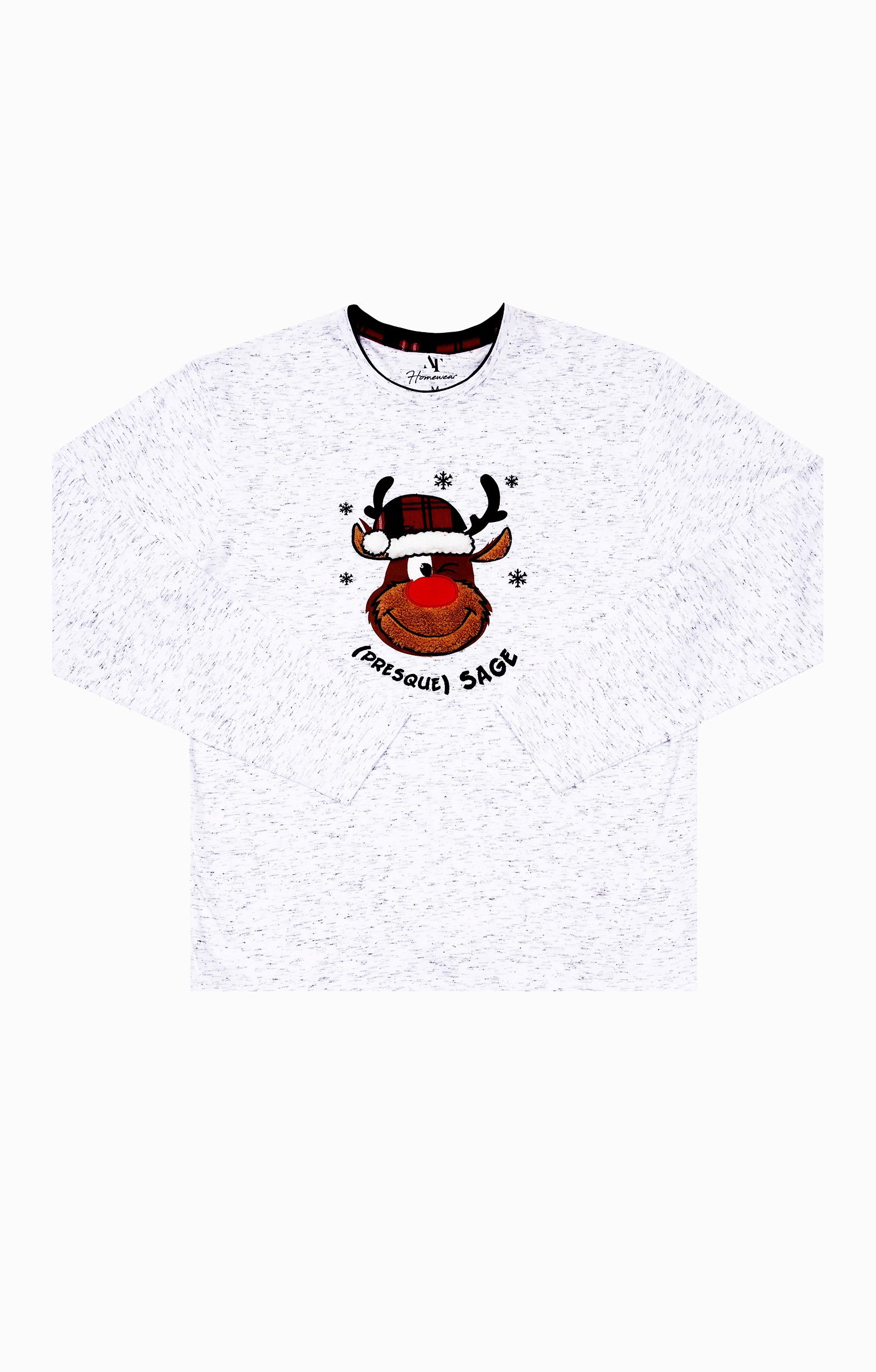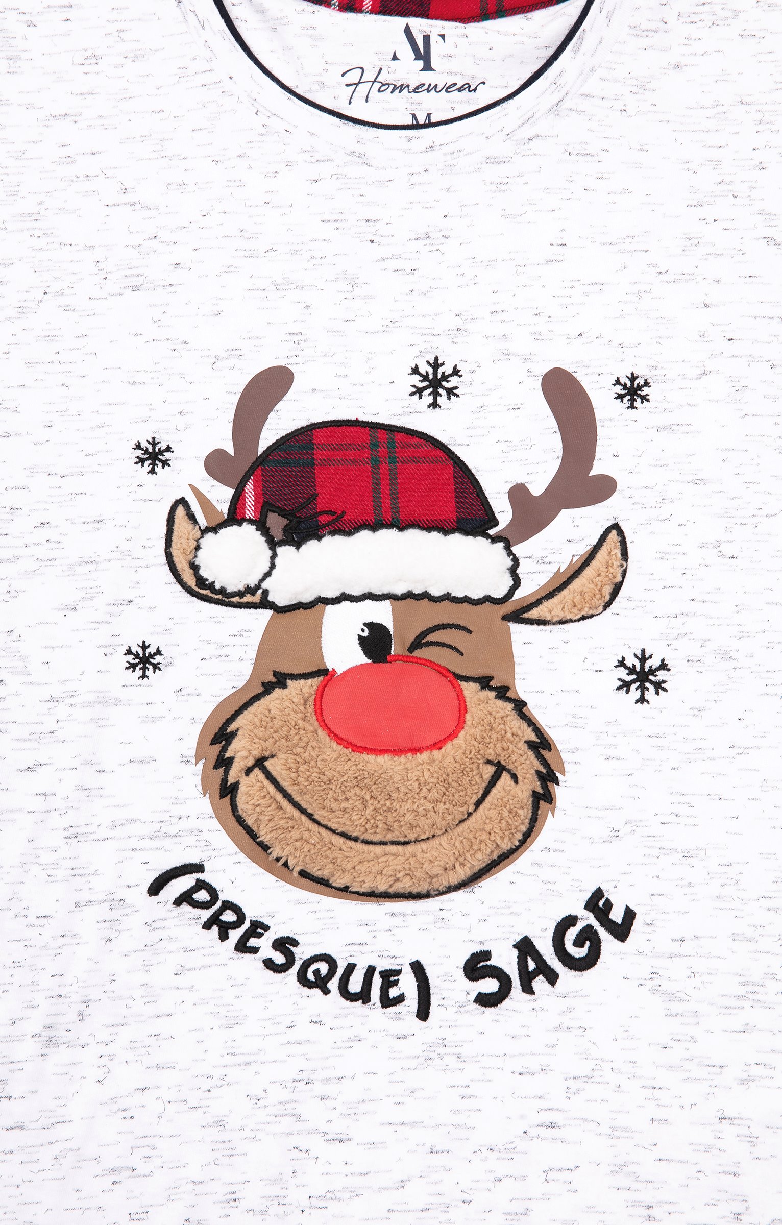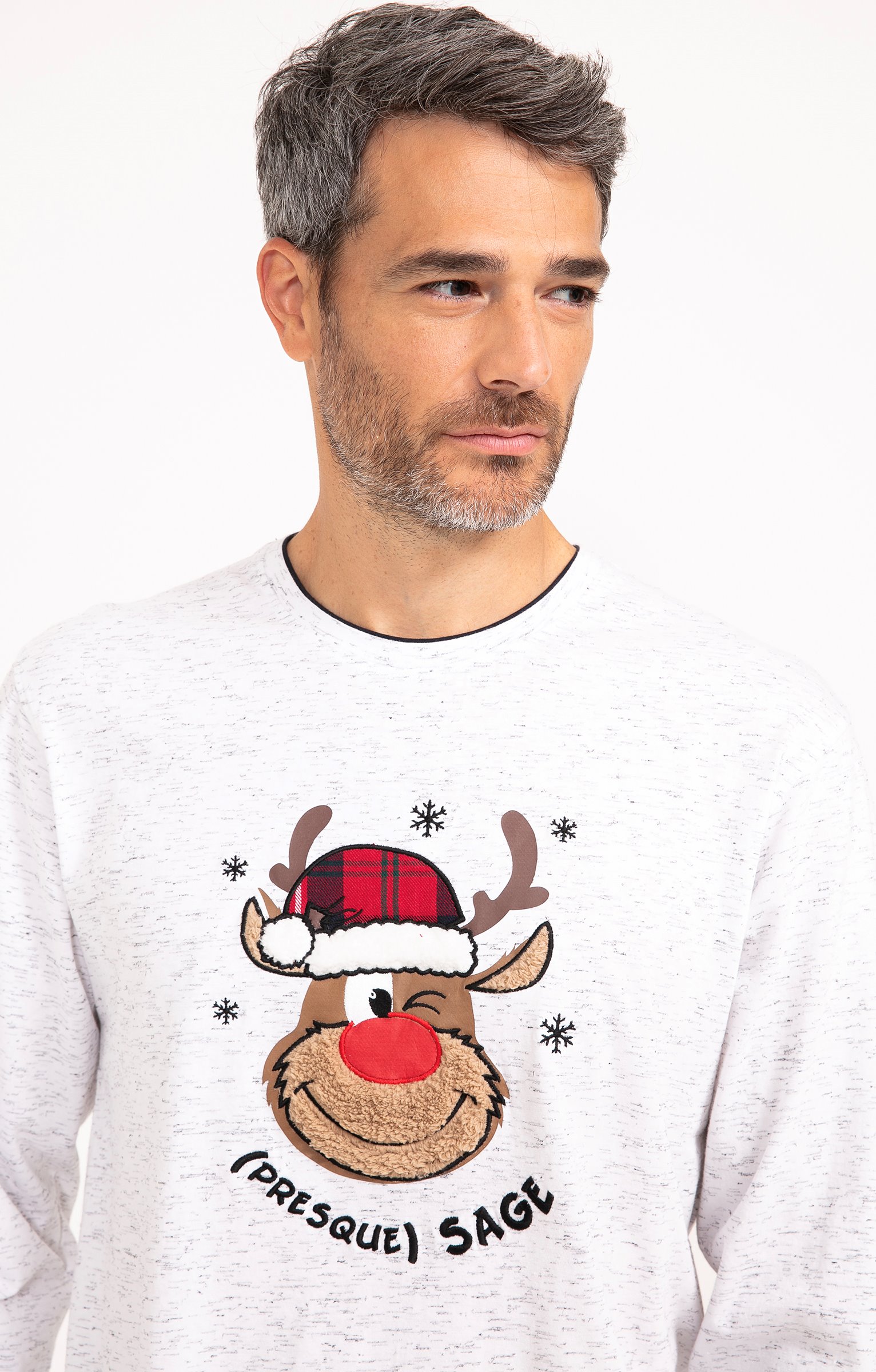 Pyjama long dépareillé. T-shirt coupe droite. Manches longues. Double col rond. Motif renne avec détails en tissu à carreaux et poilu devant. Message « (Presque) sage » brodé. Tissu en maille chinée. Pantalon coupe droite. Taille élastiquée. 2 poches italiennes devant. Motifs à carreaux. Tissu souple. Pochon de rangement assorti au t-shirt.