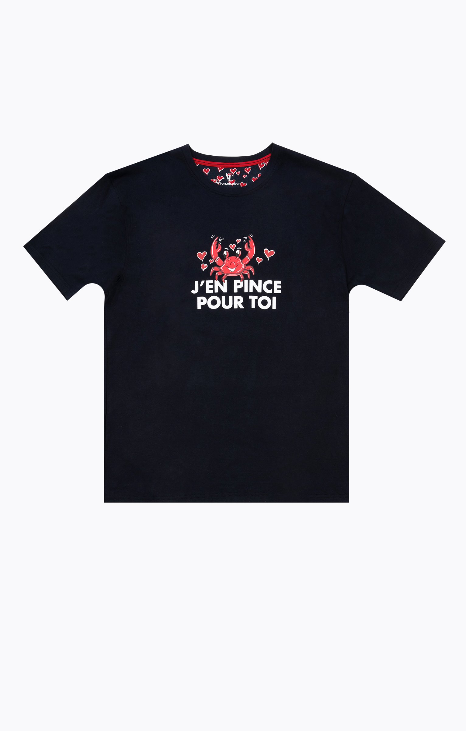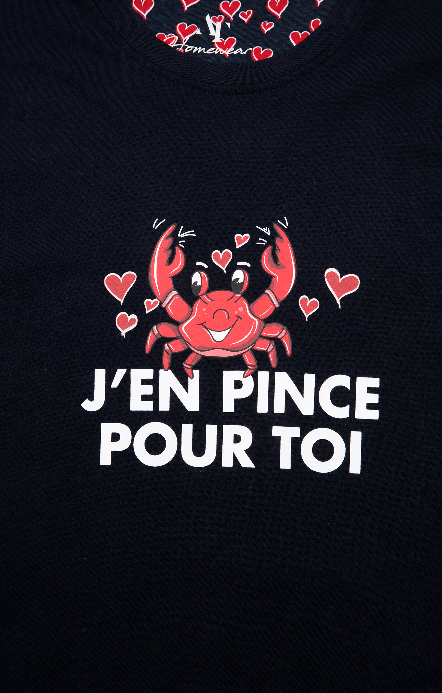 - T-shirt : Coloris bleu marine, coupe droite. Message « J’en pince pour toi » placé sur le buste, avec un motif crabe rouge. Col rond et manches courtes. Matière extensible.