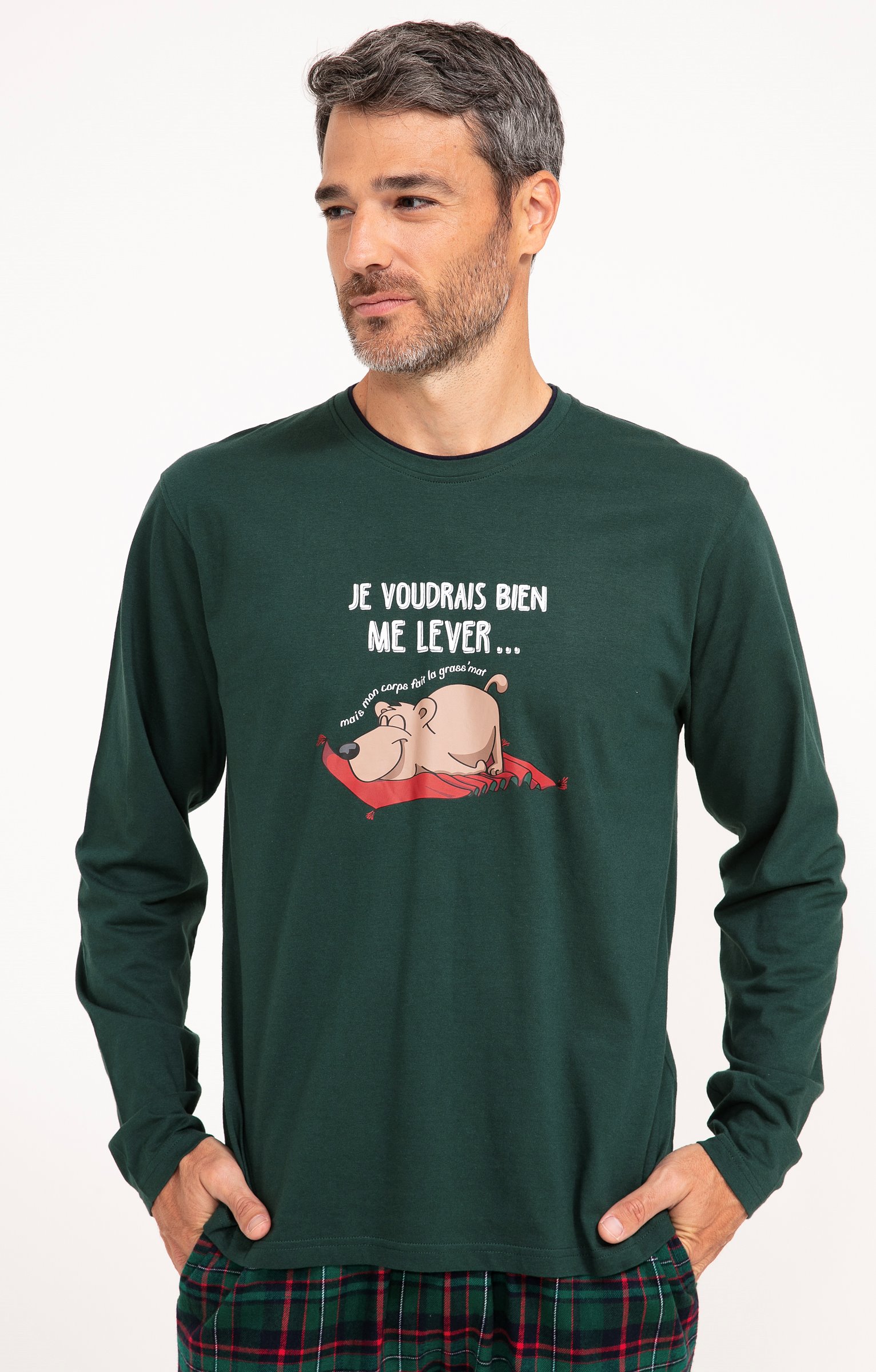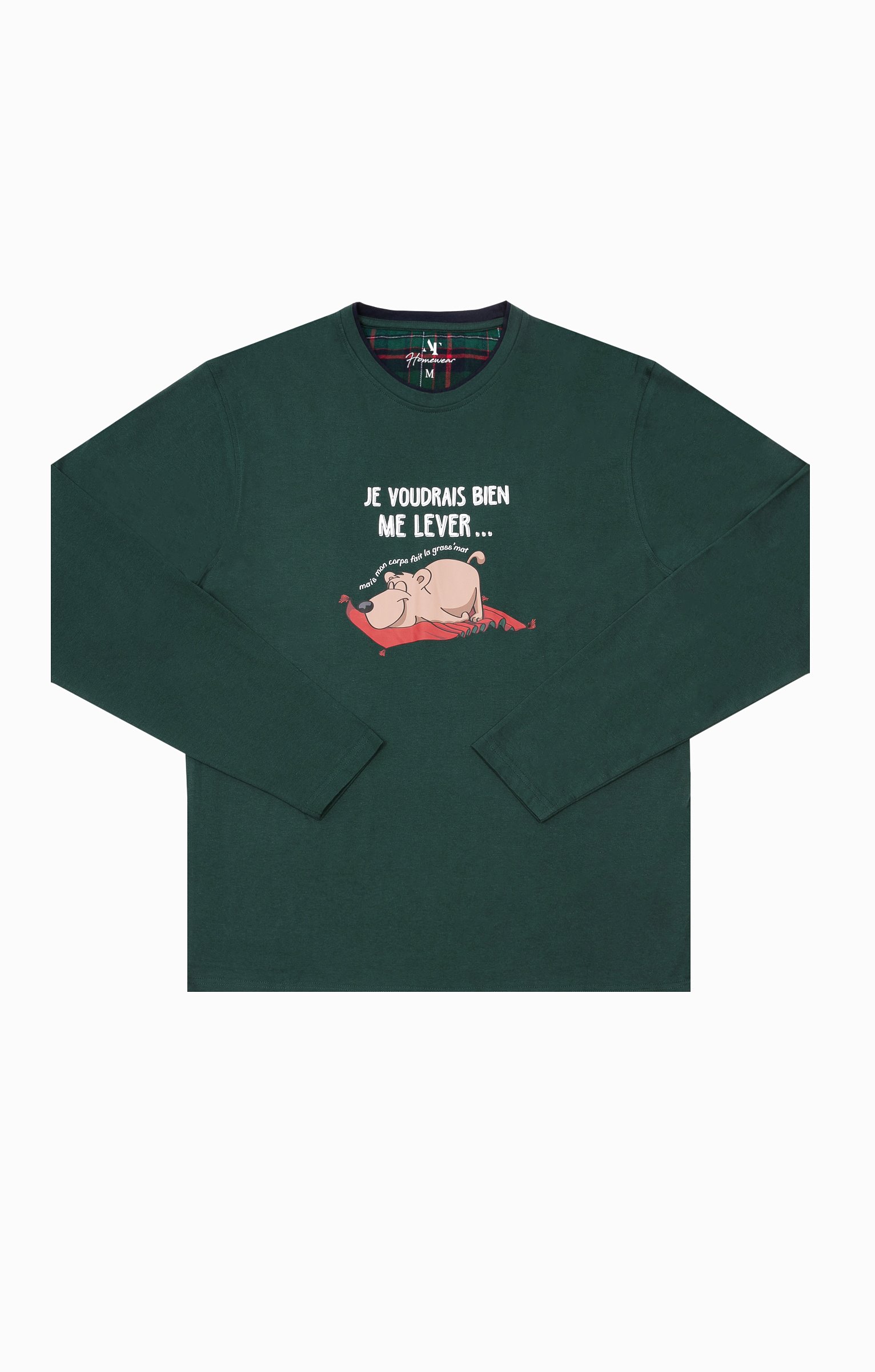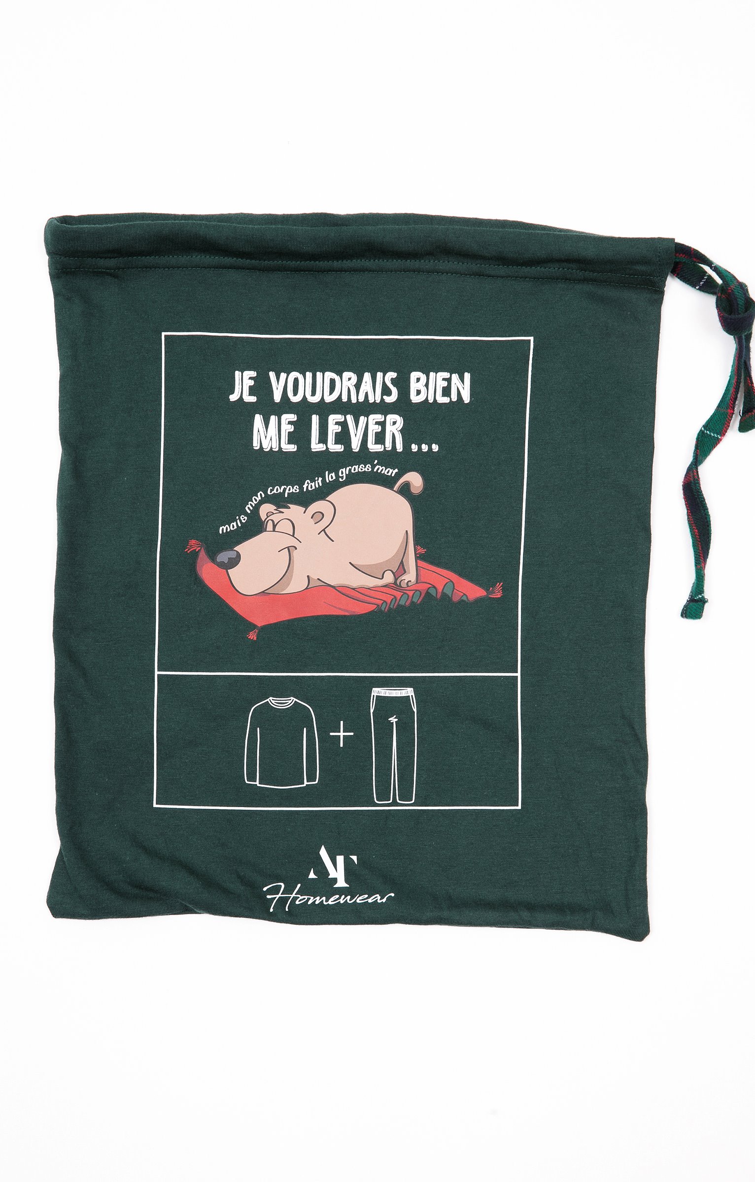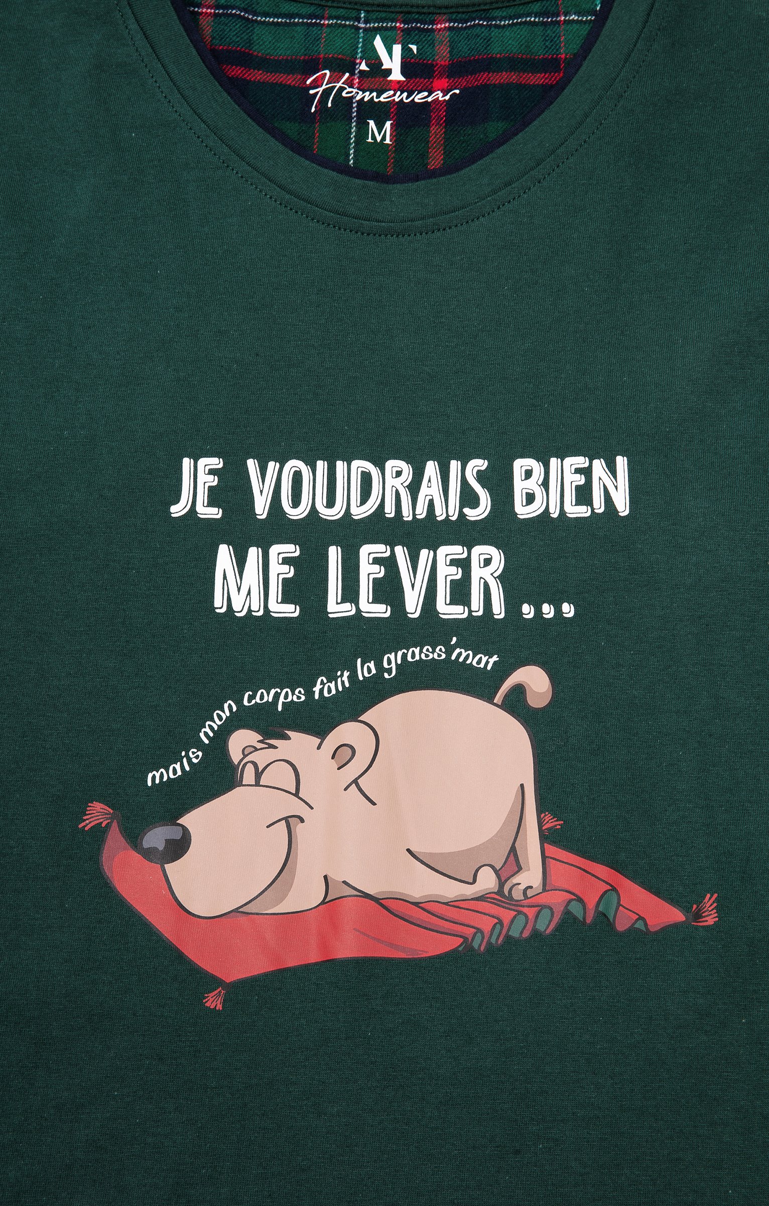 Pyjama long dépareillé. T-shirt droit. Manches longues. Double col rond. Imprimé chien dormant sur un tapis surmonté du message « Je voudrais bien me lever... mais mon corps fait la grass'mat » devant. Tissu jersey. Pantalon coupe droite. Ceinture élastiquée. 2 poches italiennes devant. Motifs à carreaux. Tissu souple. Pochon de rangement assorti au haut.