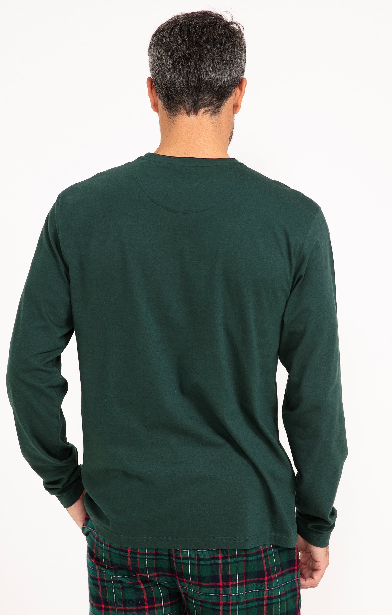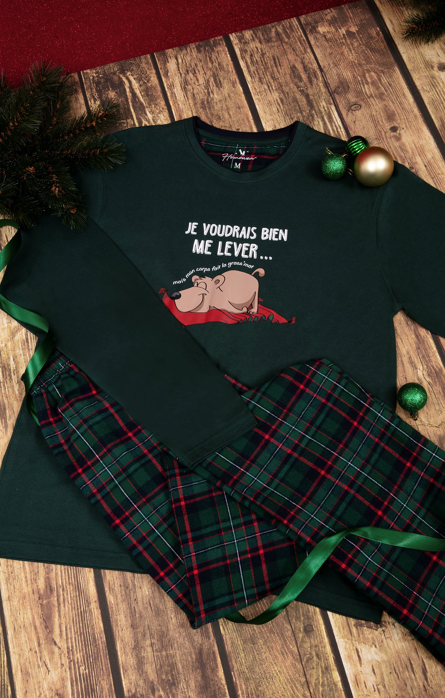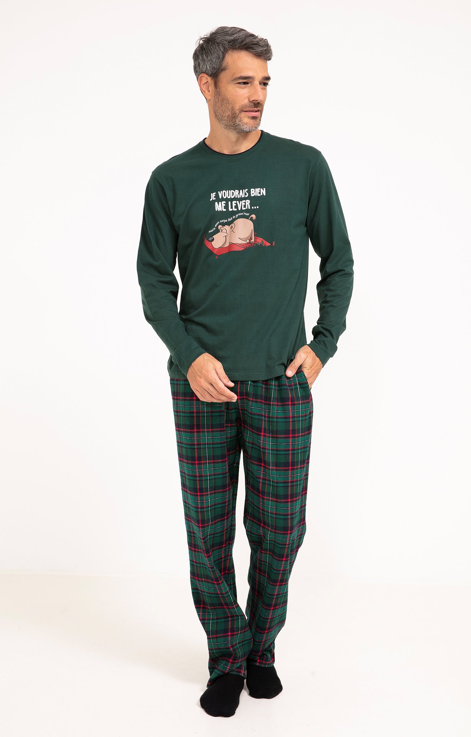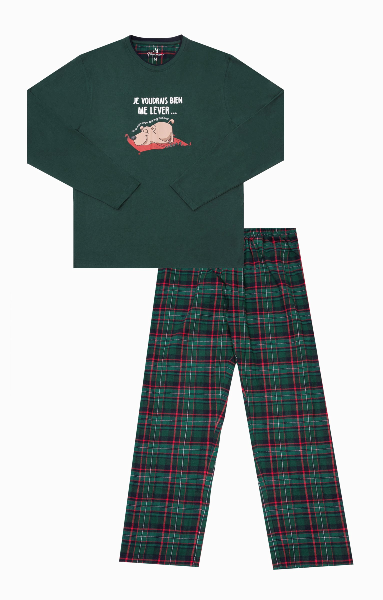 Pyjama long dépareillé. T-shirt droit. Manches longues. Double col rond. Imprimé chien dormant sur un tapis surmonté du message « Je voudrais bien me lever... mais mon corps fait la grass'mat » devant. Tissu jersey. Pantalon coupe droite. Ceinture élastiquée. 2 poches italiennes devant. Motifs à carreaux. Tissu souple. Pochon de rangement assorti au haut.