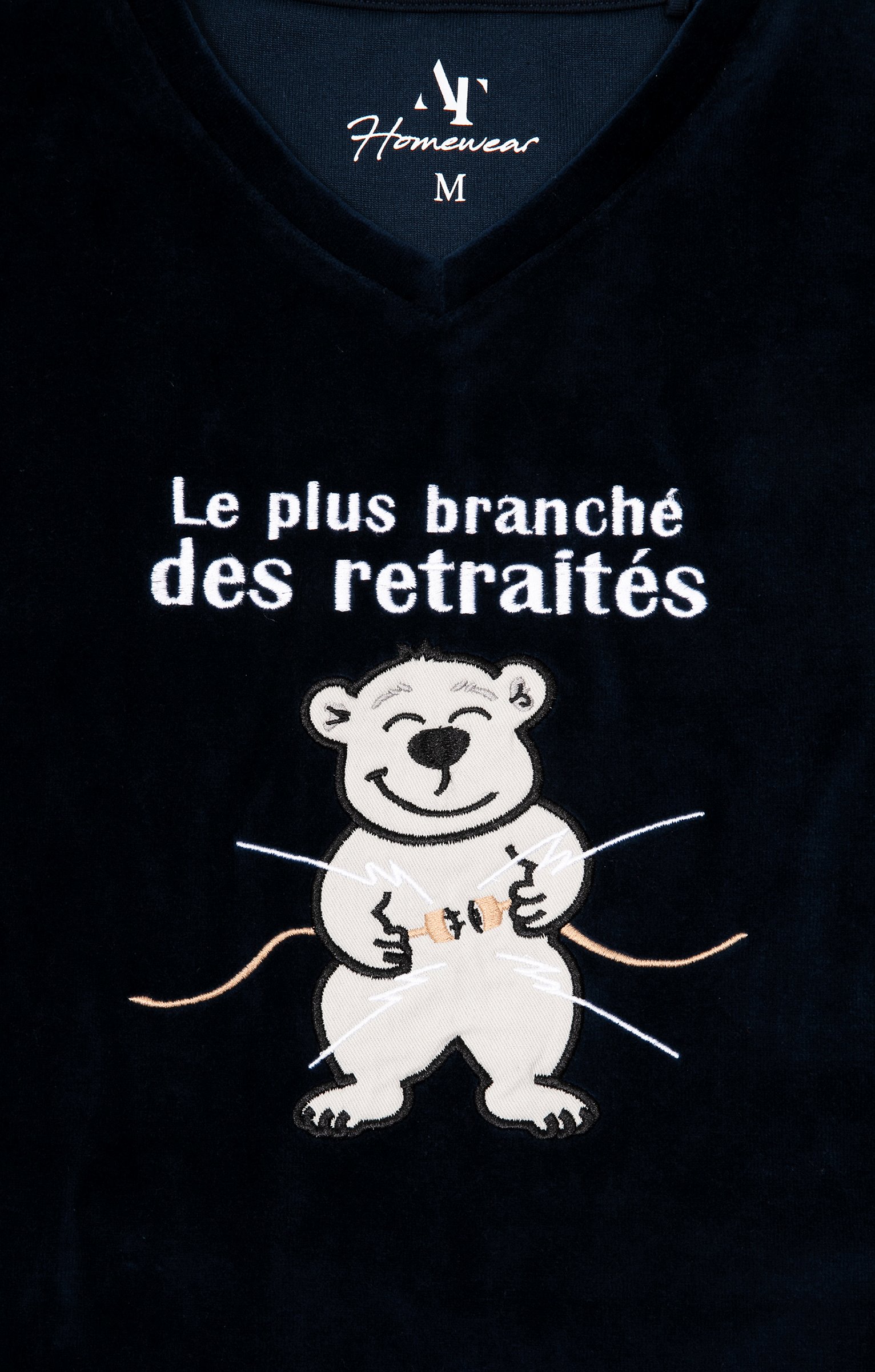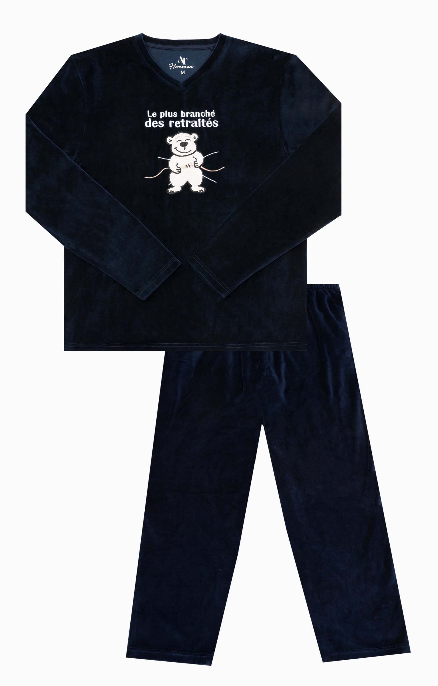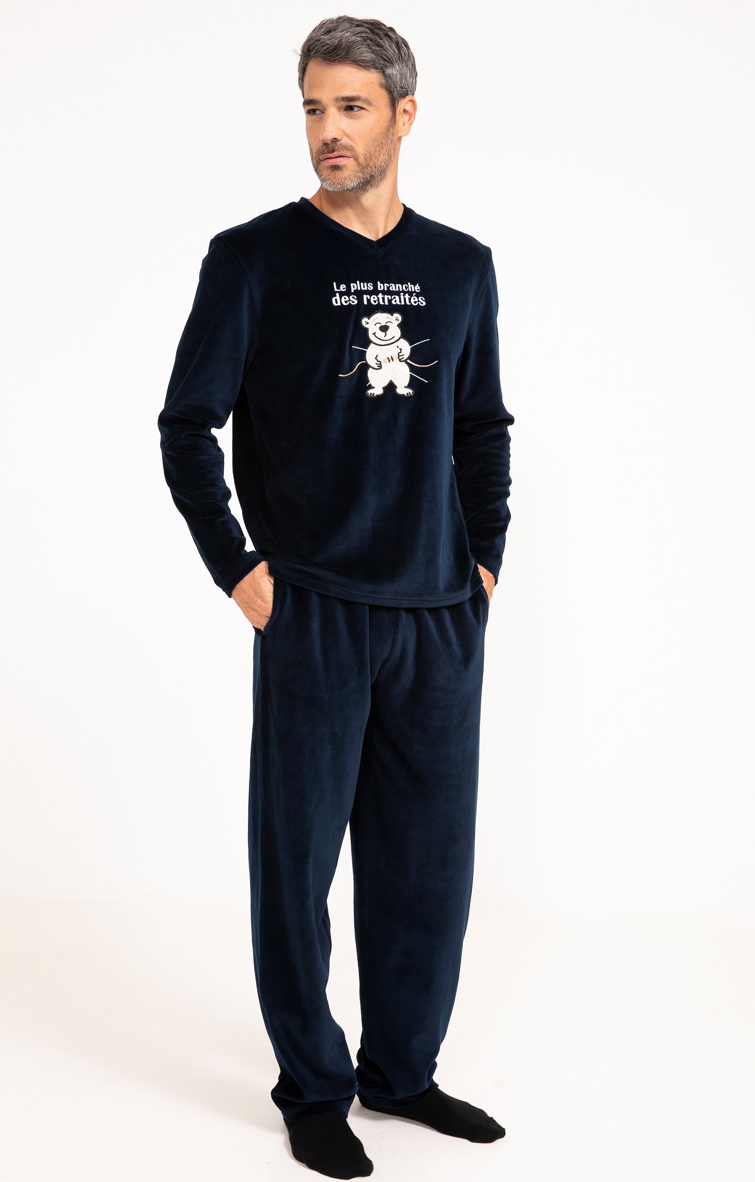 Pyjama long à motif et message humoristique. T-shirt coupe droite. Manches longues. Col V. Motifs placés contrastés sur la poitrine. Ours heureux en tissu appliqué surmonté du message « Le plus branché des retraités ». Détails brodés. Pantalon droit. Ceinture élastiquée. 2 poches italiennes devant. Tissu en velours.