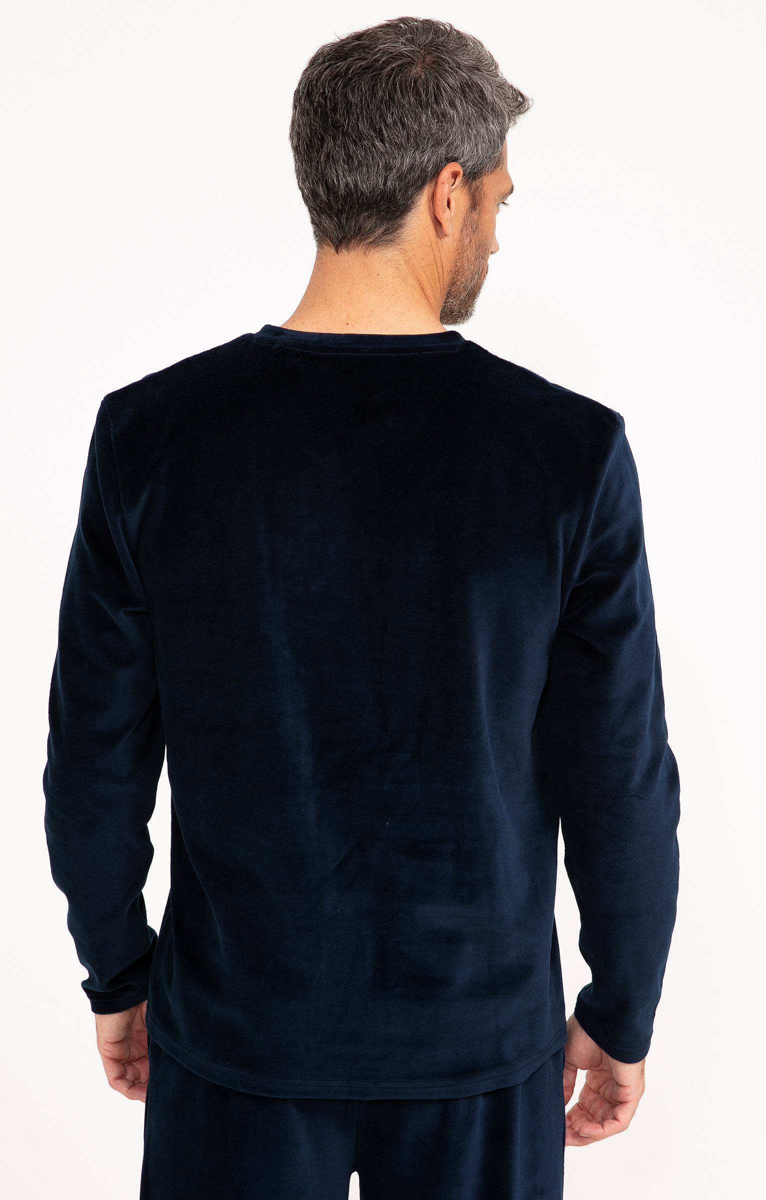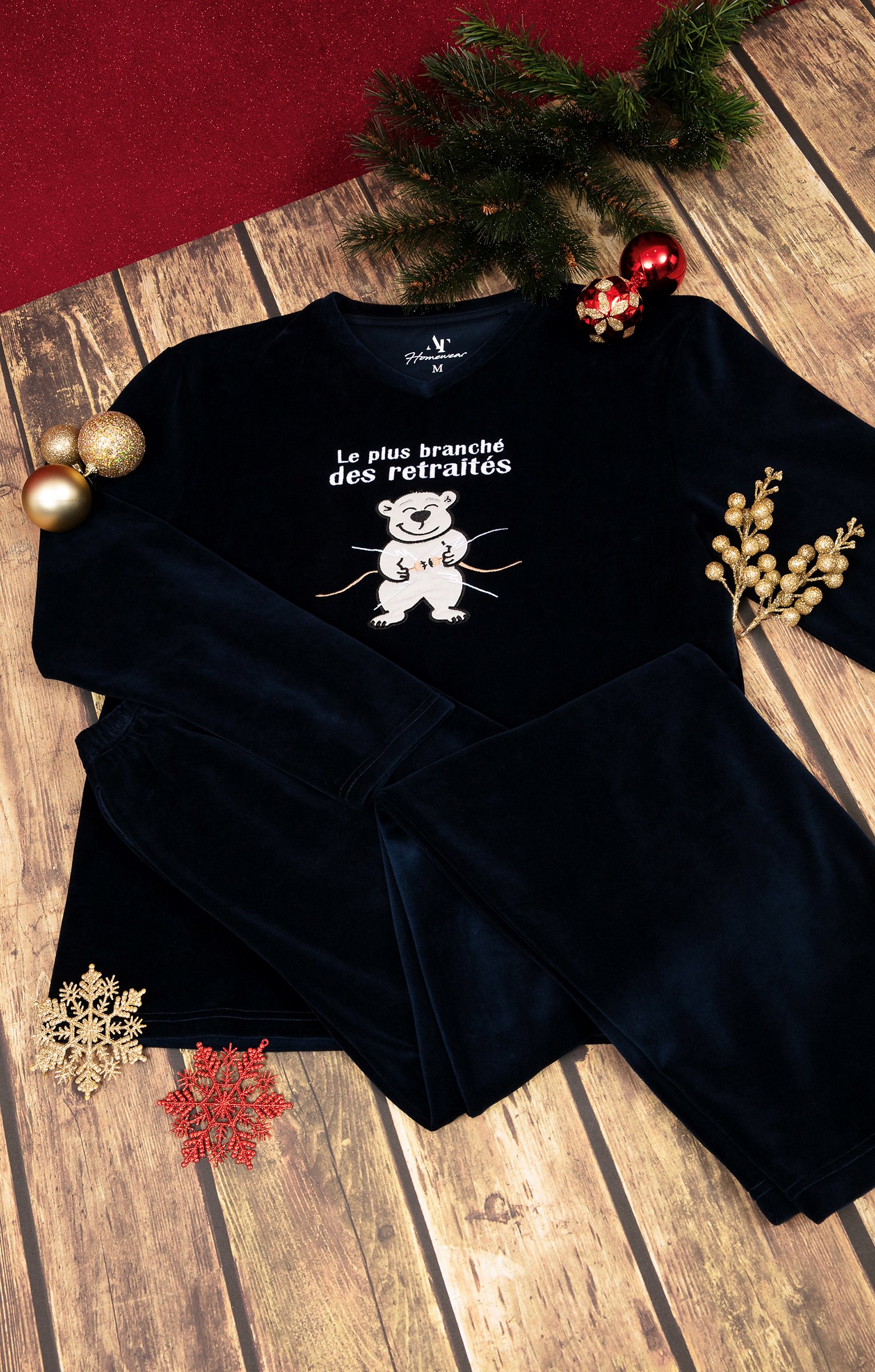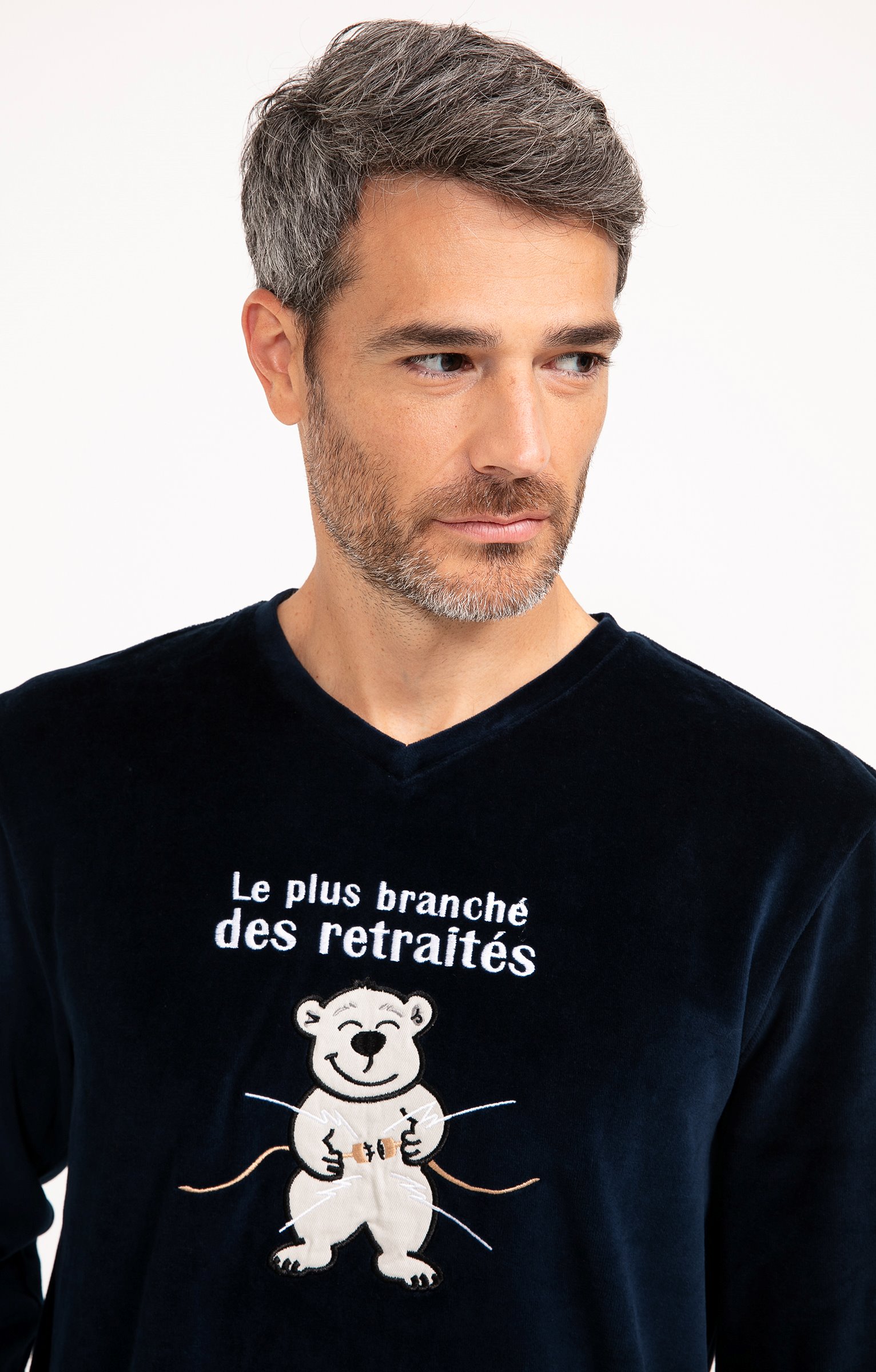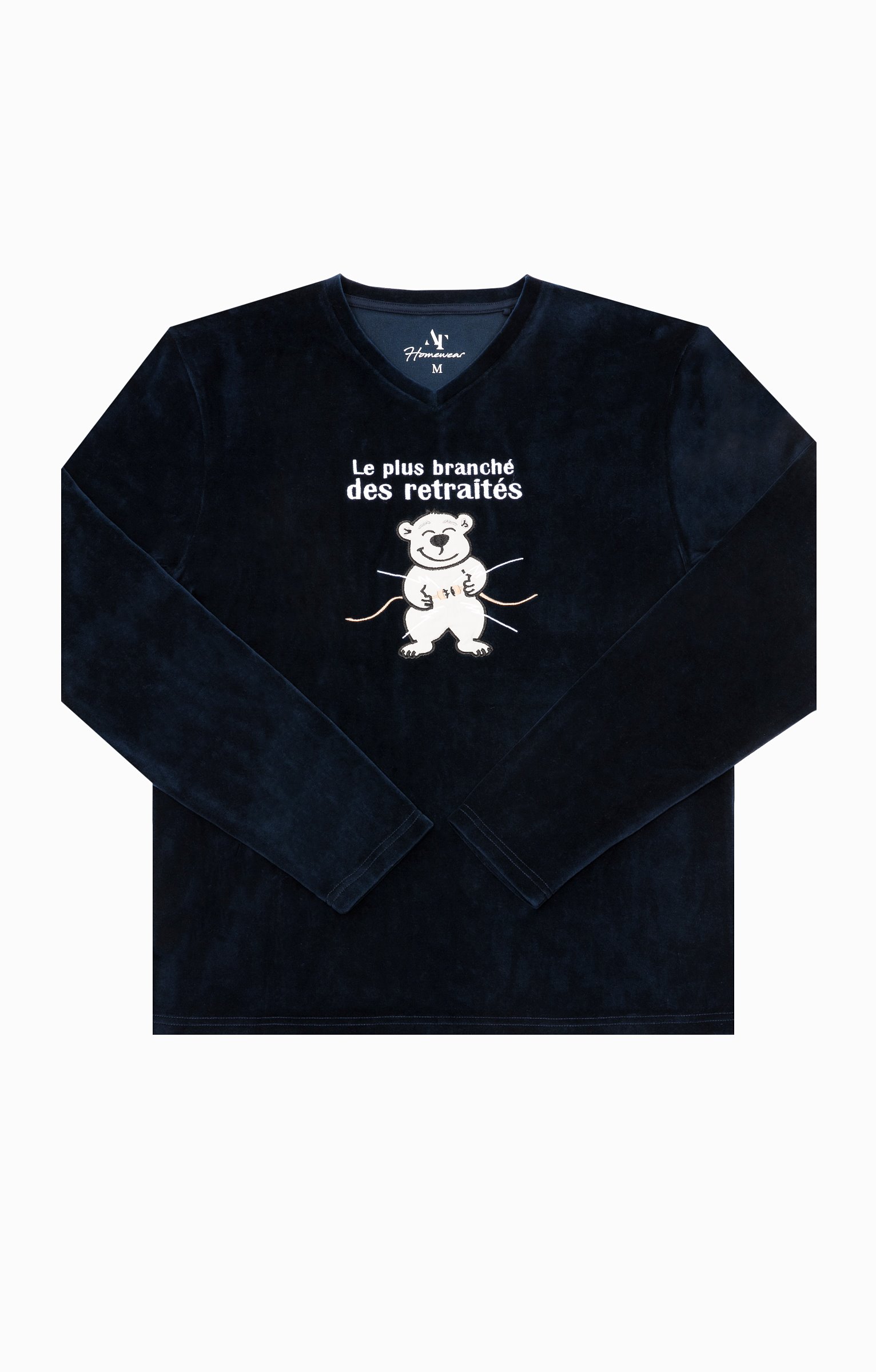 Pyjama long à motif et message humoristique. T-shirt coupe droite. Manches longues. Col V. Motifs placés contrastés sur la poitrine. Ours heureux en tissu appliqué surmonté du message « Le plus branché des retraités ». Détails brodés. Pantalon droit. Ceinture élastiquée. 2 poches italiennes devant. Tissu en velours.