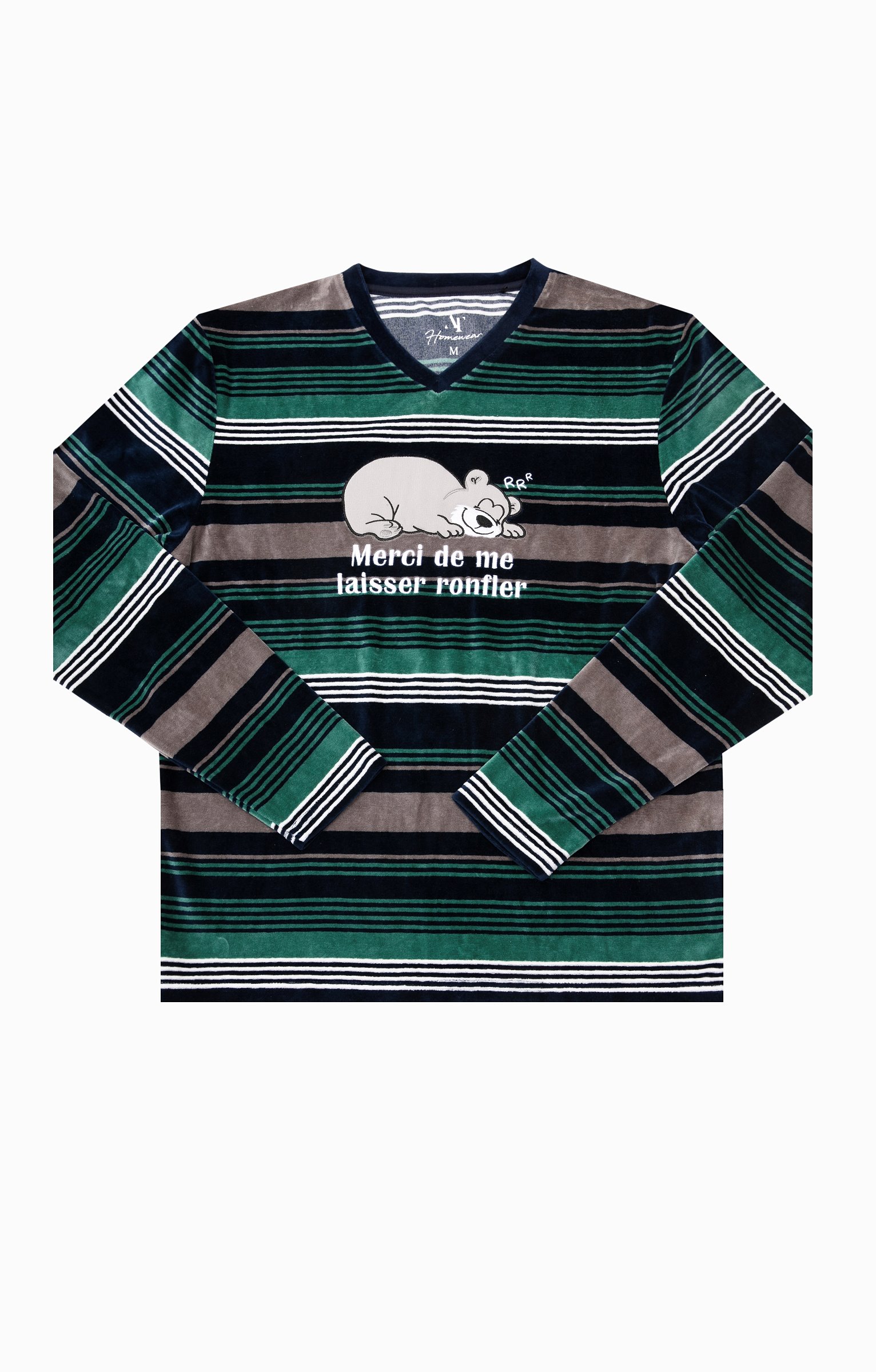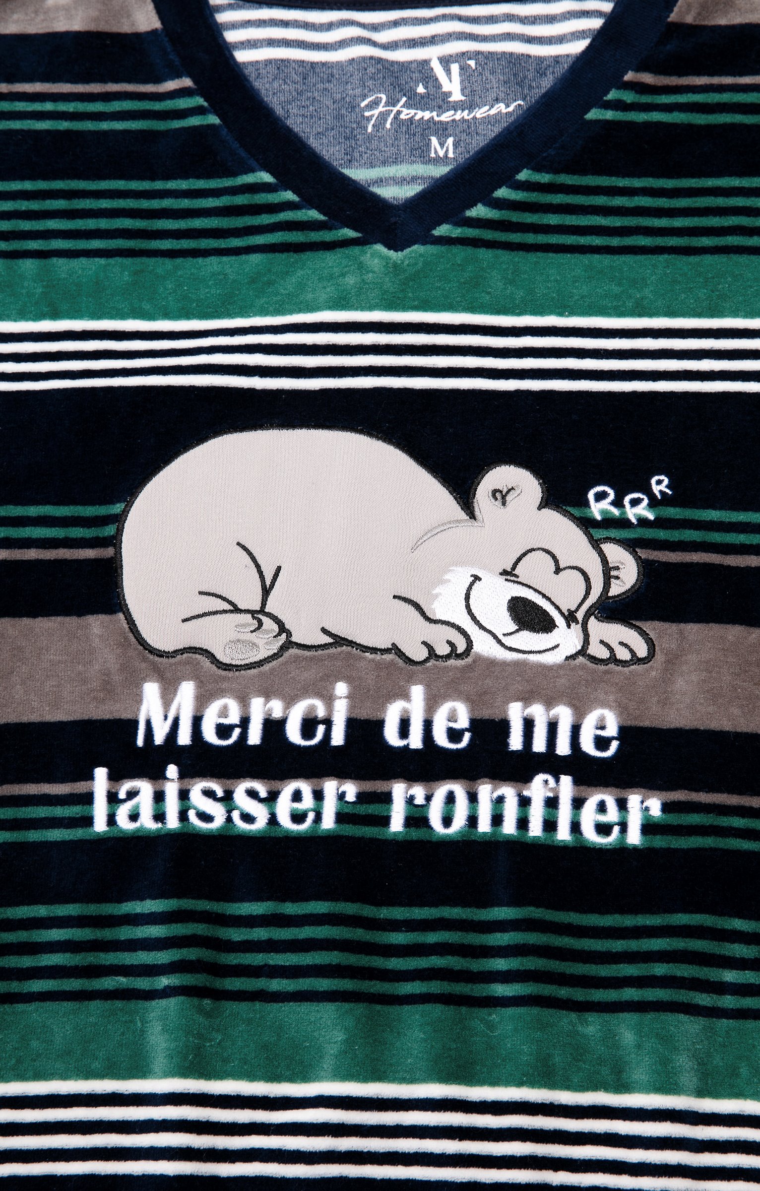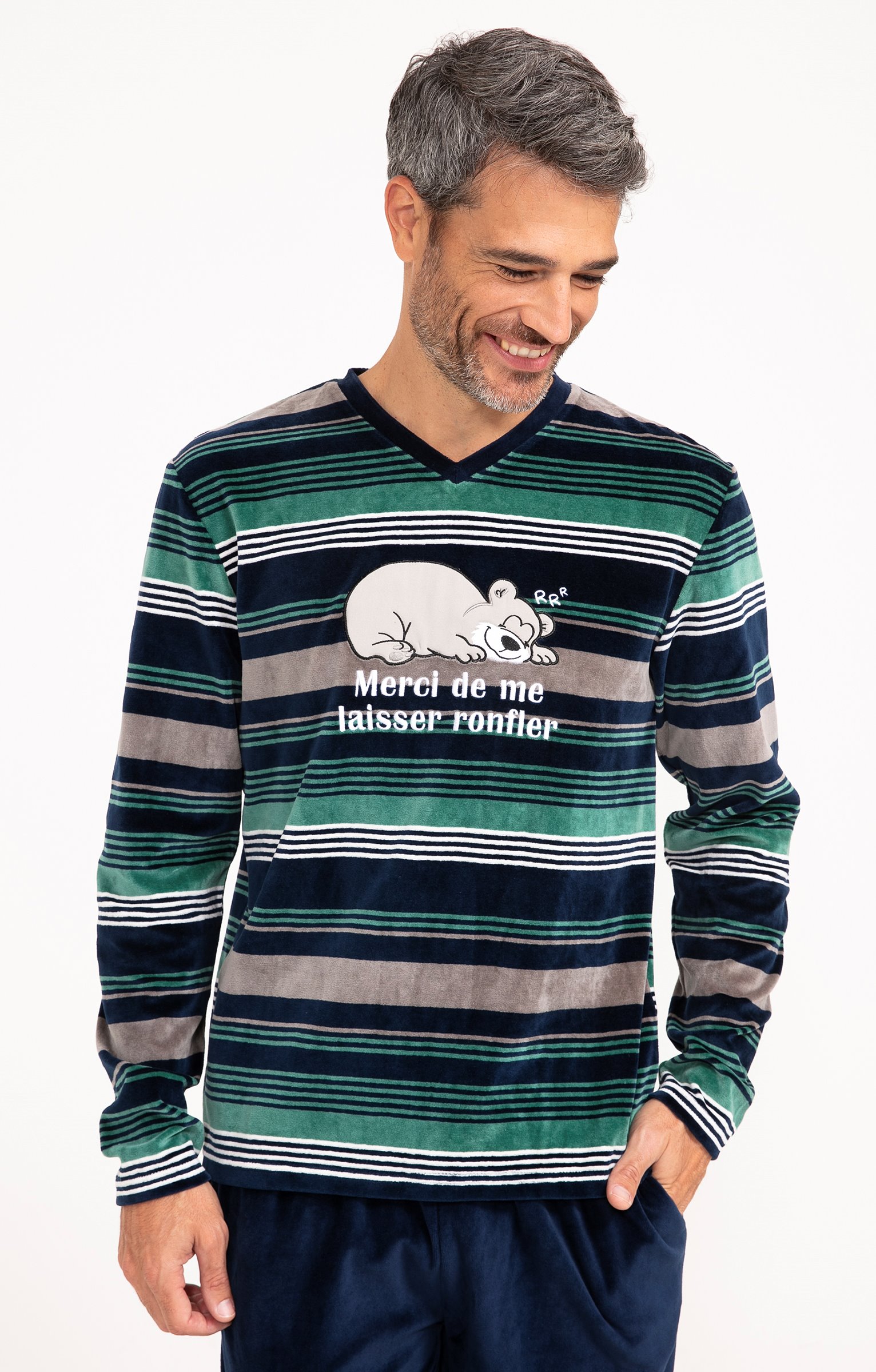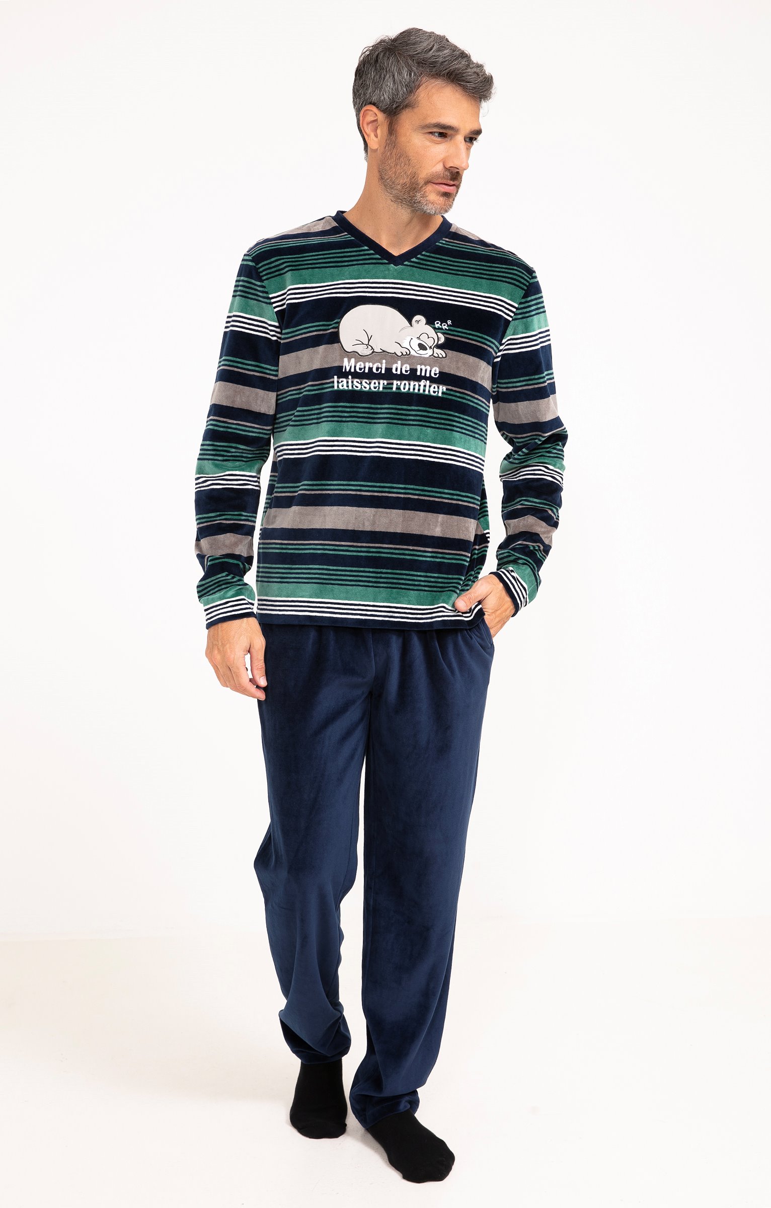 Pyjama long dépareillé. T-shirt coupe droite. Manches longues. Col V. Haut rayé avec motifs ours avec le message « Merci de me laisser ronfler ». Motifs en tissu appliqué avec détails brodés. Pantalon droit. Taille élastiquée. 2 poches italiennes devant. Coloris uni. Tissu en velours.
