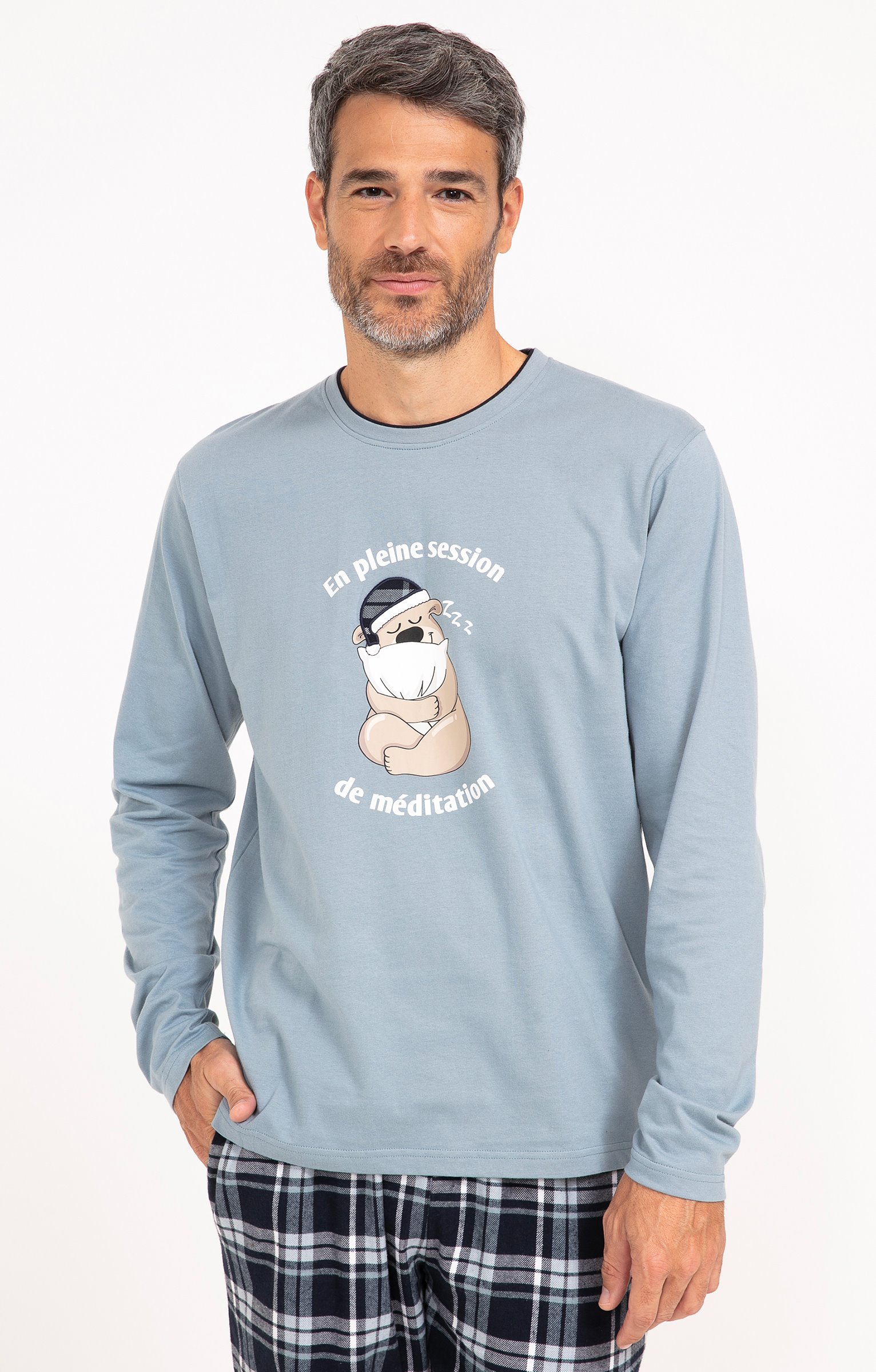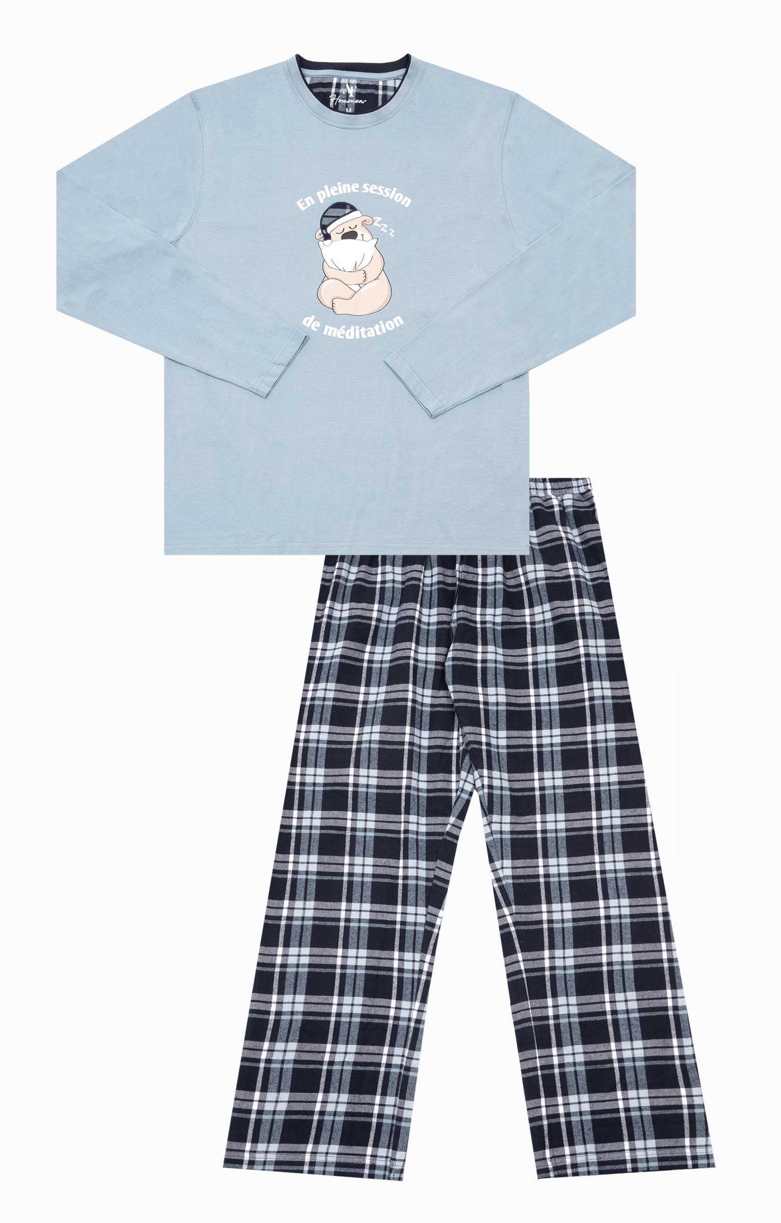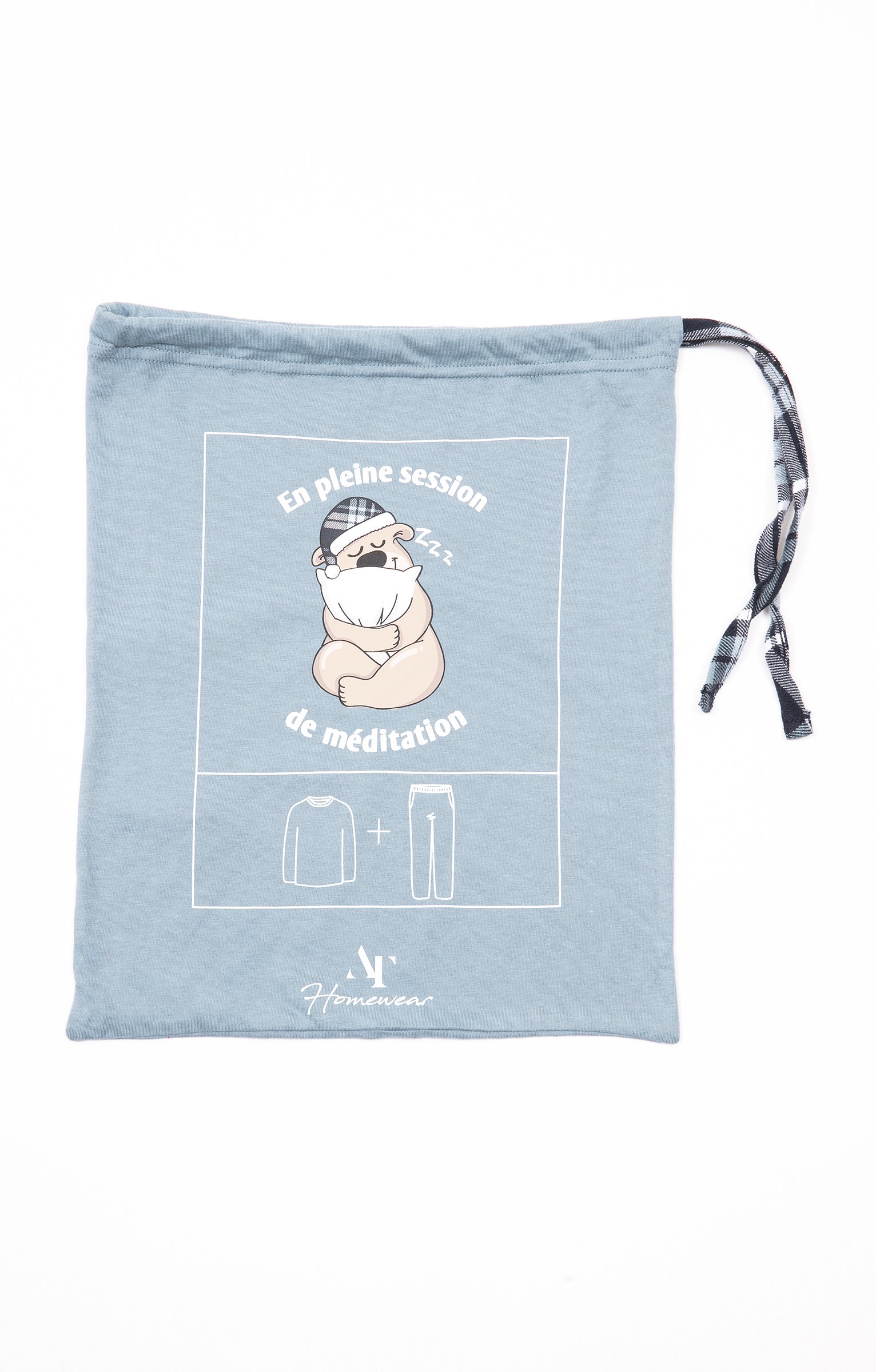 Pyjama long dépareillé. T-shirt coupe droite. Manches longues. Double col rond. Chien dormant encadré par le message « En pleine session de méditation » imprimé devant. Pantalon coupe droite. Ceinture élastiquée. 2 poches italiennes devant. Motif à carreaux. Tissu doux. Pochon de rangement assorti au t-shirt.