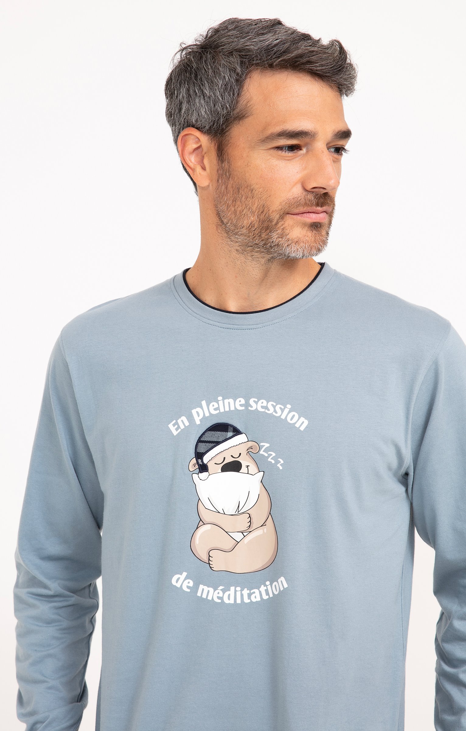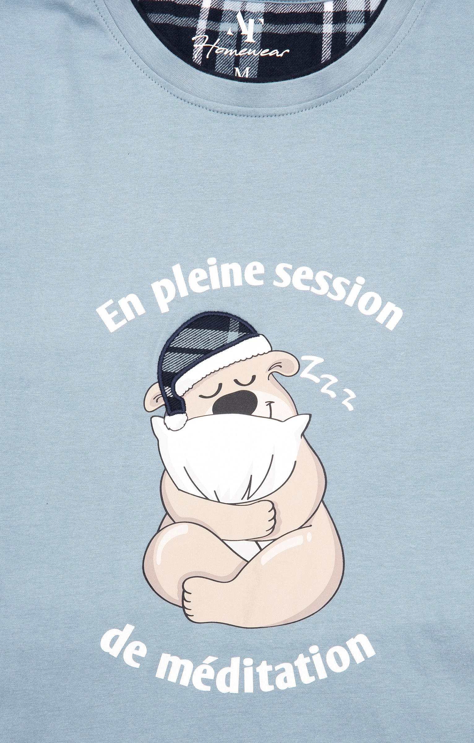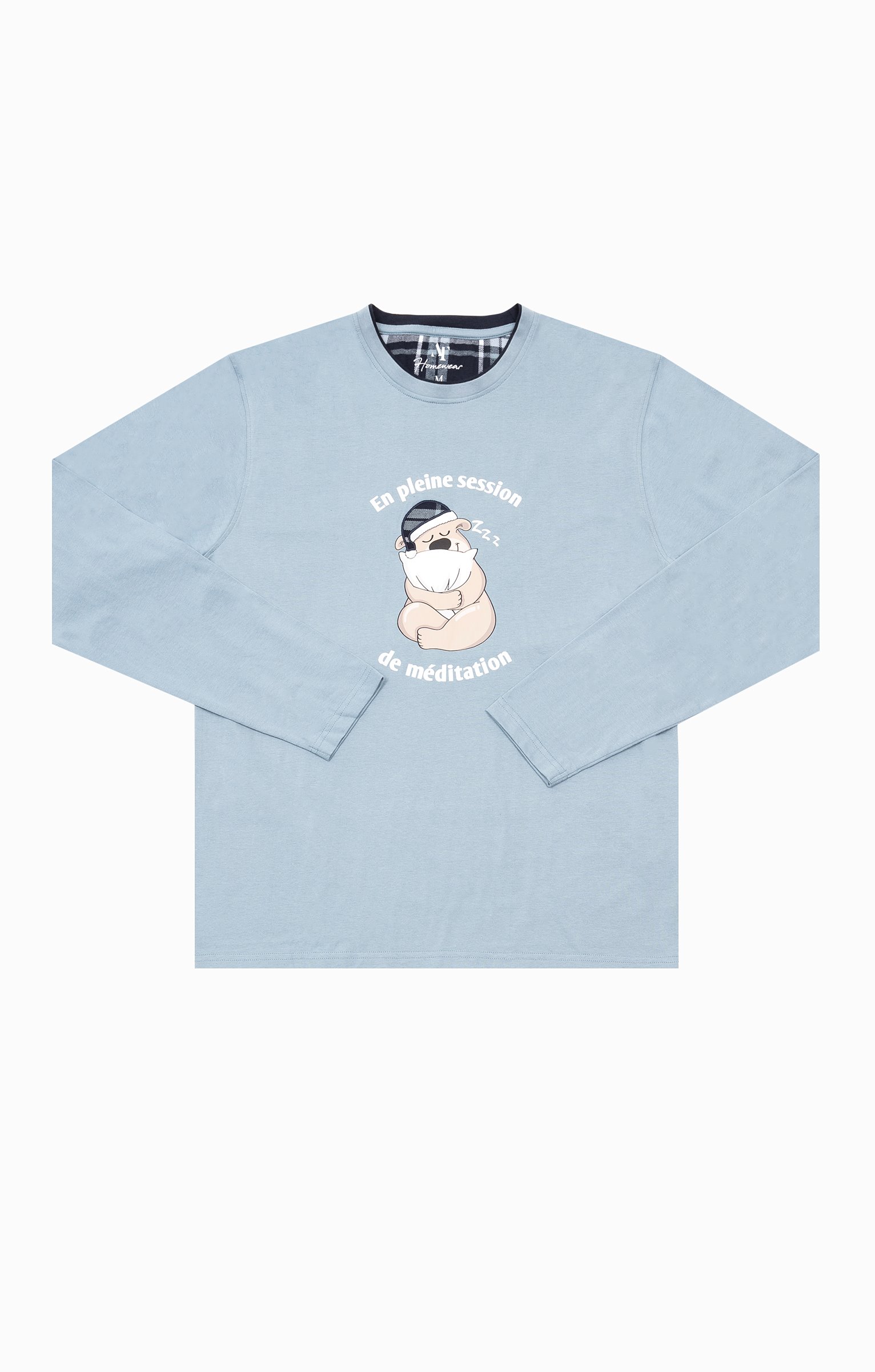 Pyjama long dépareillé. T-shirt coupe droite. Manches longues. Double col rond. Chien dormant encadré par le message « En pleine session de méditation » imprimé devant. Pantalon coupe droite. Ceinture élastiquée. 2 poches italiennes devant. Motif à carreaux. Tissu doux. Pochon de rangement assorti au t-shirt.