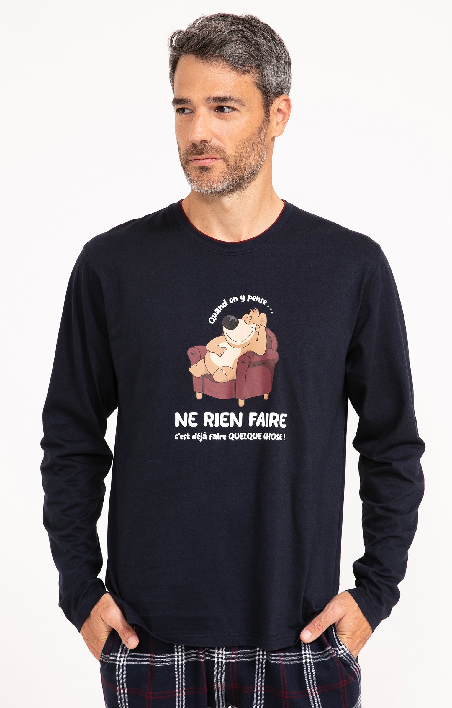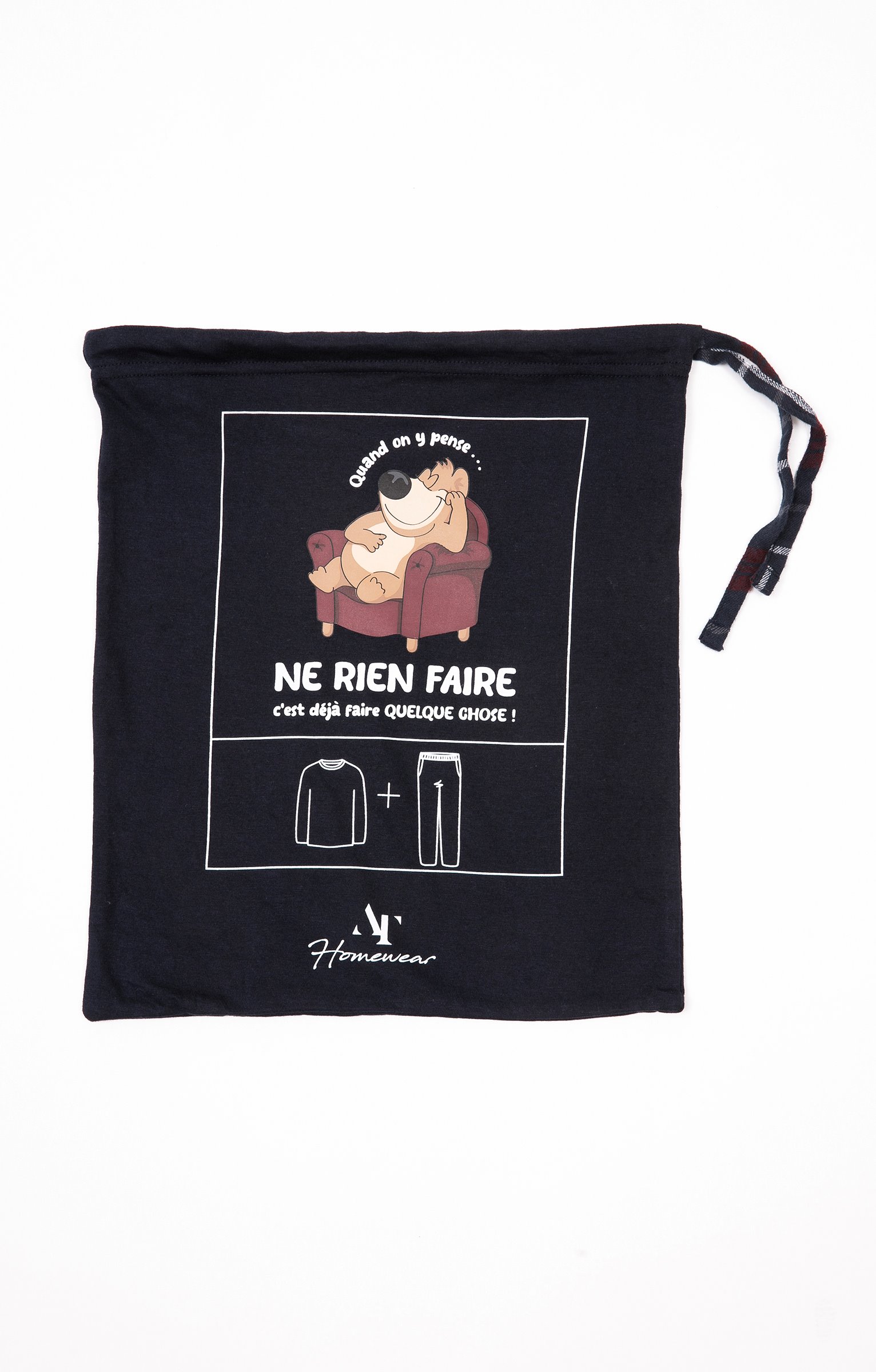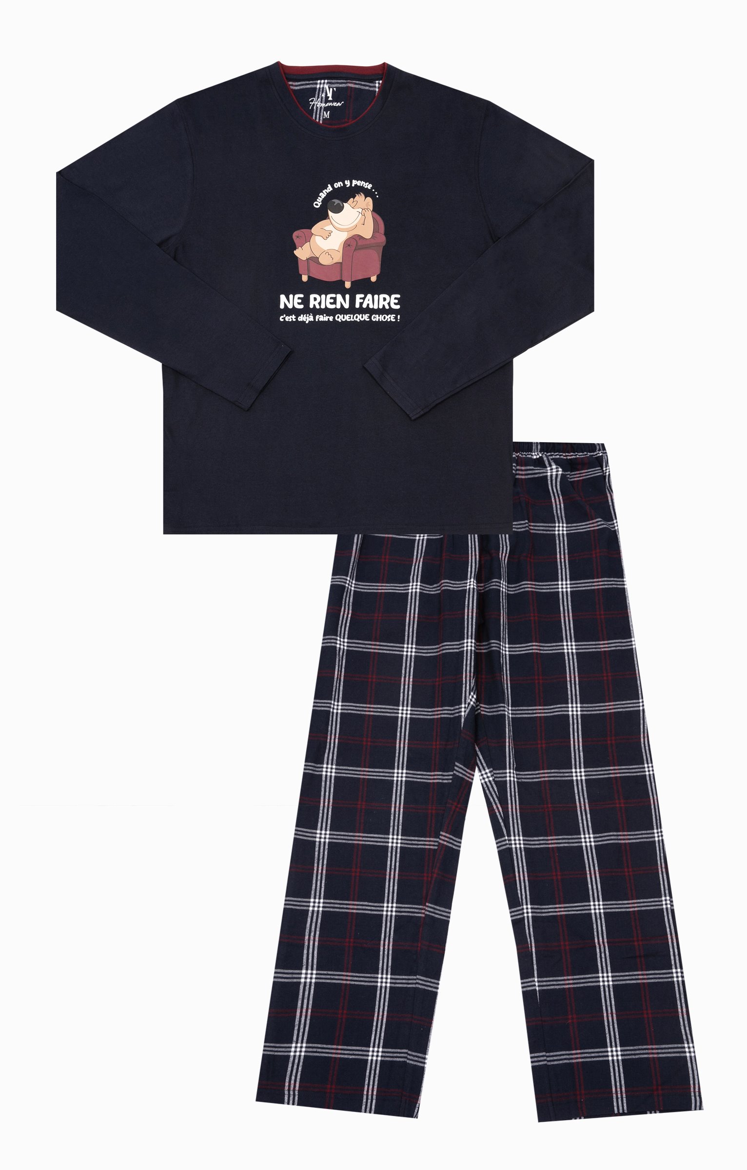 Pyjama long dépareillé. T-shirt coupe droite. Manches longues. Double col rond. Motif chien dormant dans un fauteuil entouré du message «Quand on y pense... ne rien faire c'est déjà faire quelque chose » devant. Tissu en maille jersey. Pantalon droit. Ceinture élastiquée. 2 poches italiennes devant. Tissu à carreaux. Pochon de rangement assorti.