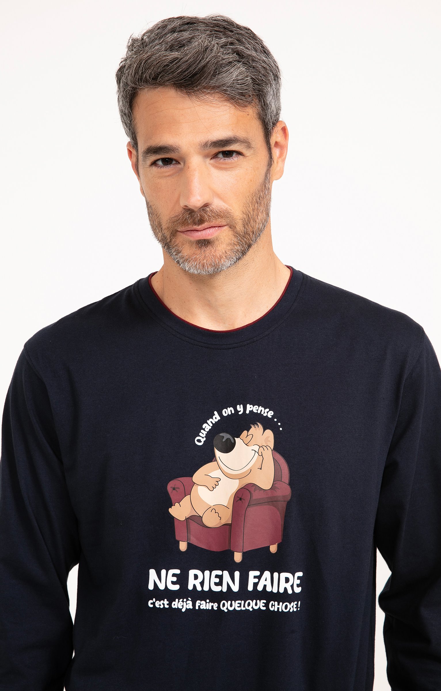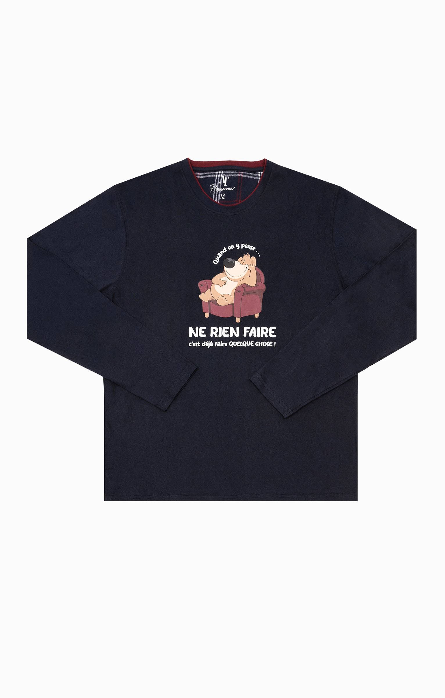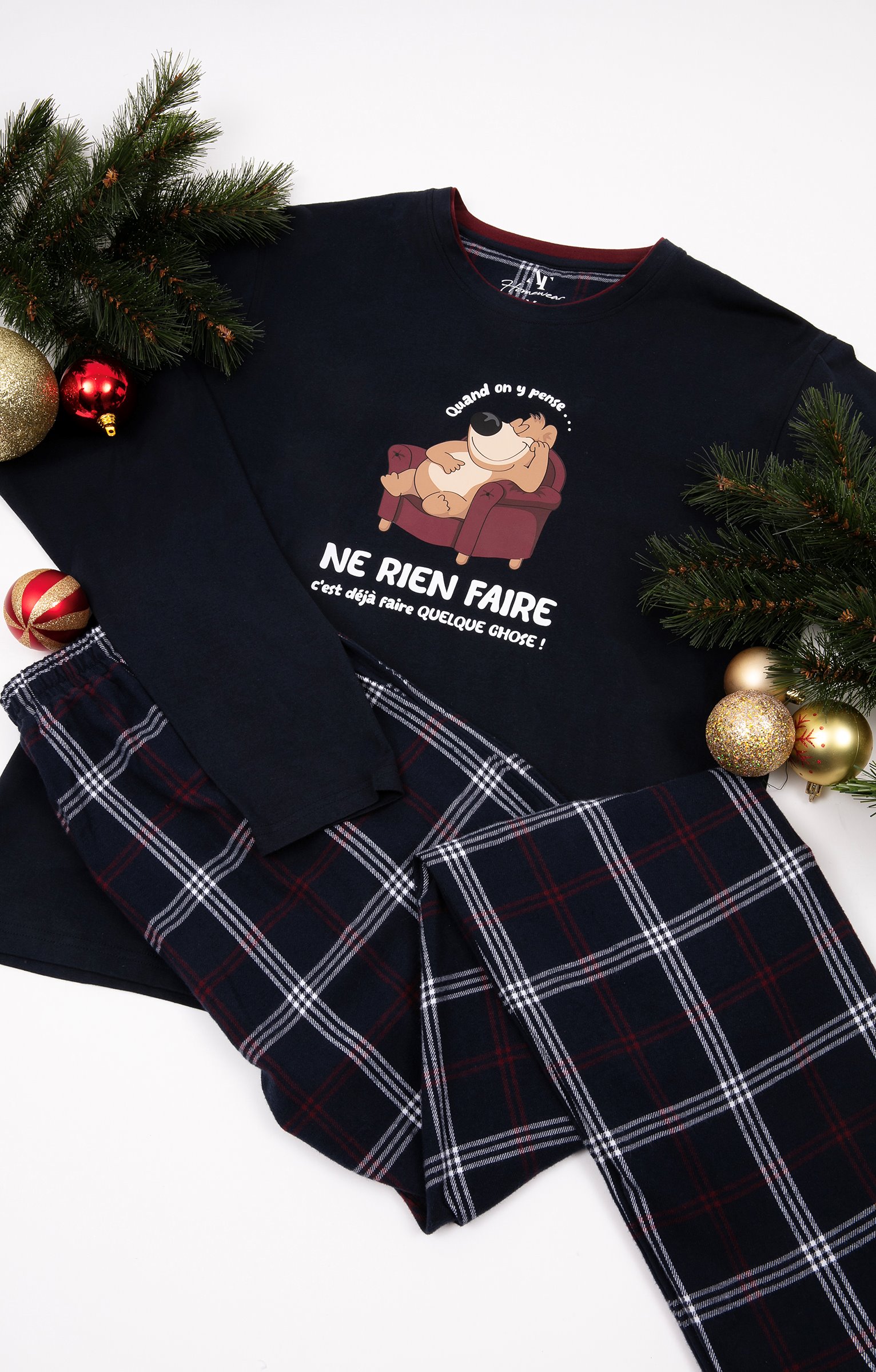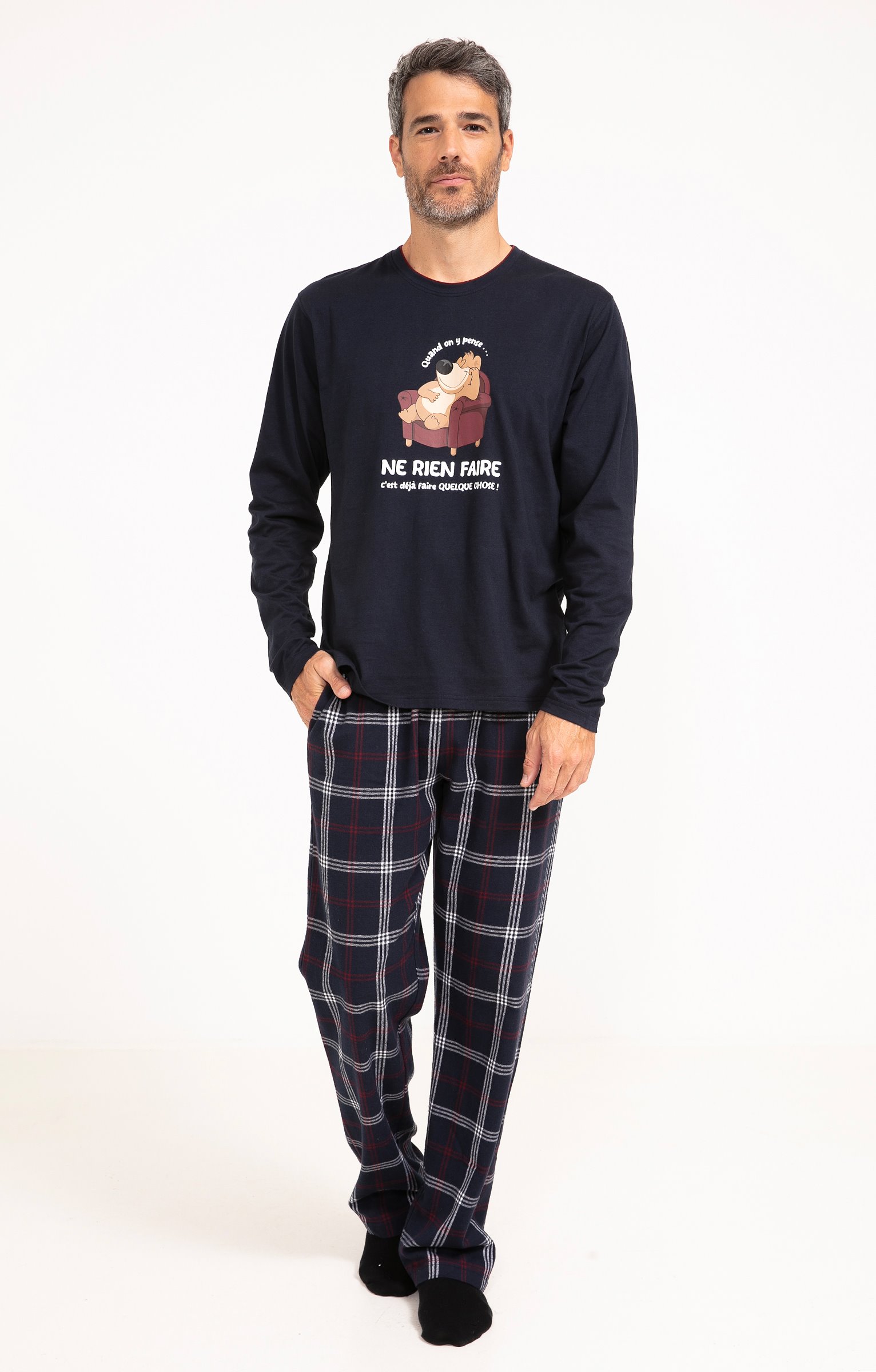 Pyjama long dépareillé. T-shirt coupe droite. Manches longues. Double col rond. Motif chien dormant dans un fauteuil entouré du message «Quand on y pense... ne rien faire c'est déjà faire quelque chose » devant. Tissu en maille jersey. Pantalon droit. Ceinture élastiquée. 2 poches italiennes devant. Tissu à carreaux. Pochon de rangement assorti.