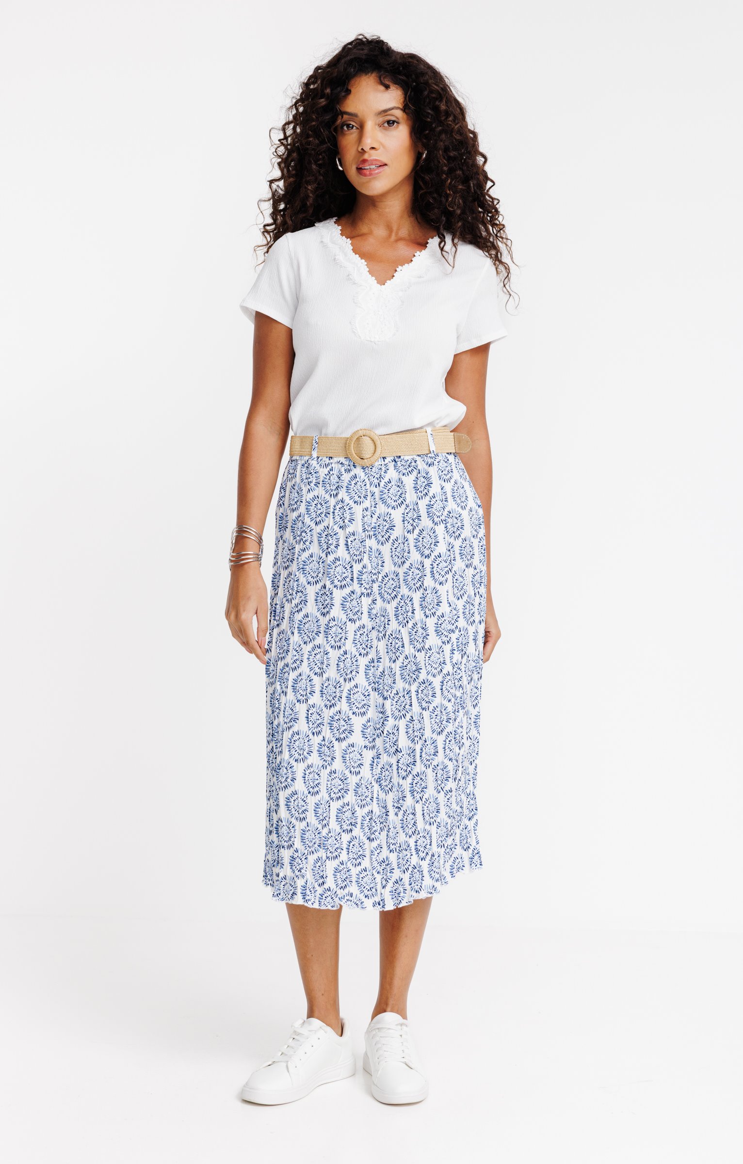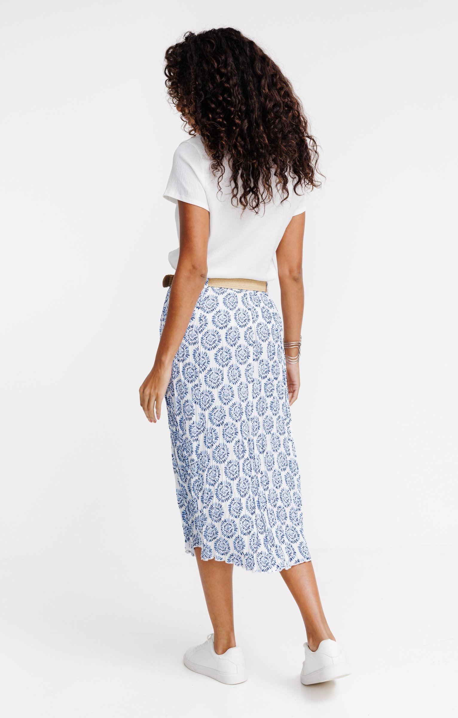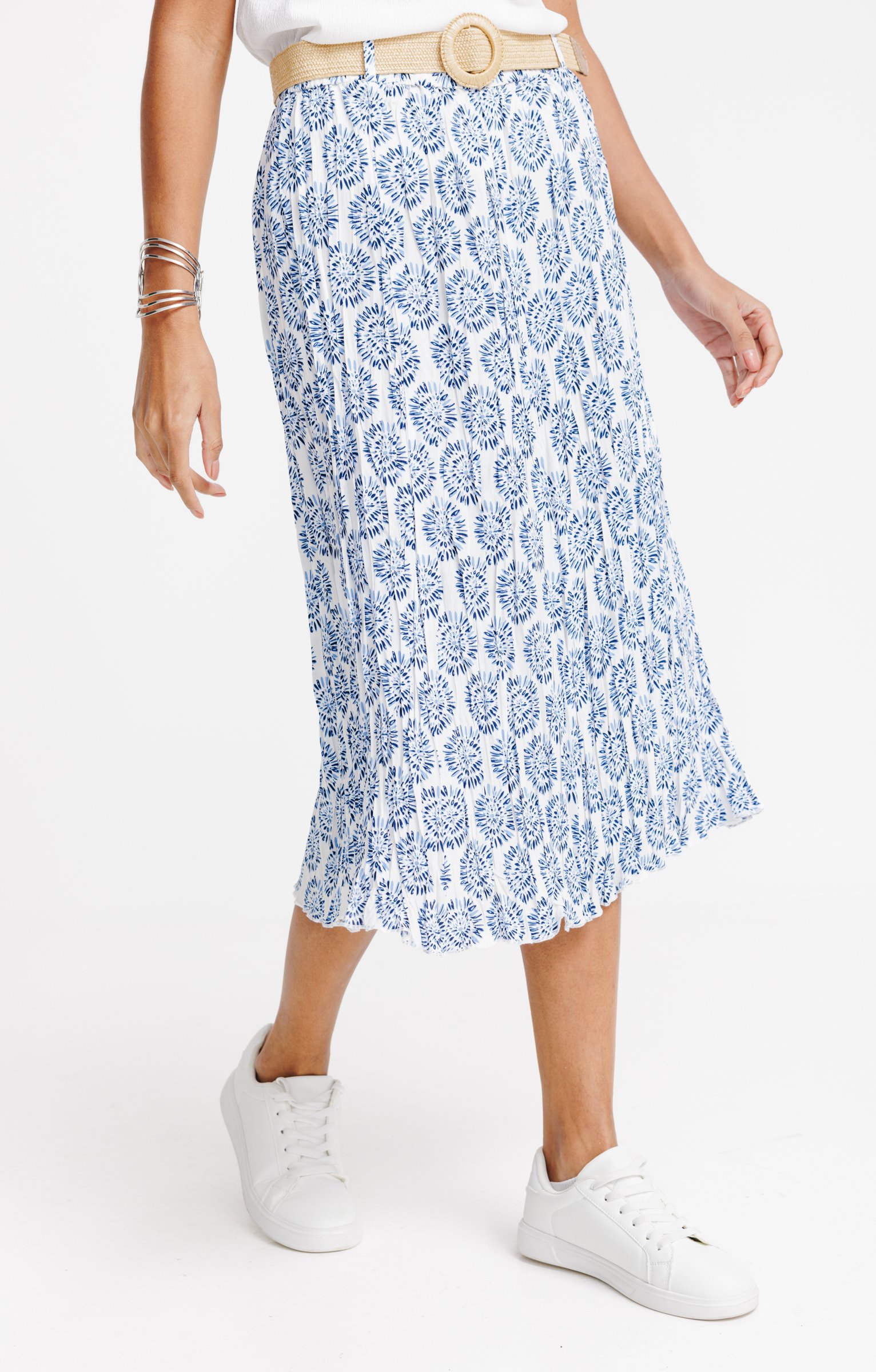 Jupe longue à imprimé floral. Coupe évasée avec des plis sur l'ensemble. Longueur longue. Taille élastiquée pour un ajustement confortable. Ceinture en rafia à boucle intégrée. Imprimé à motifs floraux sur fond uni.