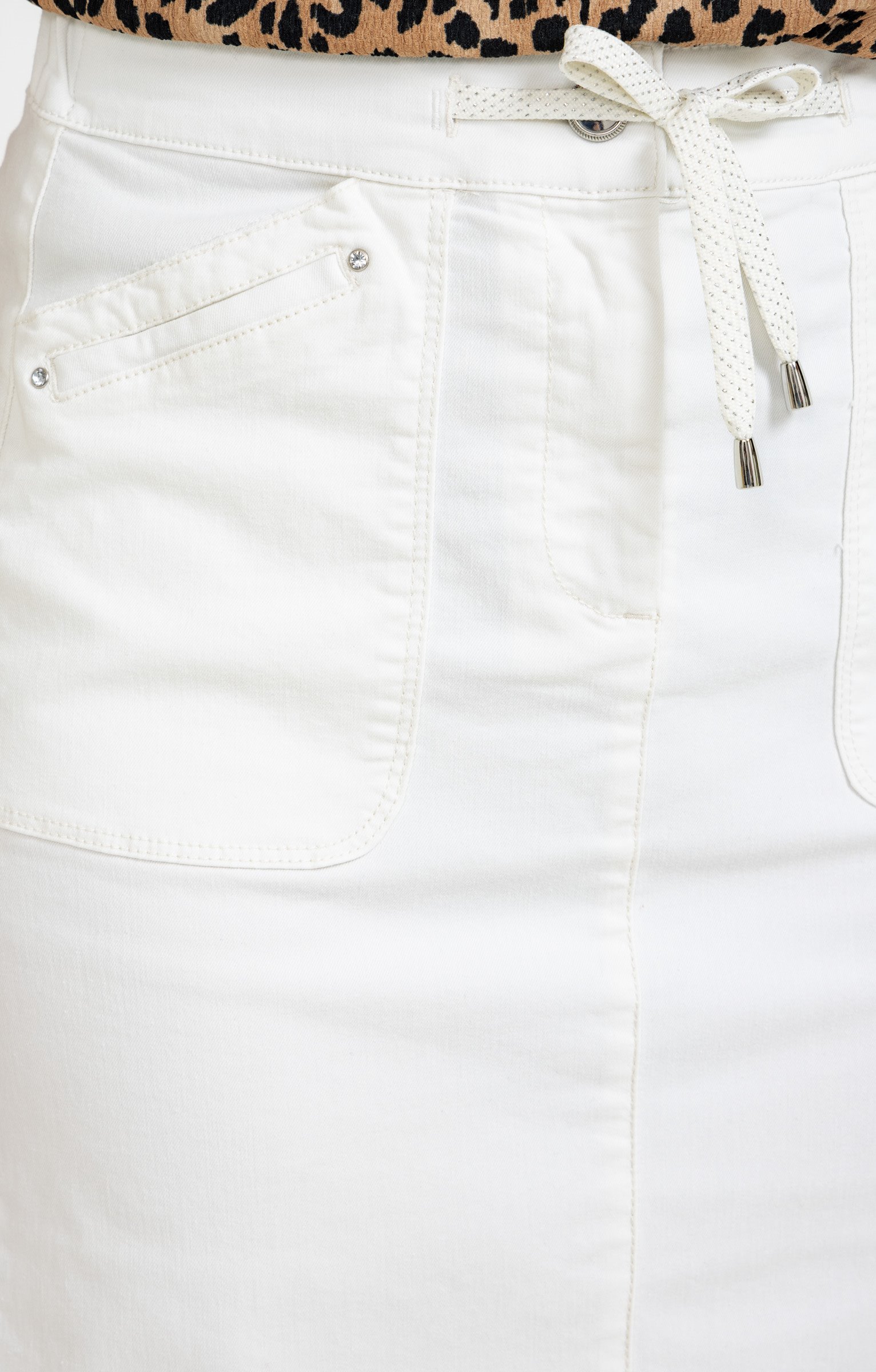 Jupe midi à taille élastiquée avec cordon de serrage brillant. Coupe droite avec fente avant. Deux poches plaquées sur les côtés et au dos. Longueur au genou. Finition des bords surpiquée. Coloris uni.