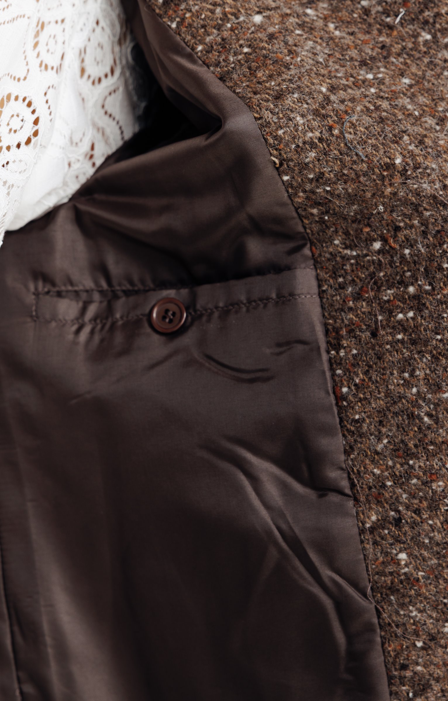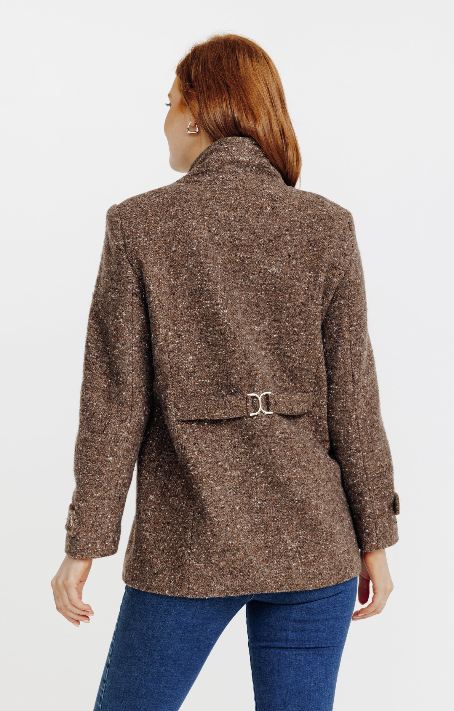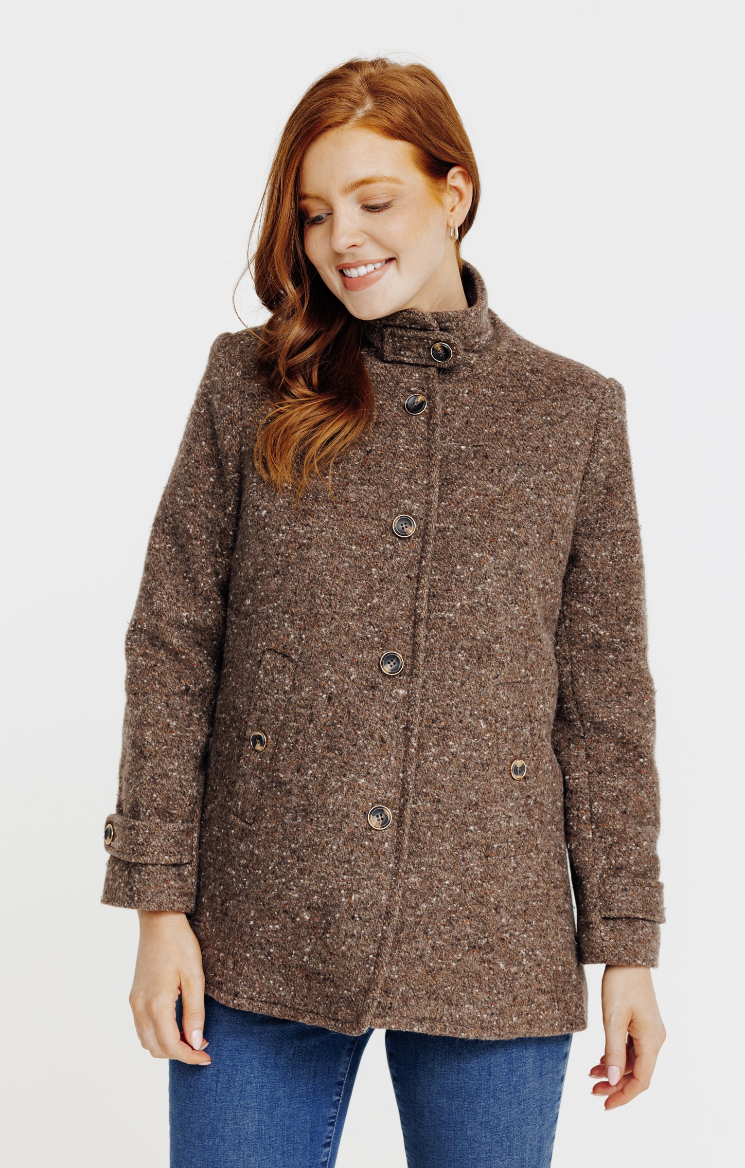 Manteau sous fesses à col montant et manches longues. Coupe droite. Fermeture boutonnée sur le devant. 2 poches passepoilées à bouton sur les côtés. Patte décorative boutonnée aux poignets. Détail de martingale au dos avec boucle. Tissu à effet moucheté multicolore. Longueur : 72 cm.