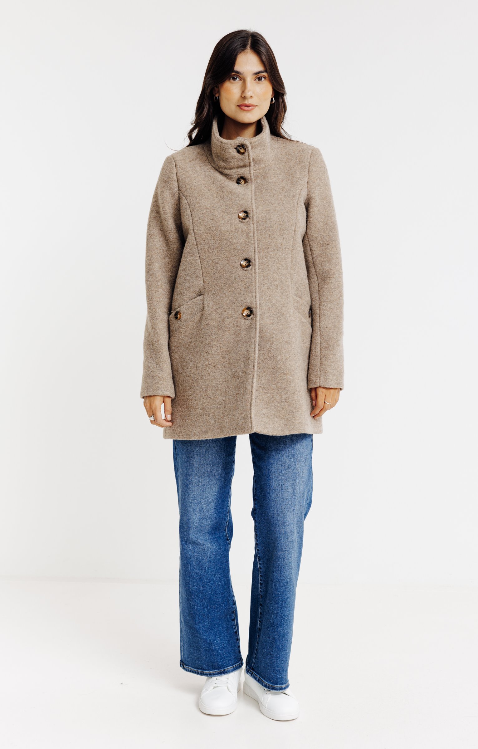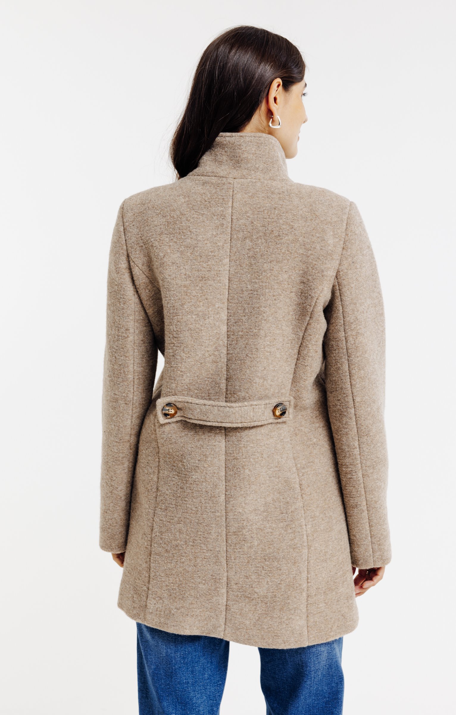 Manteau mi-long uni à col montant. Coupe droite. Manches longues. Longueur sous fesses. Fermeture boutonnée sur le devant avec boutons ronds contrastants. 2 poches passepoilées à rabat boutonné à l’avant. Détail martingale au dos. Tissu à texture légèrement chinée. Longueur : 80 cm.