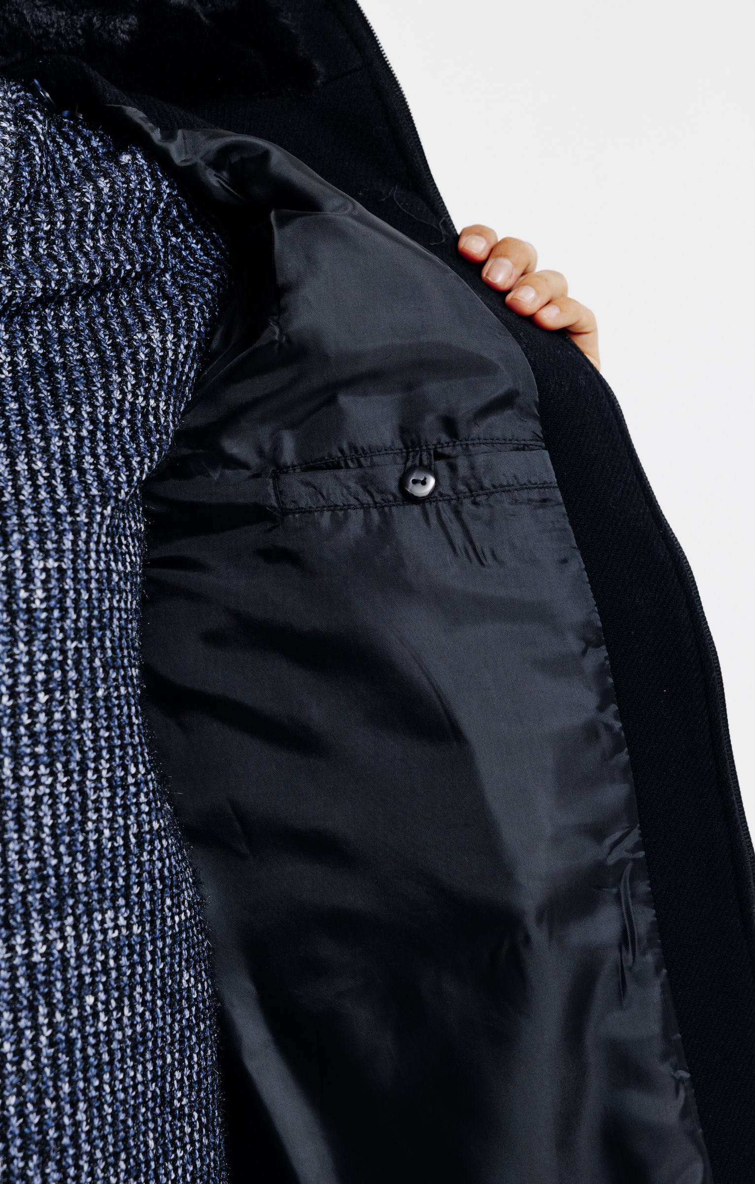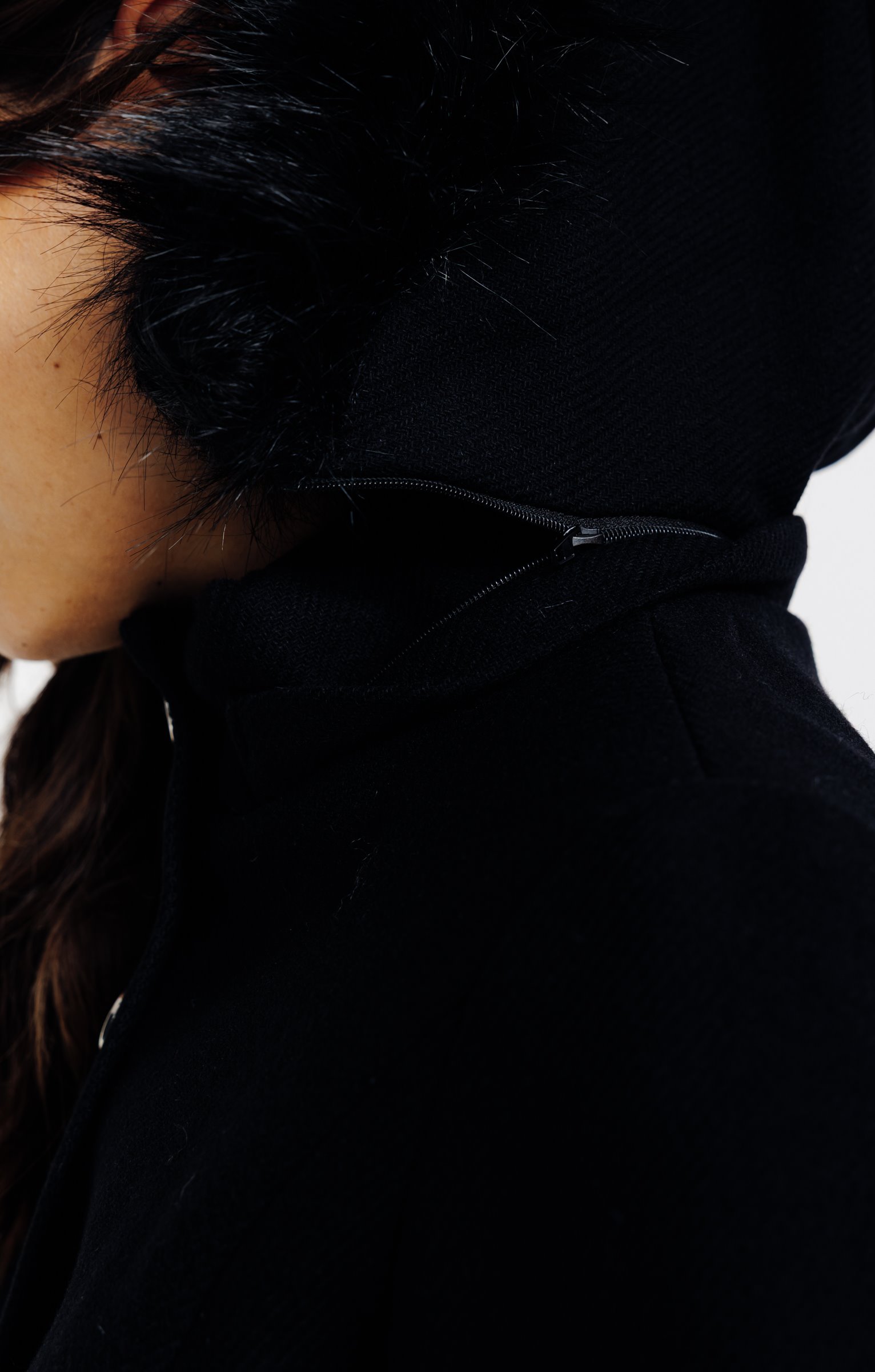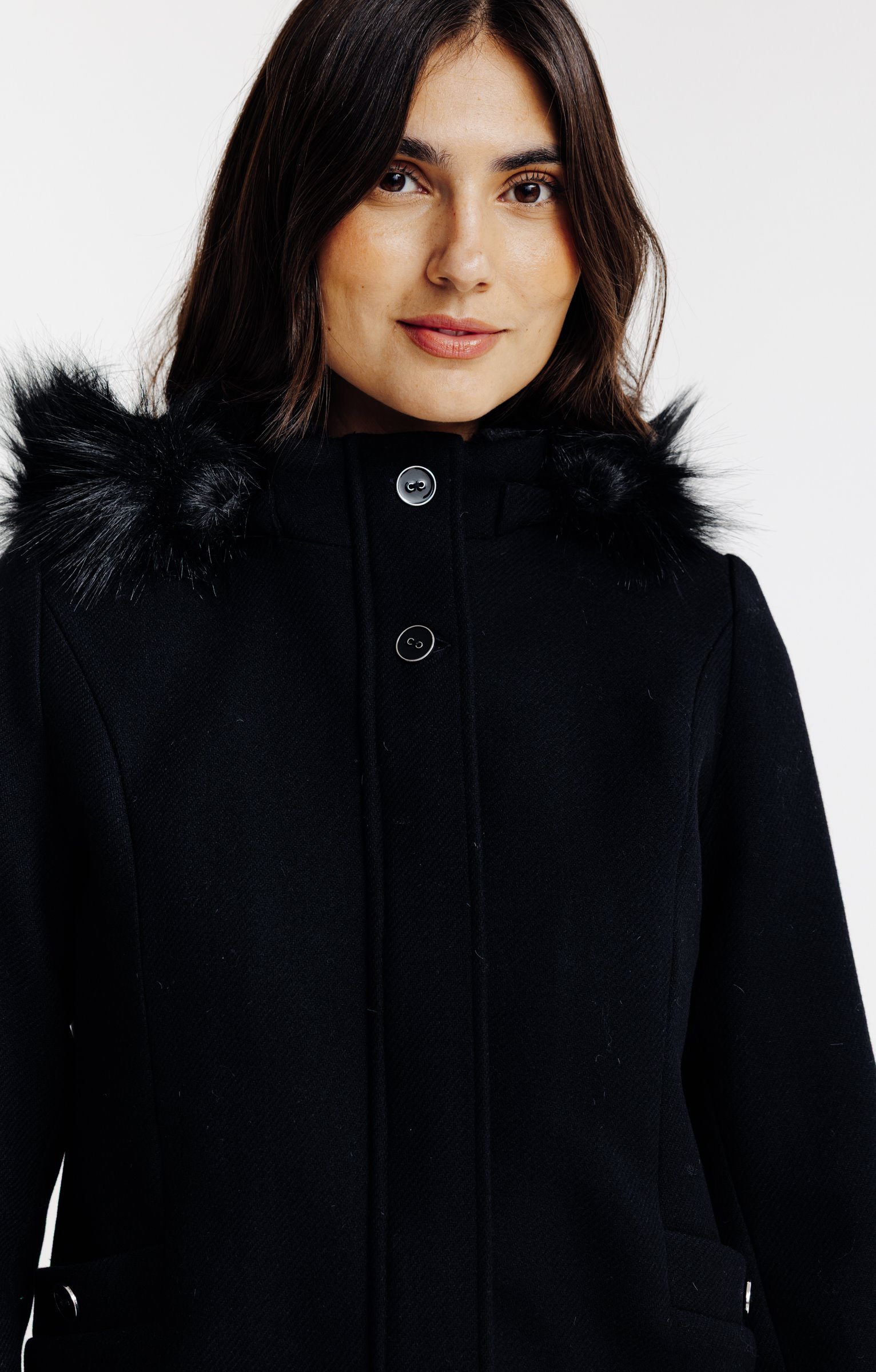 Manteau uni à capuche bordée de fausse fourrure. Coupe droite. Manches longues. Col montant. Fermeture zippée sous patte pressionnée. 2 poches passepoilées boutonnées sur les côtés. Détail de trois boutons décoratifs au bas des manches. Longueur : 76 cm.
