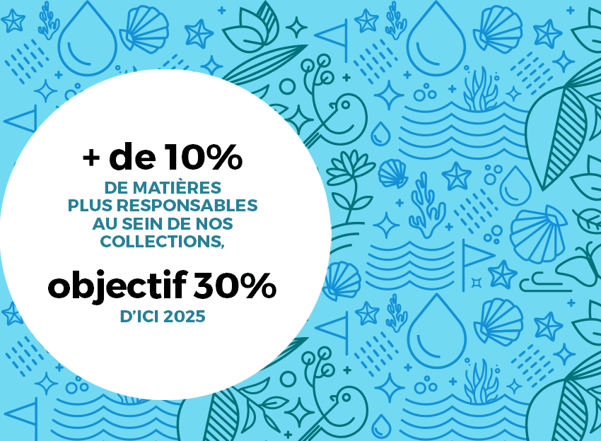Le choix de nos matières premières est une étape fondamentale pour s'assurer de contribuer à préserver les ressources de notre planète et de minimiser notre impact environnemental. C'est pourquoi nous vous proposons des Ecollections pour lesquelles nous avons sélectionné des procédés innovants et matières premières telles que le coton issu de l'argriculture biologique, le lin, le TencelTM, la laine et le polyester recyclés, le jean « waterless »... Concernant les matières premières animales, leur part est limitée dans nos collections : nous ne proposons plus de fourrure, nous limitons l'utilisation du cuir à nos ceintures et à nos gants.