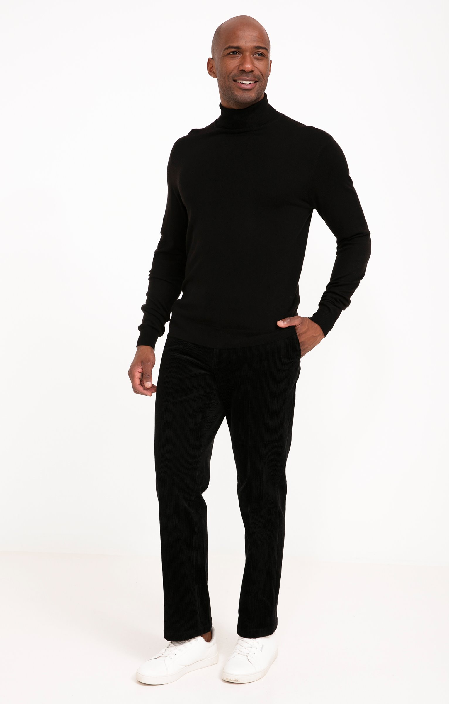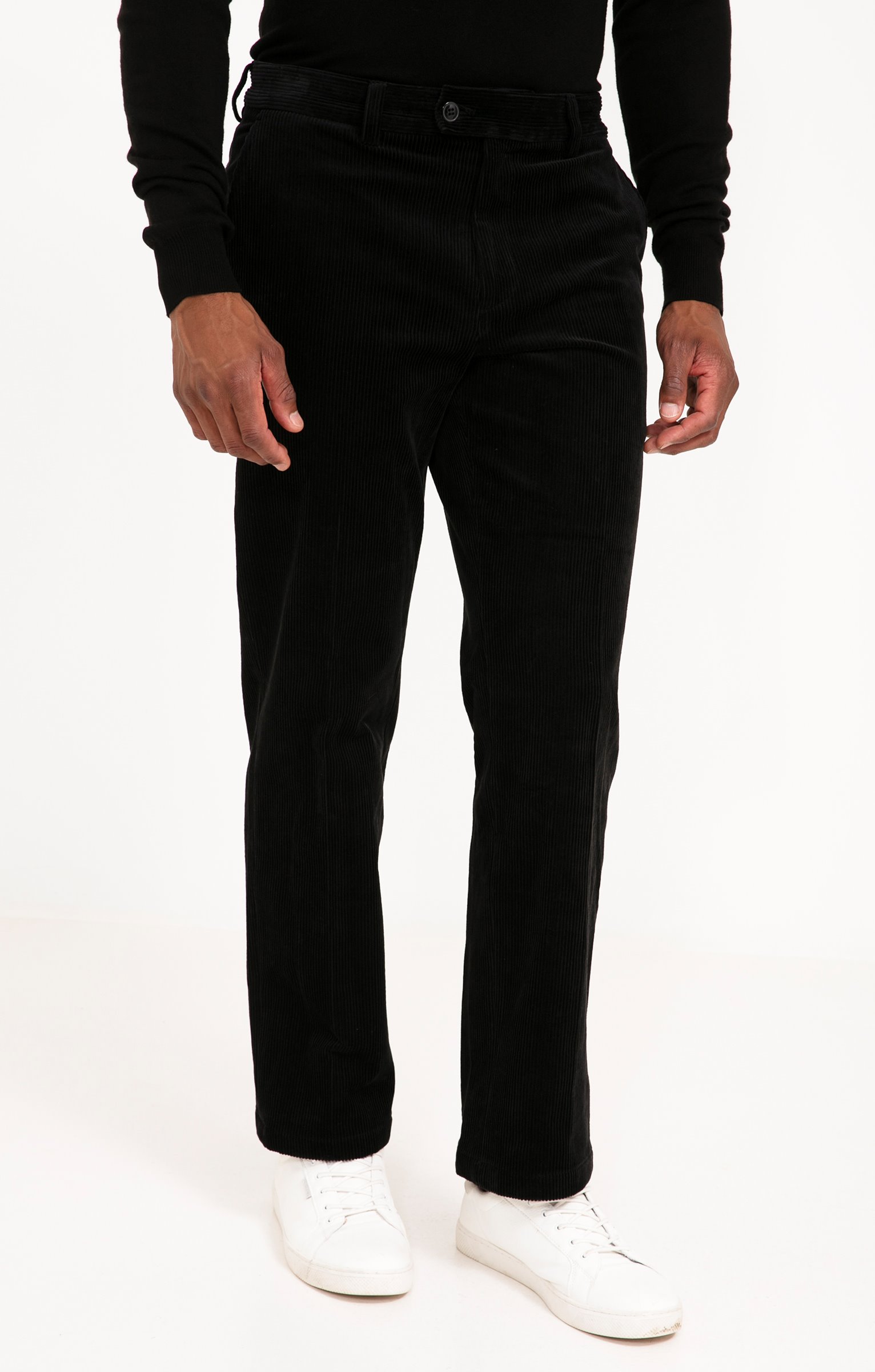 Pantalon confort en velours côtelé extensible et uni. Coupe confort. Fermeture à bouton fantaisie ton sur ton décentré et zip. 2 poches italiennes devant et 2 poches passepoilées boutonnées au dos. Coloris uni. Velours extensible milleraies. Passants à la taille. Pinces d'ajustement au-dessus des poches au dos.