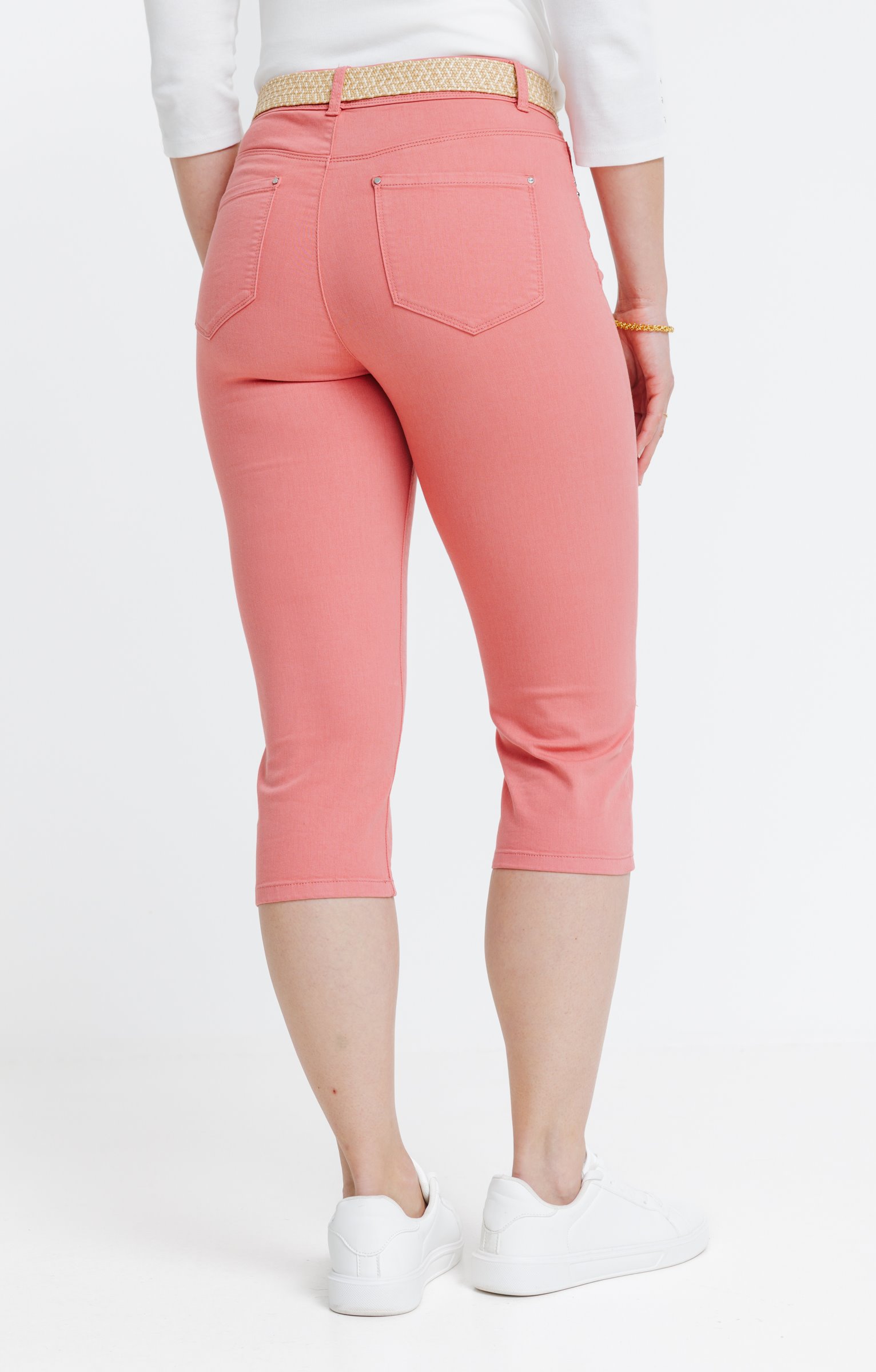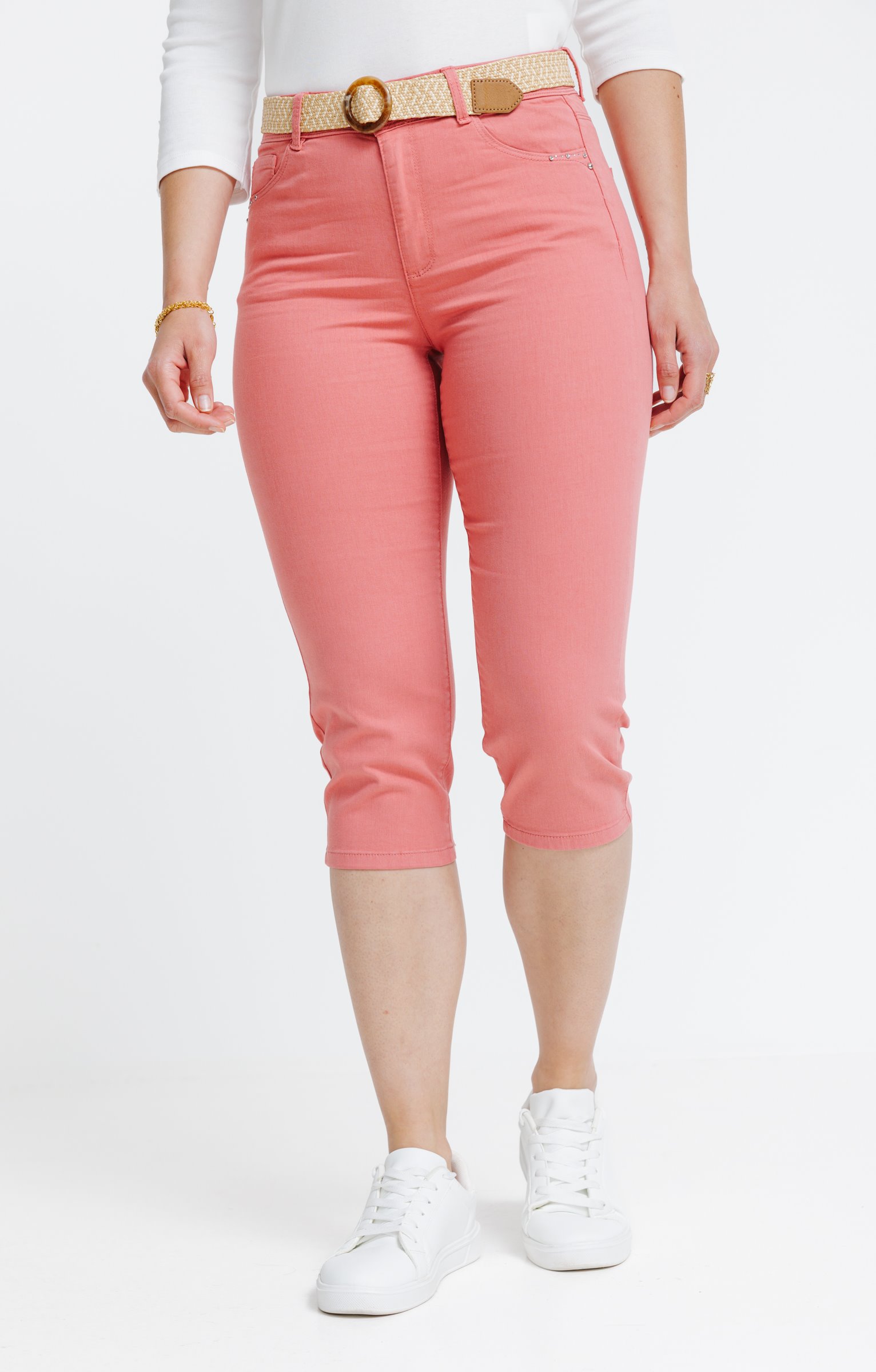 Pantalon corsaire uni. Coupe ajustée avec longueur mi-mollet. Fermeture par zip et bouton. 2 poches italiennes à l'avant et 2 poches plaquées au dos. Détails de surpiqûres ton sur ton. Ceinture tressée avec boucle ronde.