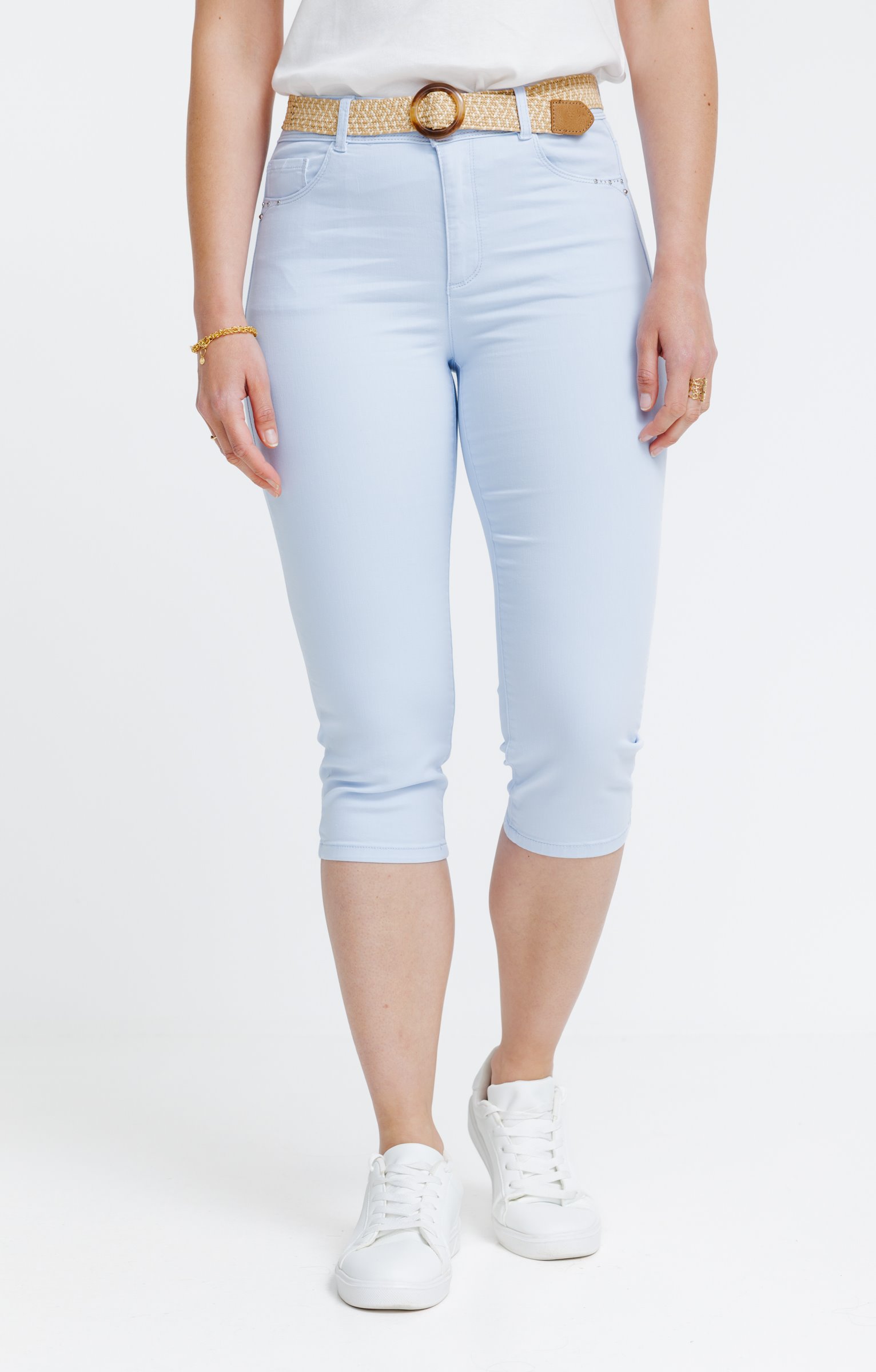 Pantalon corsaire uni. Coupe ajustée avec longueur mi-mollet. Fermeture par zip et bouton. 2 poches italiennes à l'avant et 2 poches plaquées au dos. Détails de surpiqûres ton sur ton. Ceinture tressée avec boucle ronde.