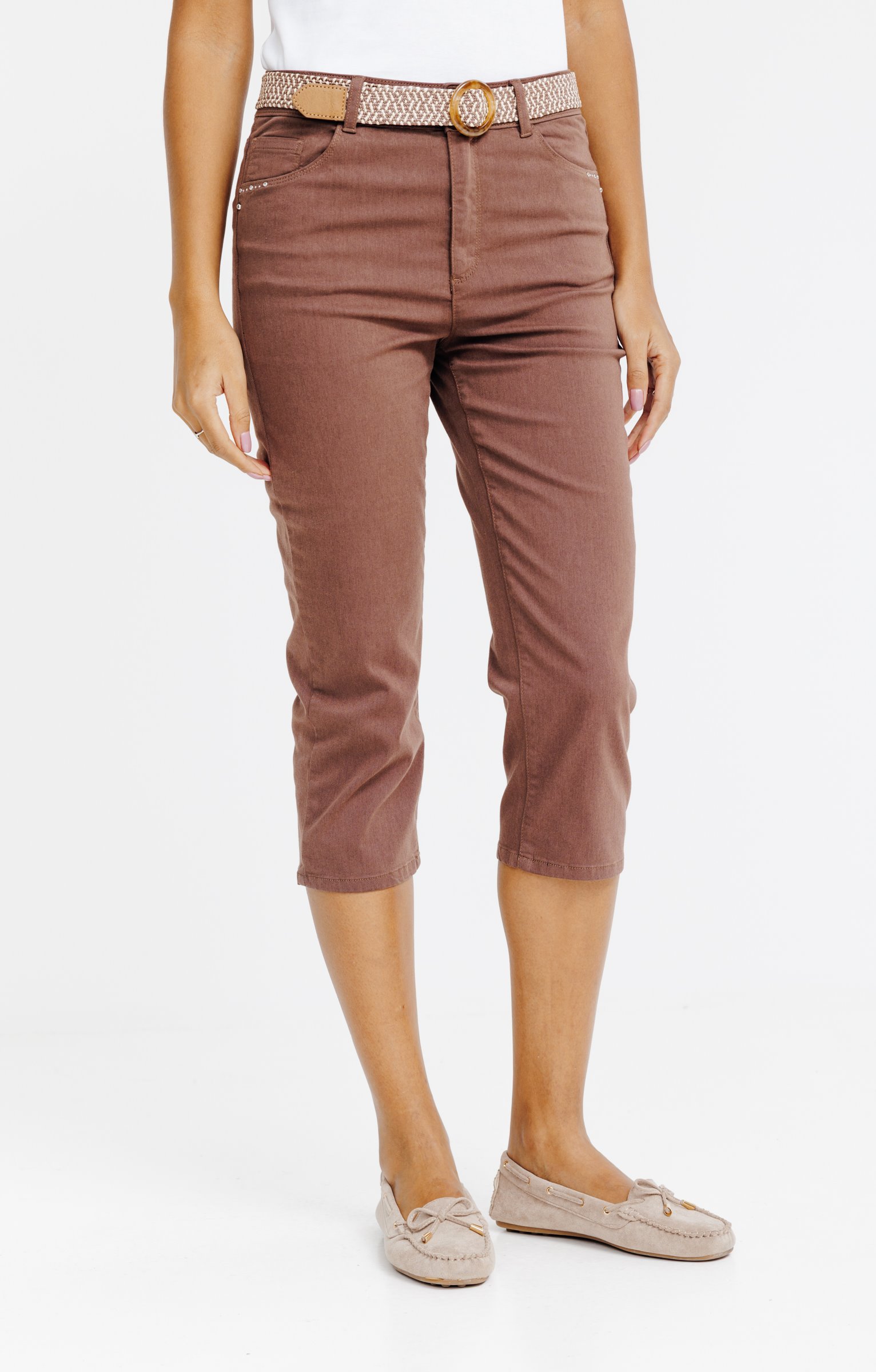 Pantalon corsaire uni. Coupe ajustée avec longueur mi-mollet. Fermeture par zip et bouton. 2 poches italiennes à l'avant et 2 poches plaquées au dos. Détails de surpiqûres ton sur ton. Ceinture tressée avec boucle ronde.