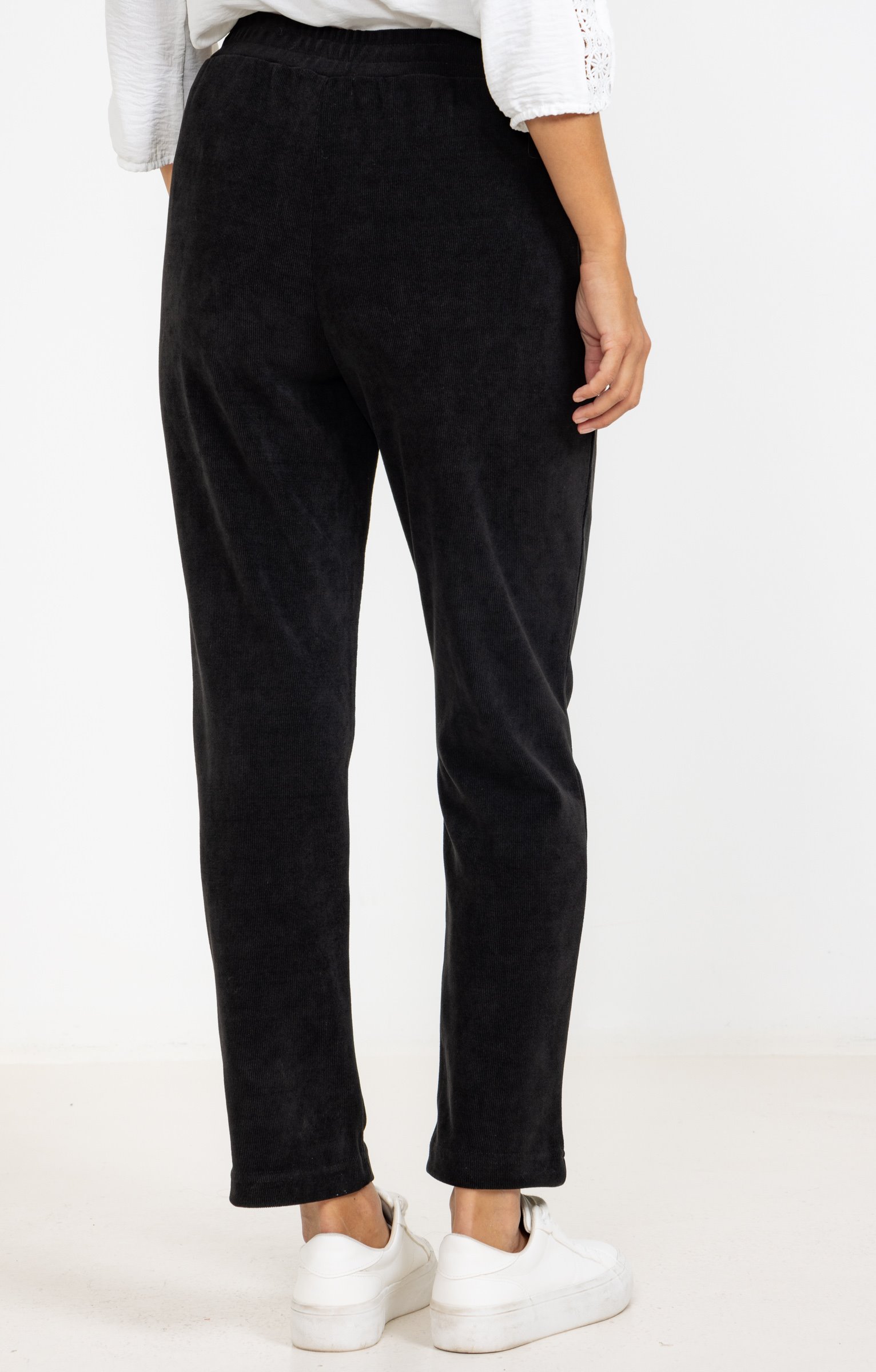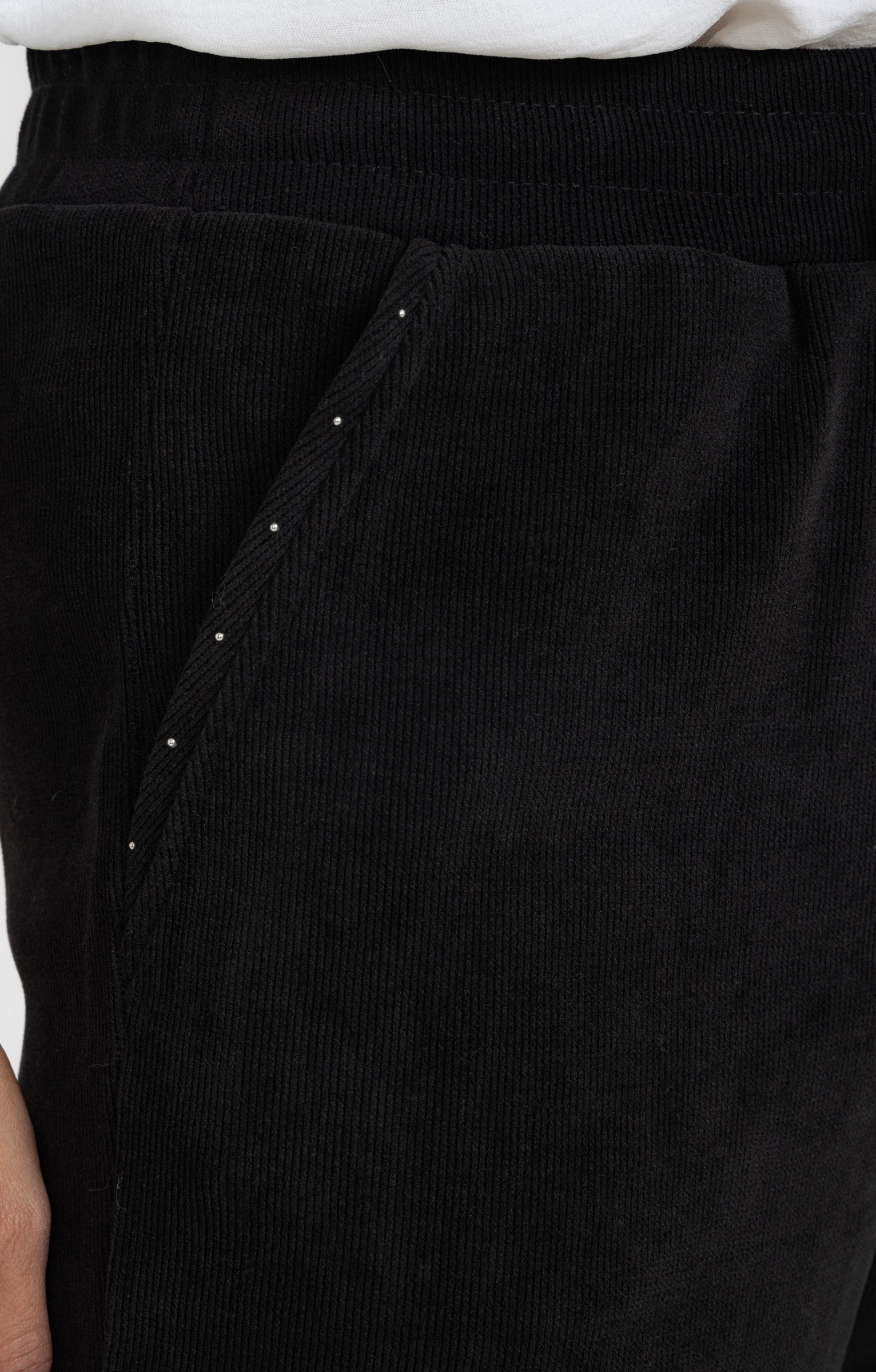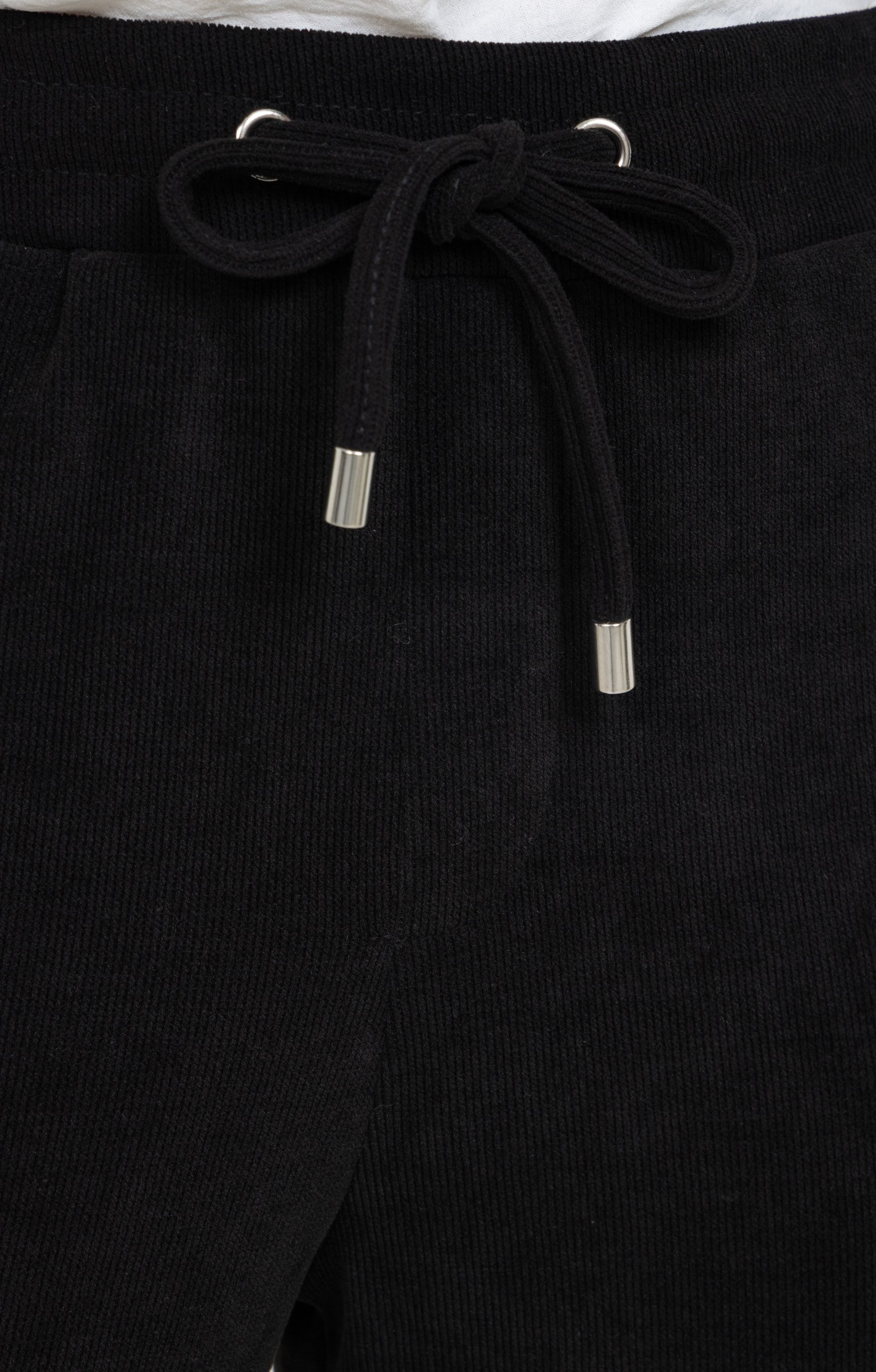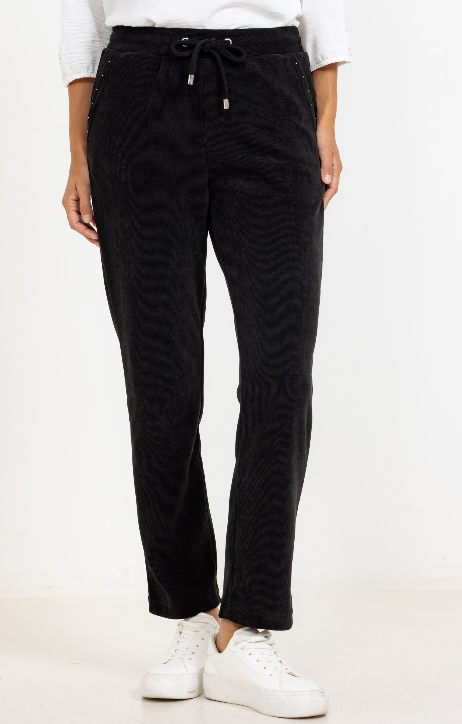 Pantalon droit en maille côtelée. Taille élastiquée avec cordon de serrage à embouts métalliques. 2 poches italiennes ornées de petits rivets métalliques. Longueur cheville. Coloris uni.